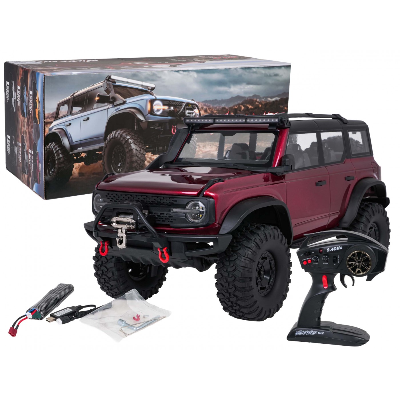 Wilderness to pojazd z hydraulicznym zawieszeniem i dużym kątem skrętu, co umożliwia precyzyjne manewrowanie. Jego konstrukcja została wzbogacona o pełnowymiarowe koło zapasowe oraz metalowe drążki przy wahaczach, co zwiększa stabilność i odporność na uderzenia. Auto porusza się w każdym kierunku, z łatwością pokonując przeszkody, a jego wodoodporność umożliwia jazdę w różnych warunkach pogodowych.