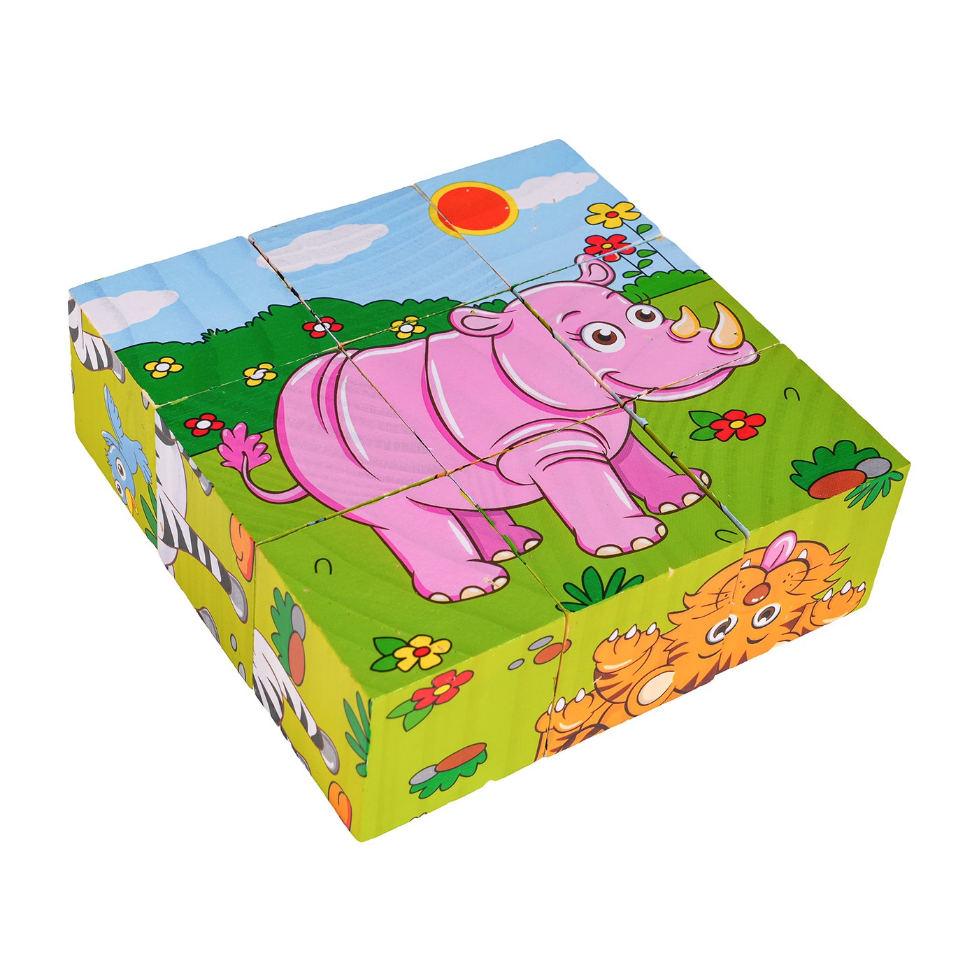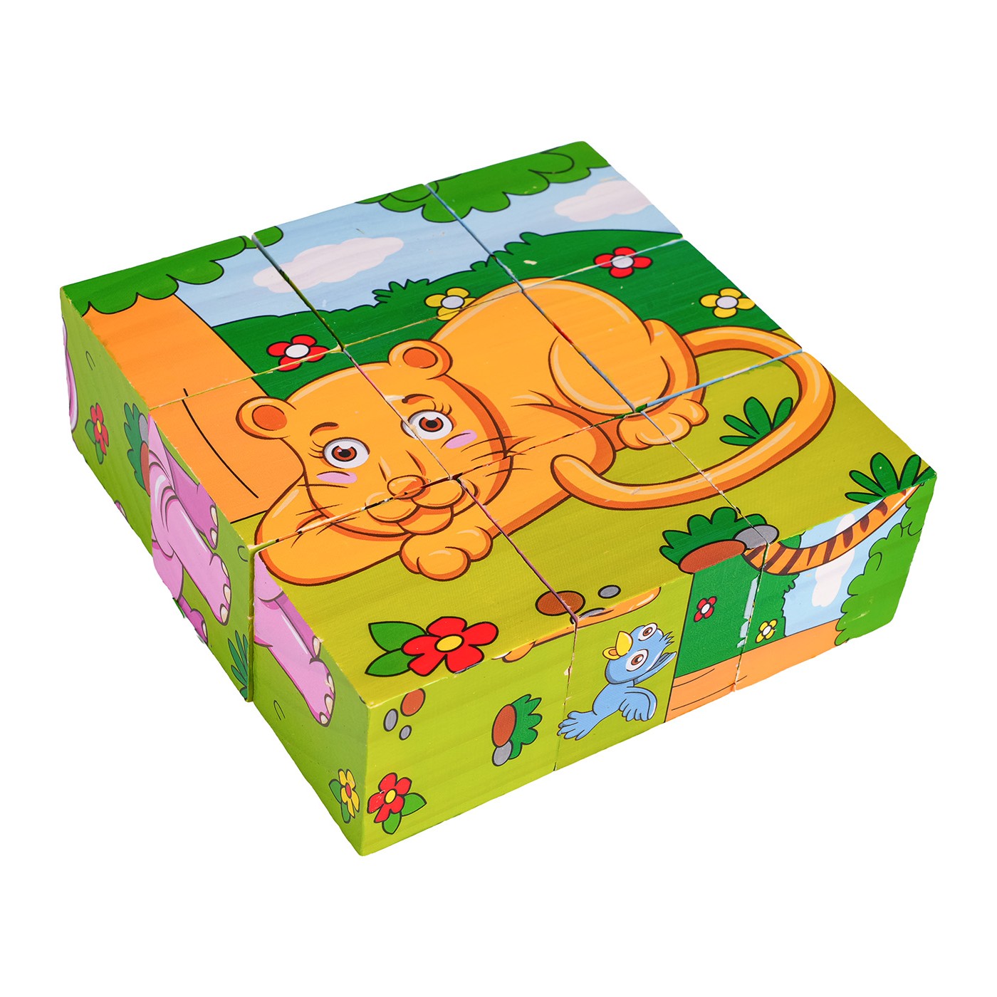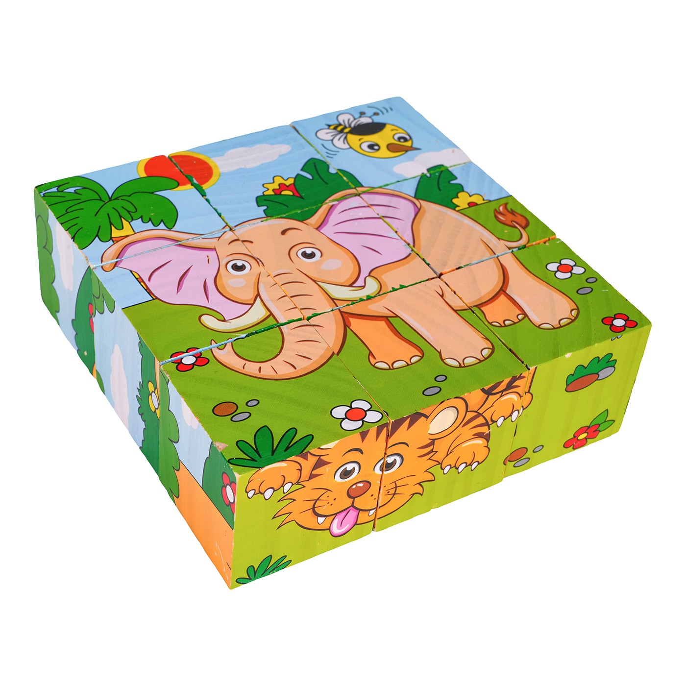 Prezentujemy zestaw 9 drewnianych klocków do układania obrazków dla dzieci od 18-go miesiąca. Na każdym z sześcianów namalowane zostały fragmenty 6 rysunków, które ukażą się w całości po ułożeniu przez malucha.