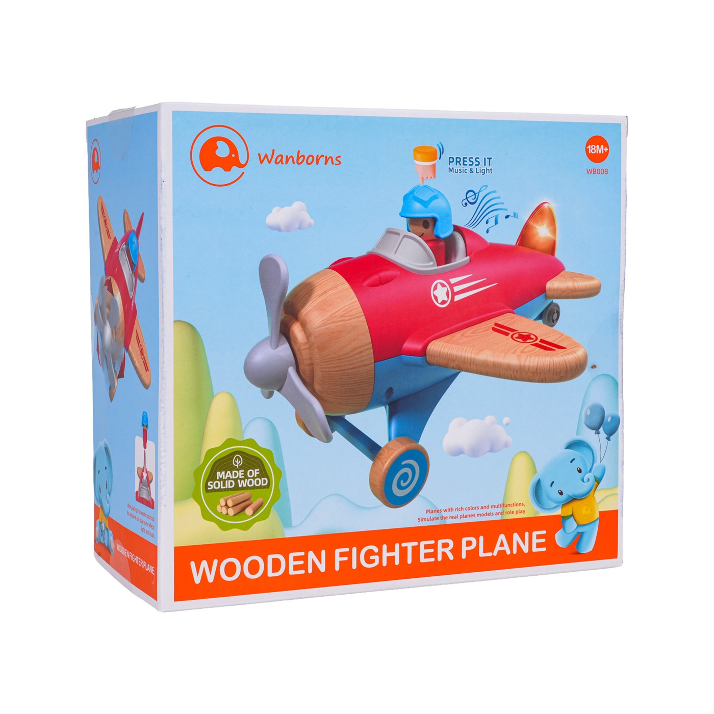 Samolot posiada efektowną funkcję podświetlenia tylnego skrzydła oraz efekty dźwiękowe – po naciśnięciu figurki pilota samolot odtwarza melodię i realistyczne odgłosy startu, co dodaje zabawie dynamiki i autentyczności. Drewniany samolocik ma również ruchome śmigła i kółeczka, które umożliwiają swobodne przesuwanie go po podłodze.