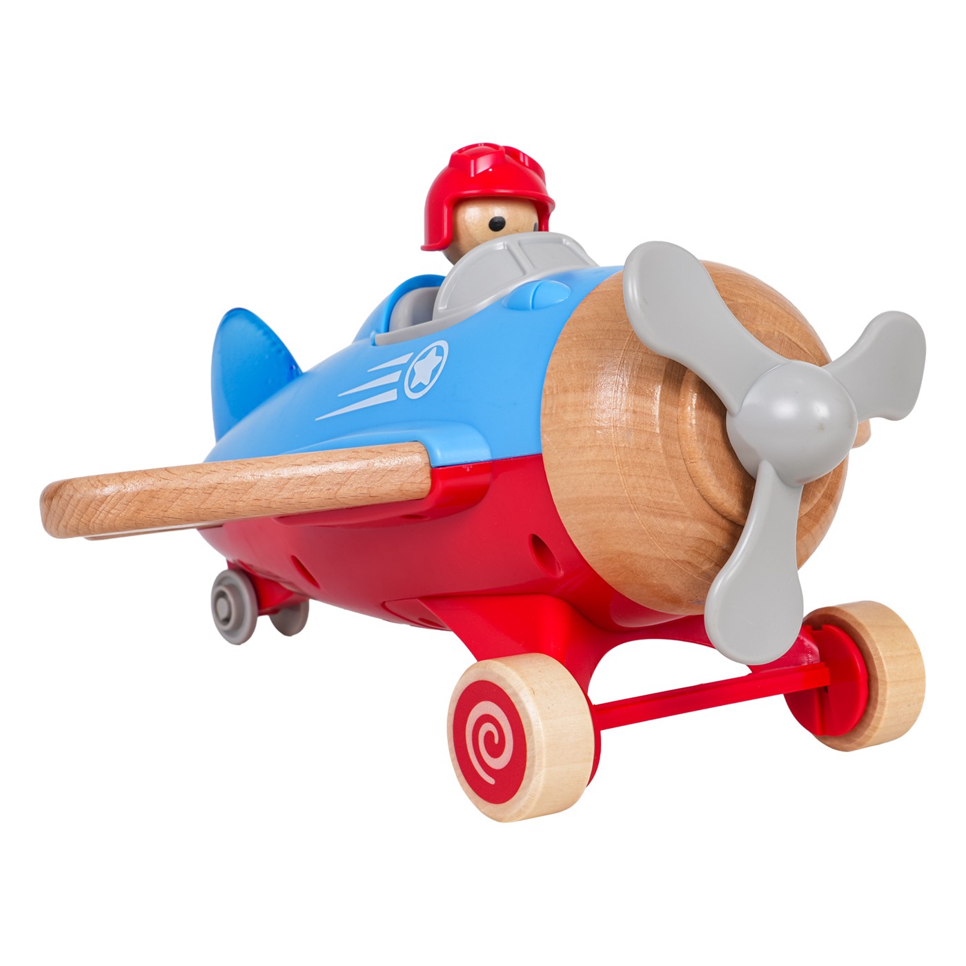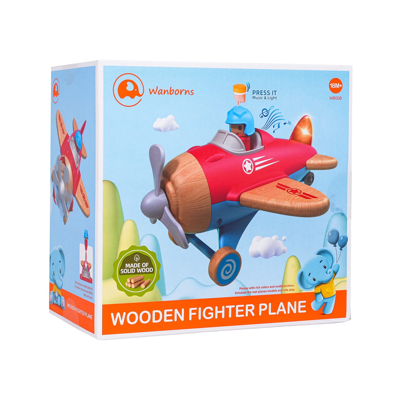 Samolot posiada efektowną funkcję podświetlenia tylnego skrzydła oraz efekty dźwiękowe – po naciśnięciu figurki pilota samolot odtwarza melodię i realistyczne odgłosy startu, co dodaje zabawie dynamiki i autentyczności. Drewniany samolocik ma również ruchome śmigła i kółeczka, które umożliwiają swobodne przesuwanie go po podłodze.