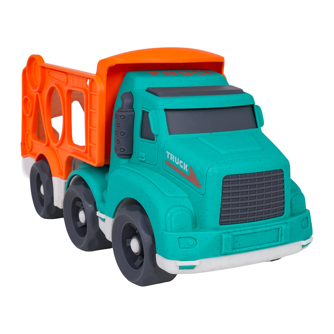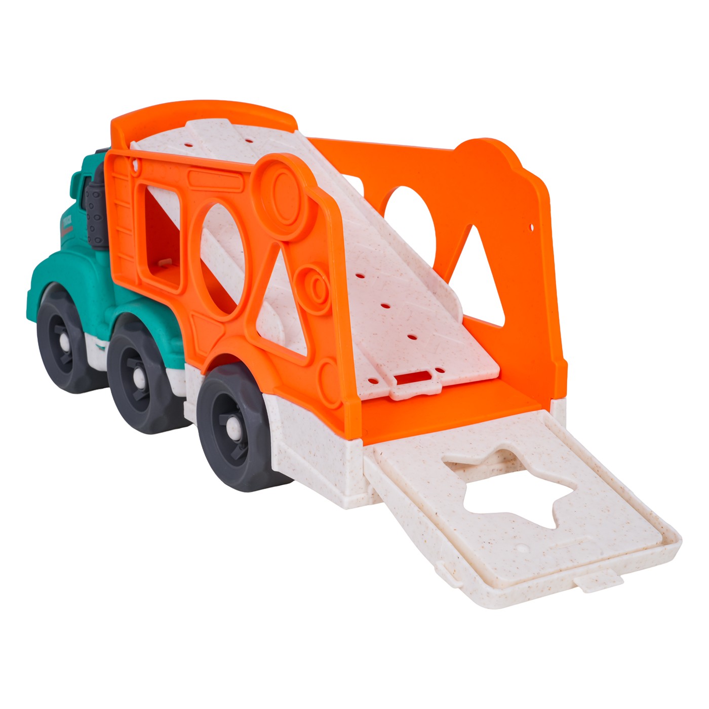 Zestaw został stworzony z ekologicznego tworzywa, które jest nie tylko przyjazne planecie, ale także bardzo trwałe i odporne na intensywną zabawę. Ruchome kółka umożliwiają swobodne przesuwanie pojazdów po różnych powierzchniach, a laweta może być łatwo odpinana i ponownie dołączana do głównego auta. Na bokach naczepy umieszczono funkcjonalny sorter kształtów, który współgra z dołączonymi klocuszkami. Dzięki solidnemu wykonaniu i opływowym kształtom, zabawka zachowuje trwałość nawet przy intensywnym użytkowaniu, nie tracąc przy tym swoich właściwości edukacyjnych i estetycznych.