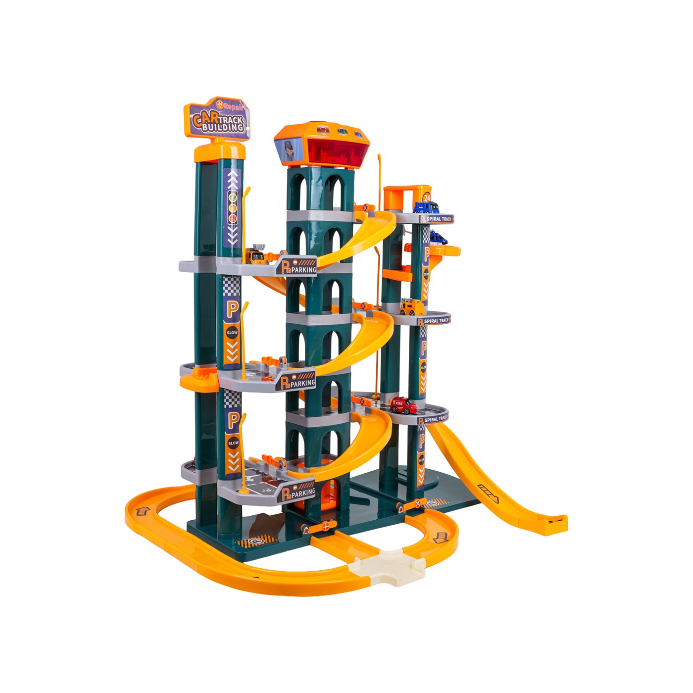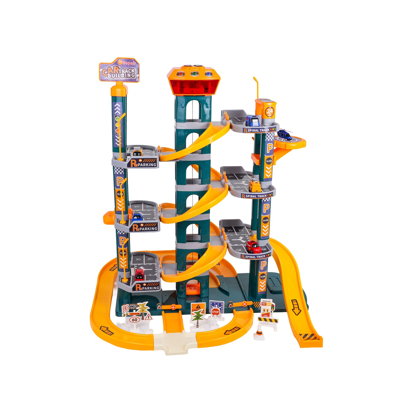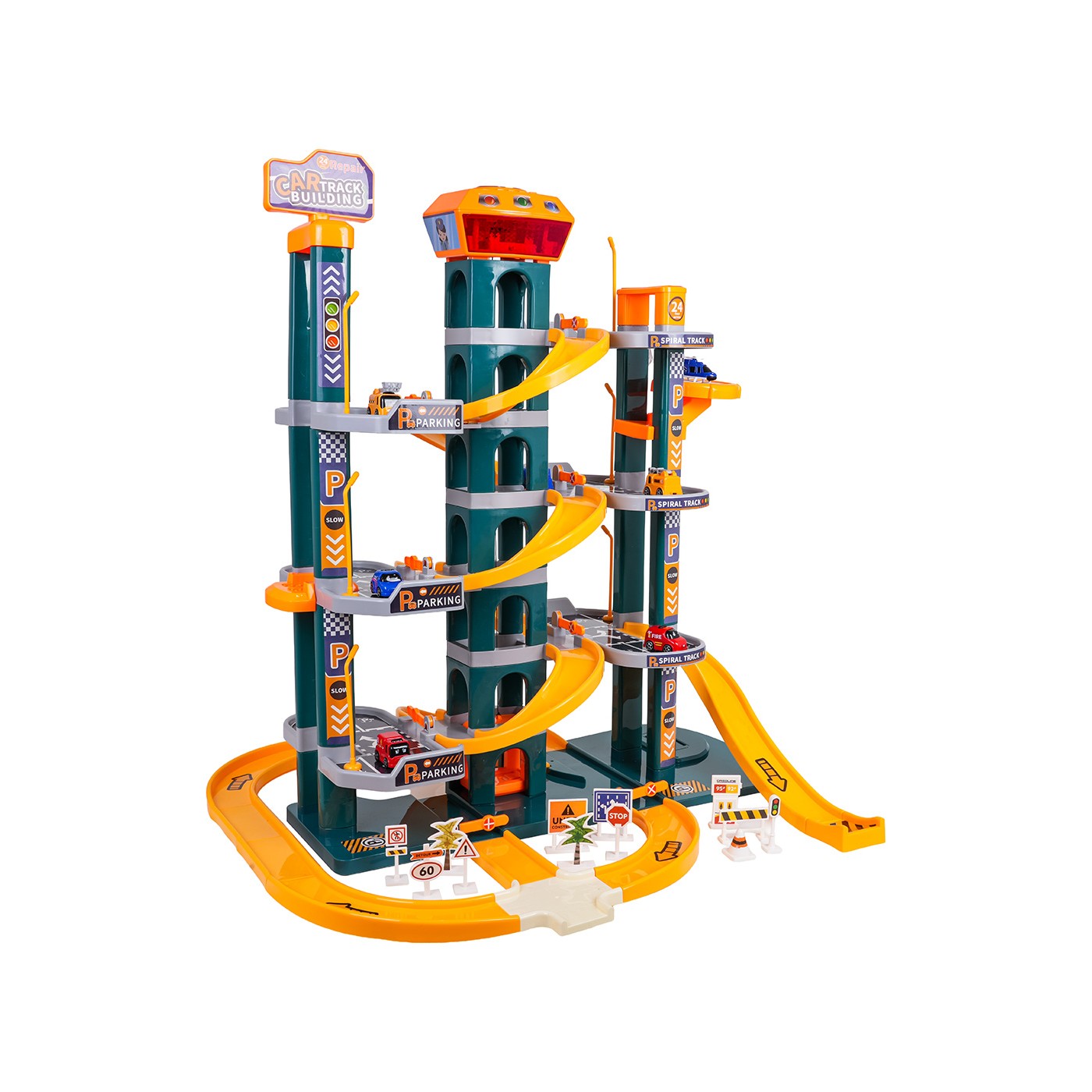 Zjazdy i windy prowadzą do licznych miejsc parkingowych, a zwiększona masa autek na spodzie poprawia ich poślizg i dynamikę jazdy. W komplecie znajdują się aż sześć pojazdów, helikopter, znaki drogowe, szlabany, drzewka i latarnie, które urozmaicają zabawę i pozwalają tworzyć własne miejskie scenariusze.