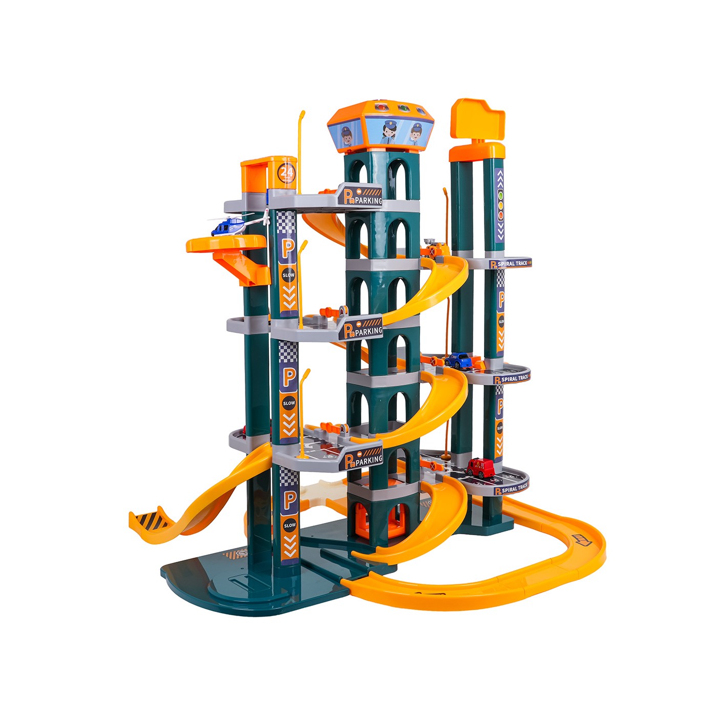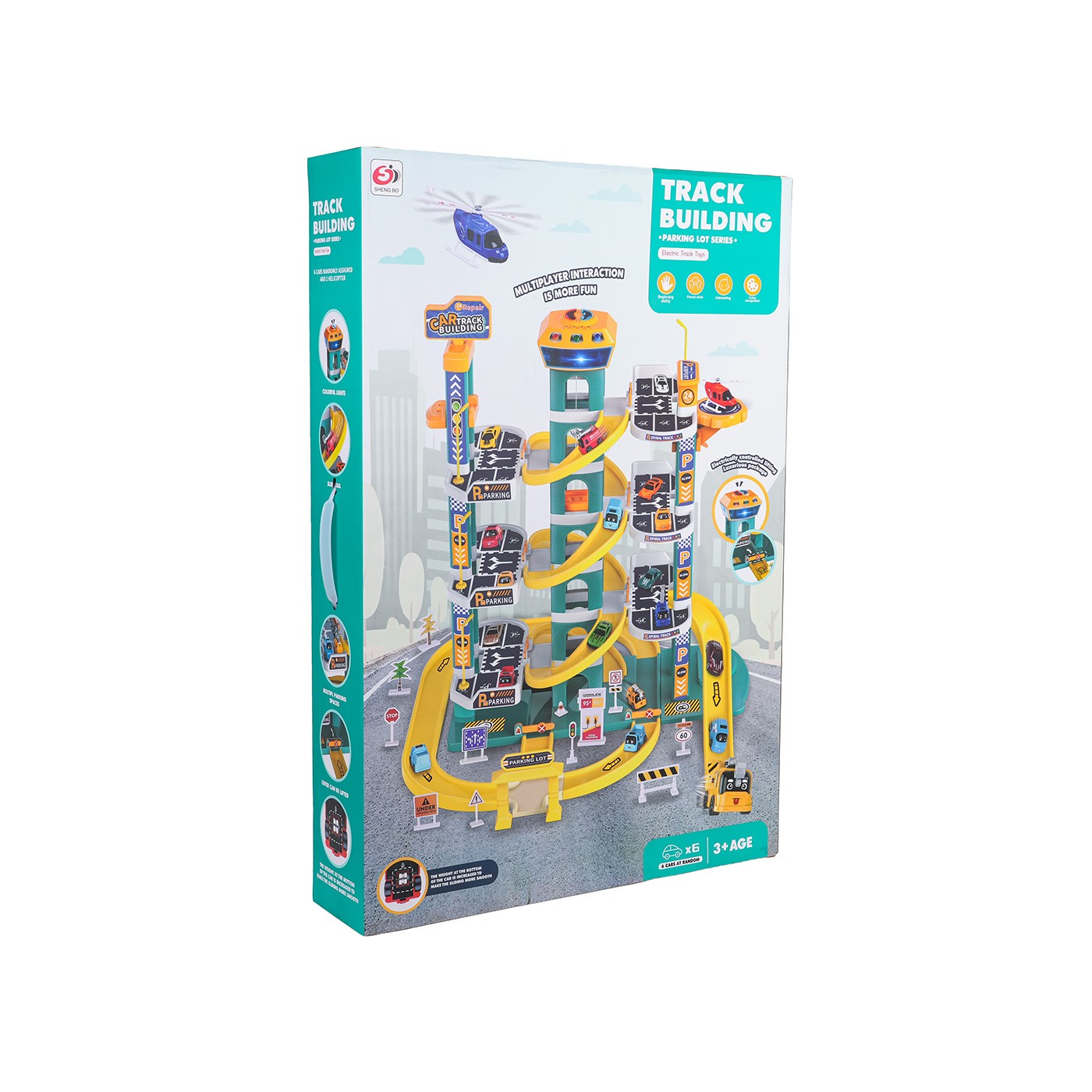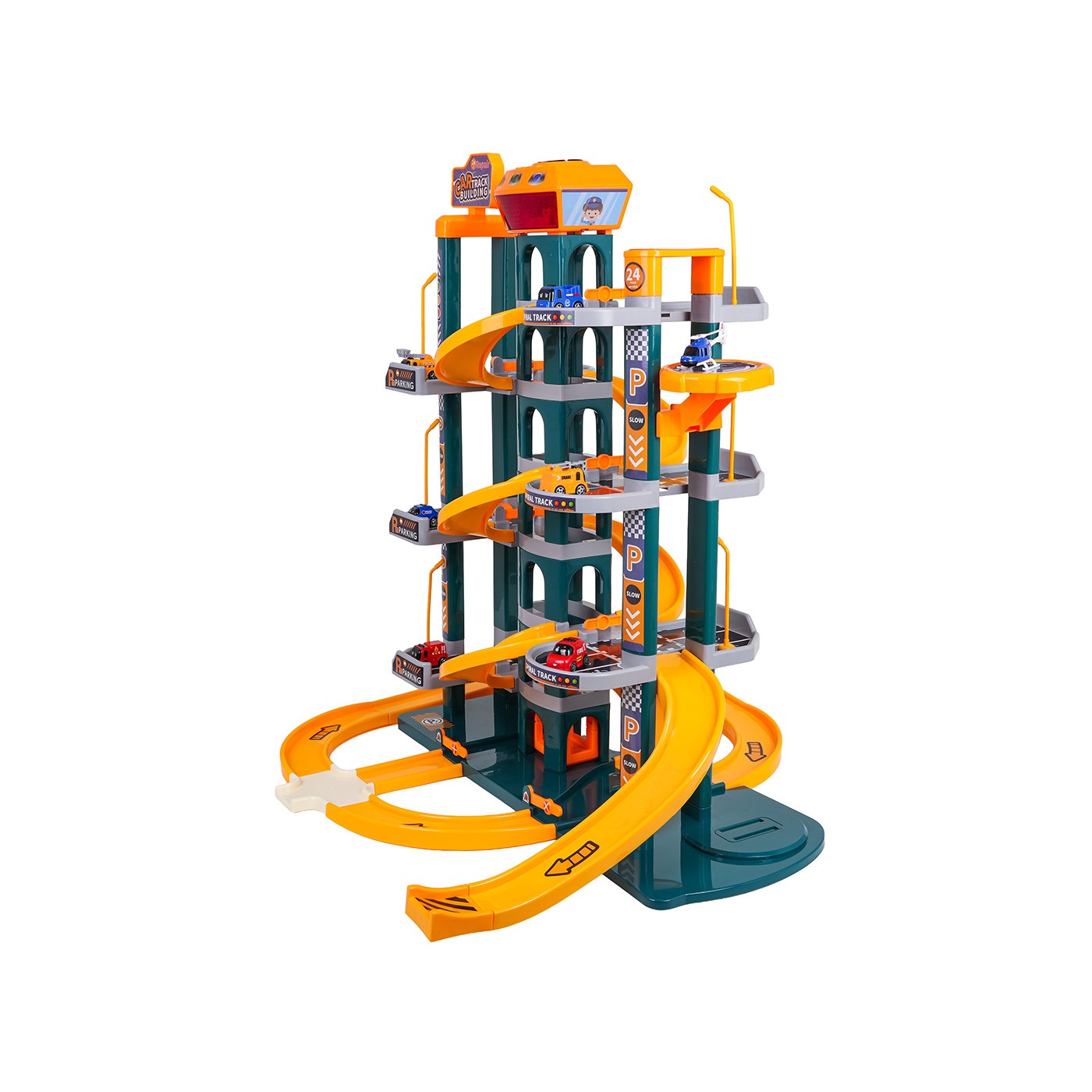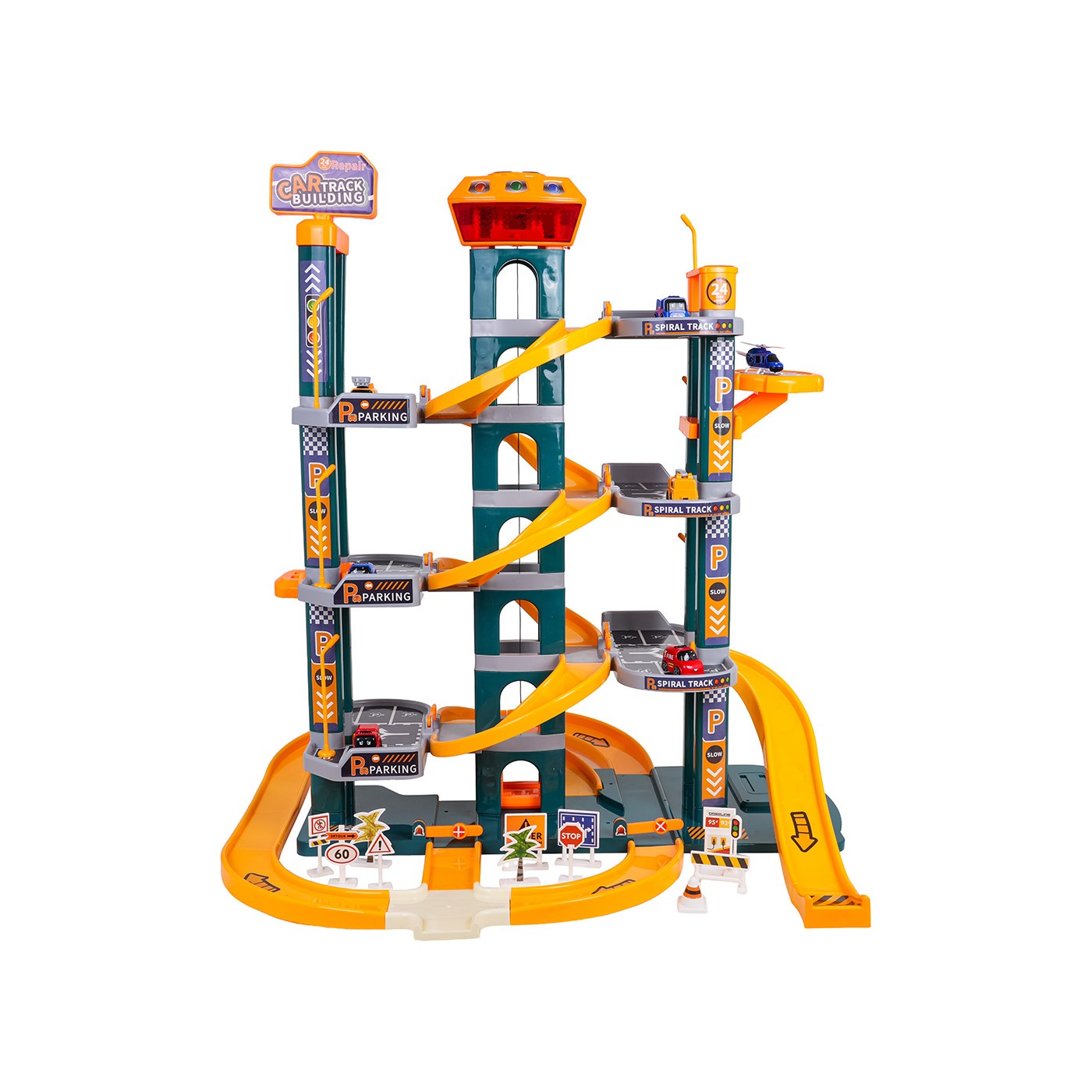 Zjazdy i windy prowadzą do licznych miejsc parkingowych, a zwiększona masa autek na spodzie poprawia ich poślizg i dynamikę jazdy. W komplecie znajdują się aż sześć pojazdów, helikopter, znaki drogowe, szlabany, drzewka i latarnie, które urozmaicają zabawę i pozwalają tworzyć własne miejskie scenariusze.