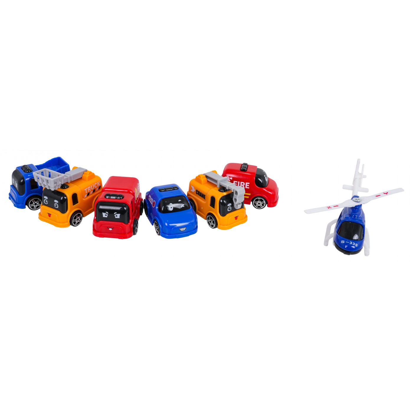 - 6 autek (2 dźwigi, 2 straże pożarne, policja, pomoc drogowa) – każdy ok. 5 cm x 3,5 cm x 3 cm,