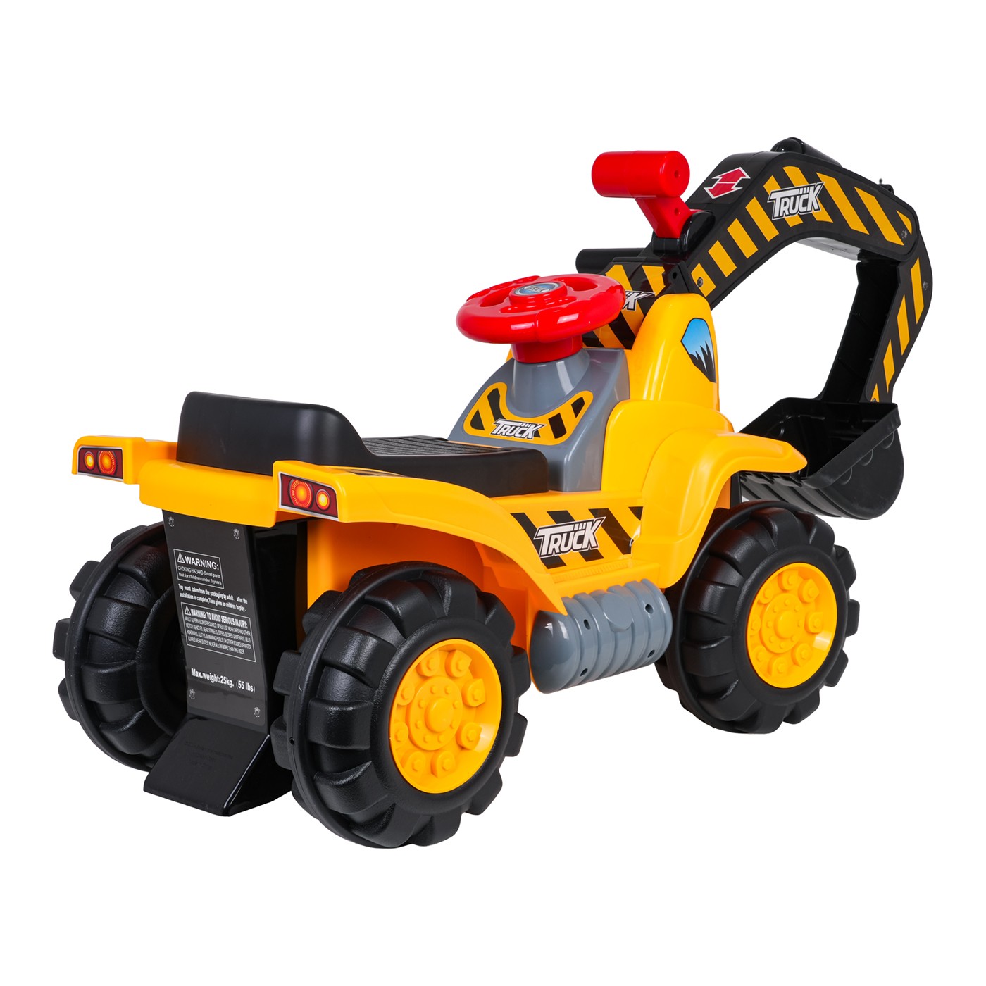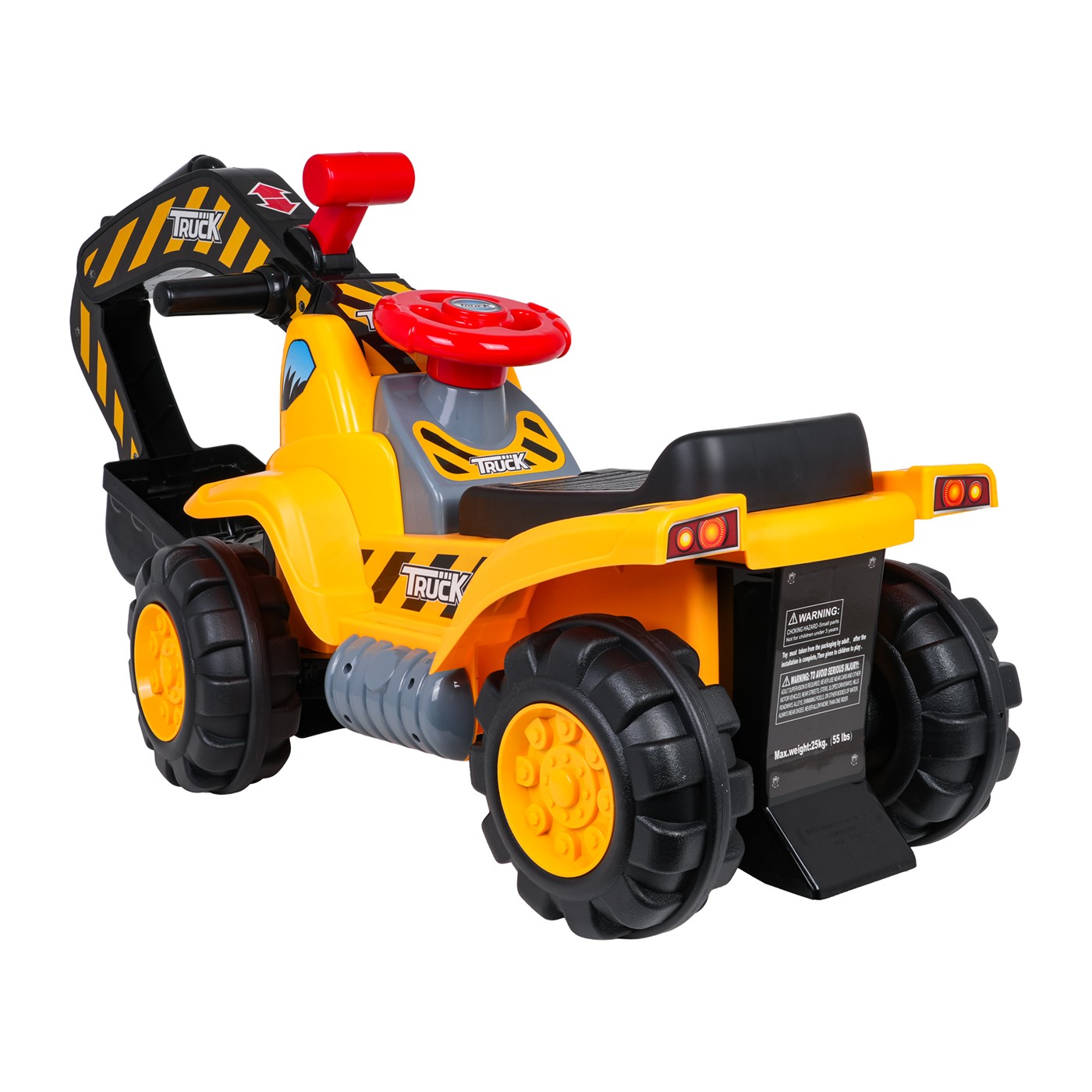 Pojazd został wykonany z wysokiej jakości, bezpiecznych materiałów, odpornych na codzienne użytkowanie. Wyposażony jest w ruchomą łyżkę sterowaną dźwignią, skrętną kierownicę i duże, skrętne koła, które umożliwiają swobodne manewrowanie w różnych kierunkach.