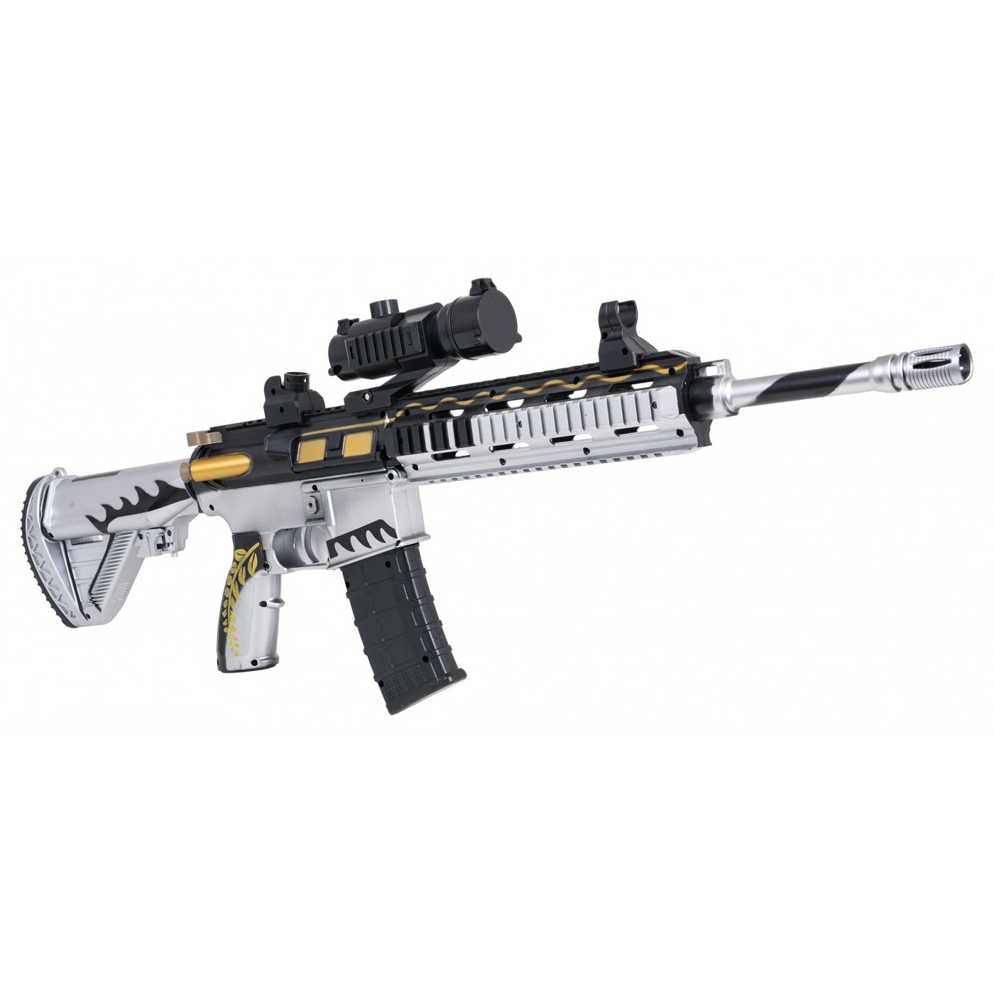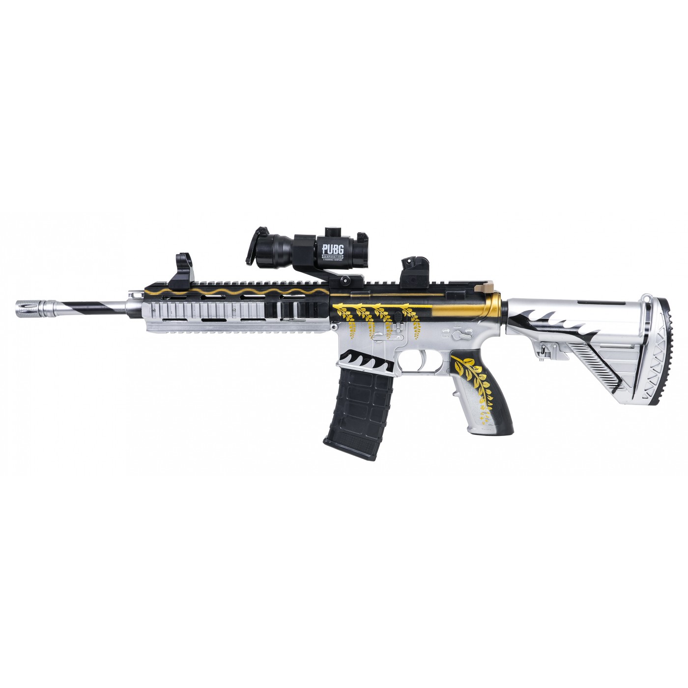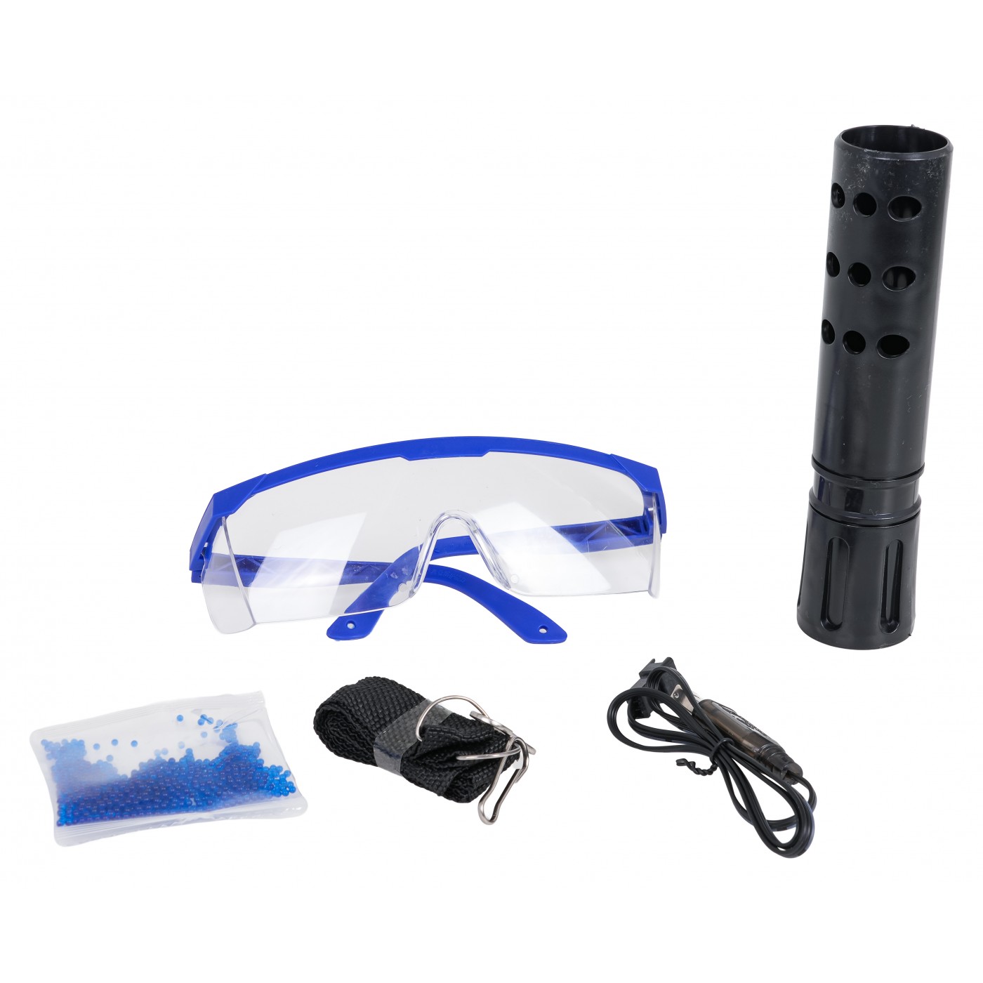 Zestaw zawiera wszystko, co potrzebne do rozpoczęcia gry: okulary ochronne, tłumik, magazynek, pasek na ramię oraz saszetkę z kulkami wodnymi. Do działania karabinu potrzebny jest hydrożel – dołączone kulki wystarczy zalać wodą i pozostawić na kilka godzin, by nabrały odpowiedniego rozmiaru (7–8 mm). Zabawka została wyposażona w celownik optyczny ze szkłem powiększającym oraz pokrętło do regulacji odległości. Karabin zasilany jest akumulatorem 7,4V, ładowanym za pomocą kabla USB (w zestawie).
