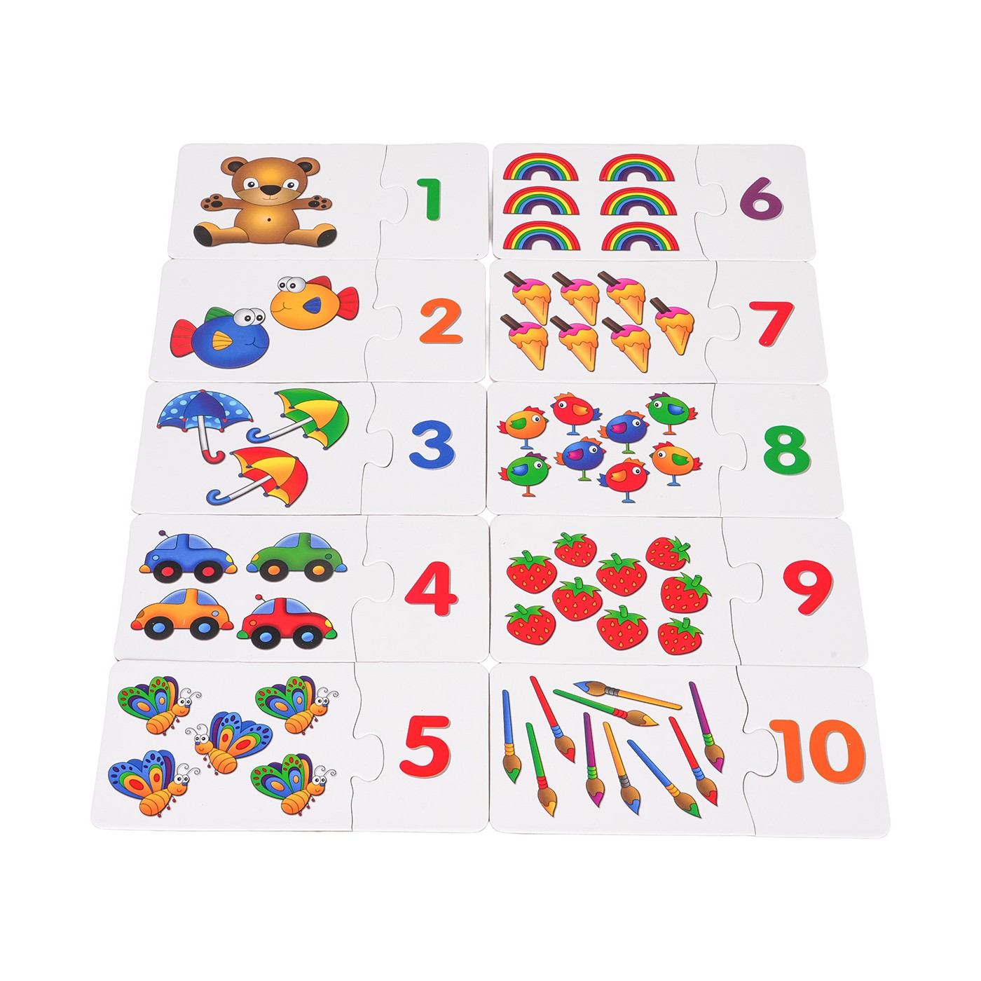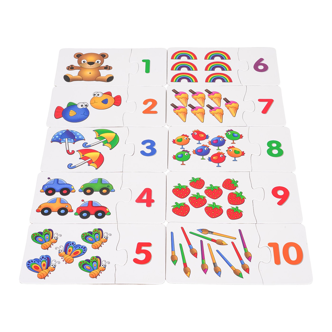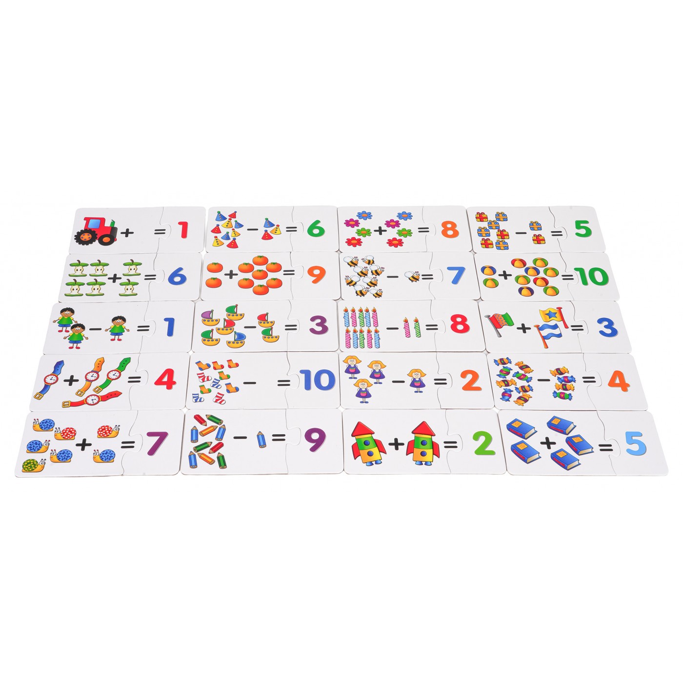 Elementy gry wykonano z solidnego kartonu o gładkiej, bezpiecznej powierzchni, która dobrze znosi intensywne użytkowanie. Żywe kolory i wyraźne kształty ułatwiają rozpoznawanie obrazków i cyfr, a dopasowanie puzzli wymaga od dziecka skupienia oraz logicznego myślenia. Zadania opierają się na prostych działaniach w zakresie od 1 do 10, co czyni zestaw idealnym narzędziem do pierwszych kontaktów z matematyką. Każda plansza angażuje obie półkule mózgu – jedna strona uczy rozumienia ilości przez obraz, druga wspiera rozpoznawanie symboli liczbowych.