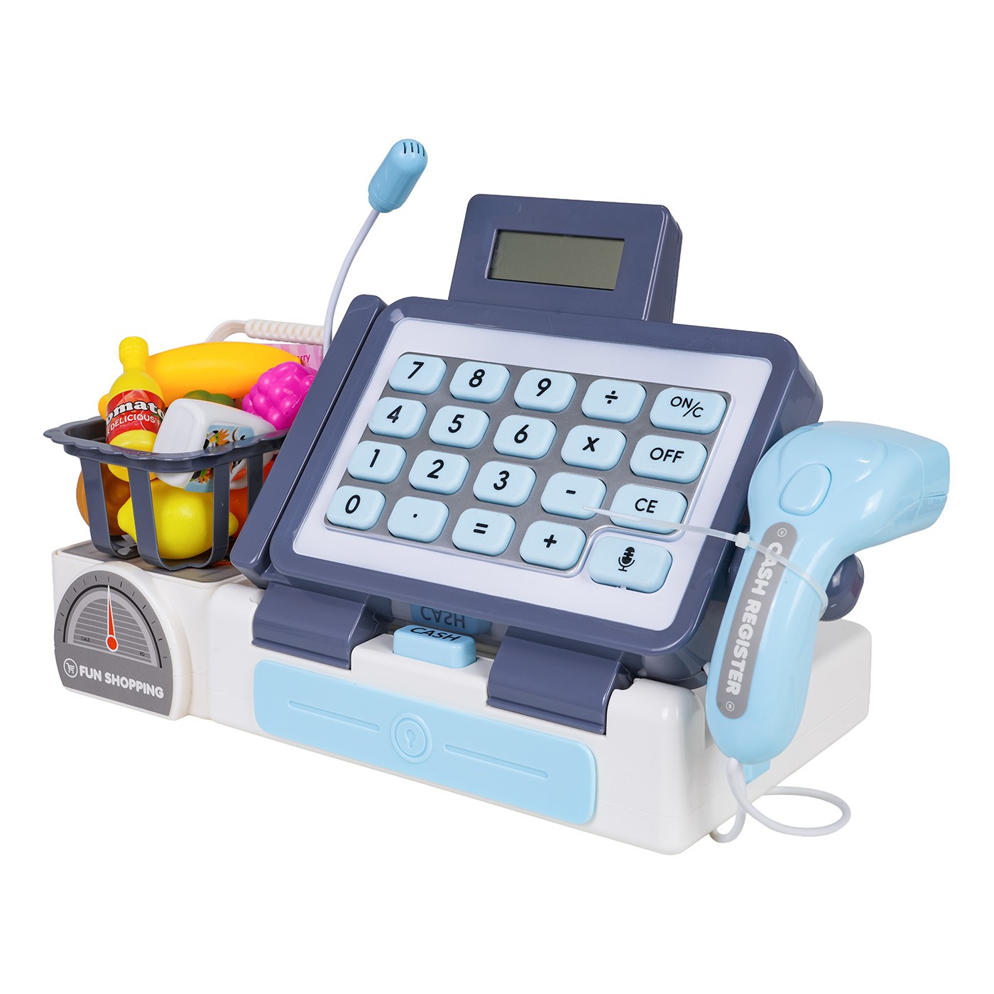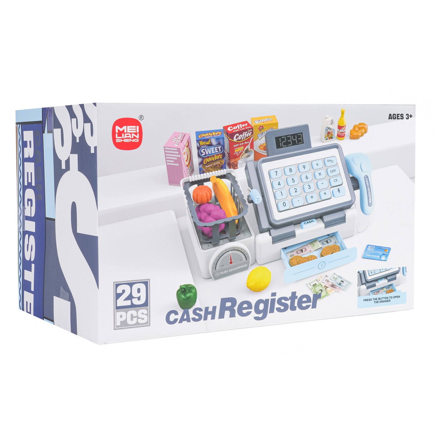 Zestaw zawiera aż 29 elementów, w tym działający kalkulator z efektami dźwiękowymi, skaner z migającym światełkiem i dźwiękiem, atrapę wagi, otwieraną szufladkę na pieniądze oraz mikrofon, który odgrywa rolę interkomu. Do zestawu dołączono także koszyk zakupowy z atrapami produktów spożywczych, co umożliwia dziecku pełne odtworzenie scenki zakupowej.