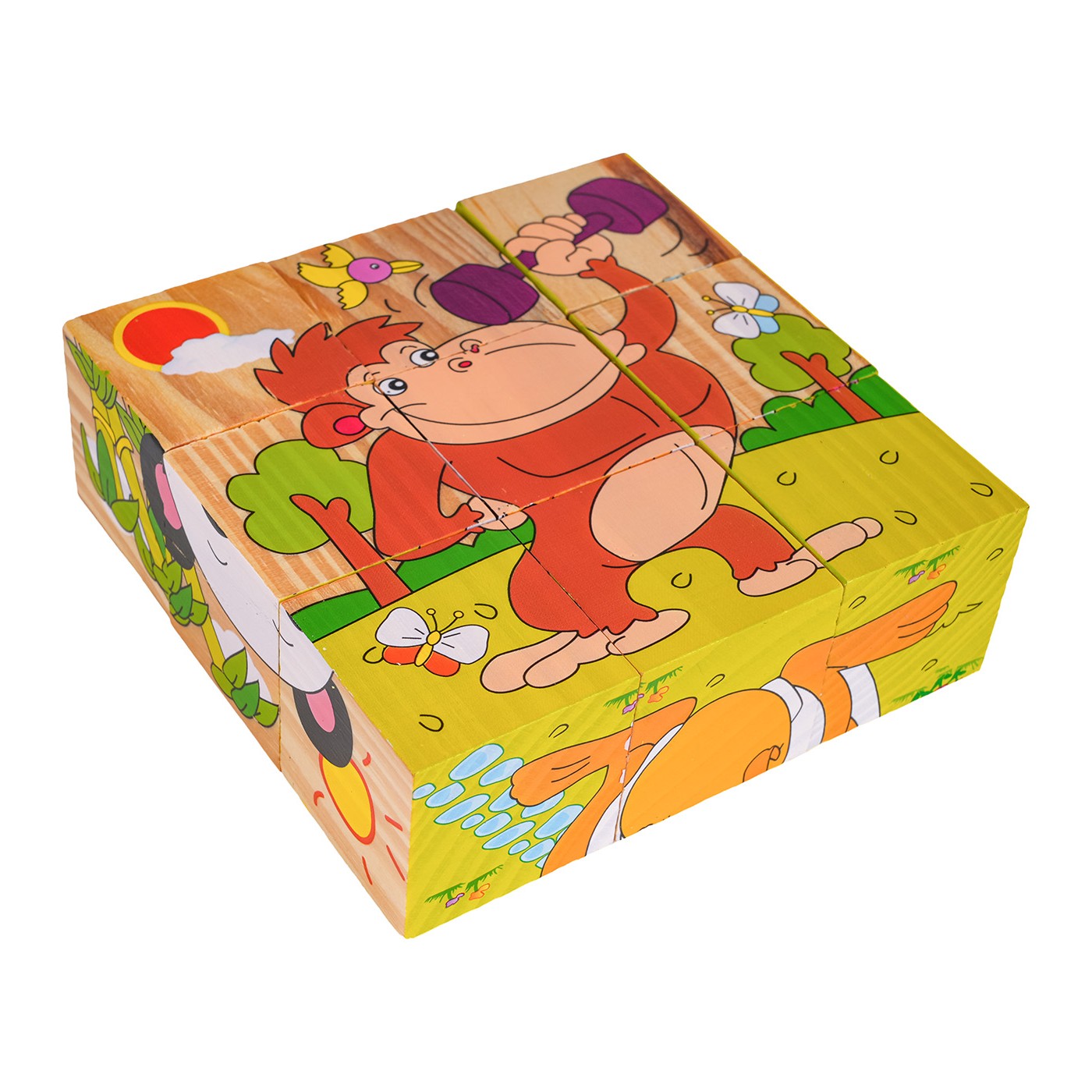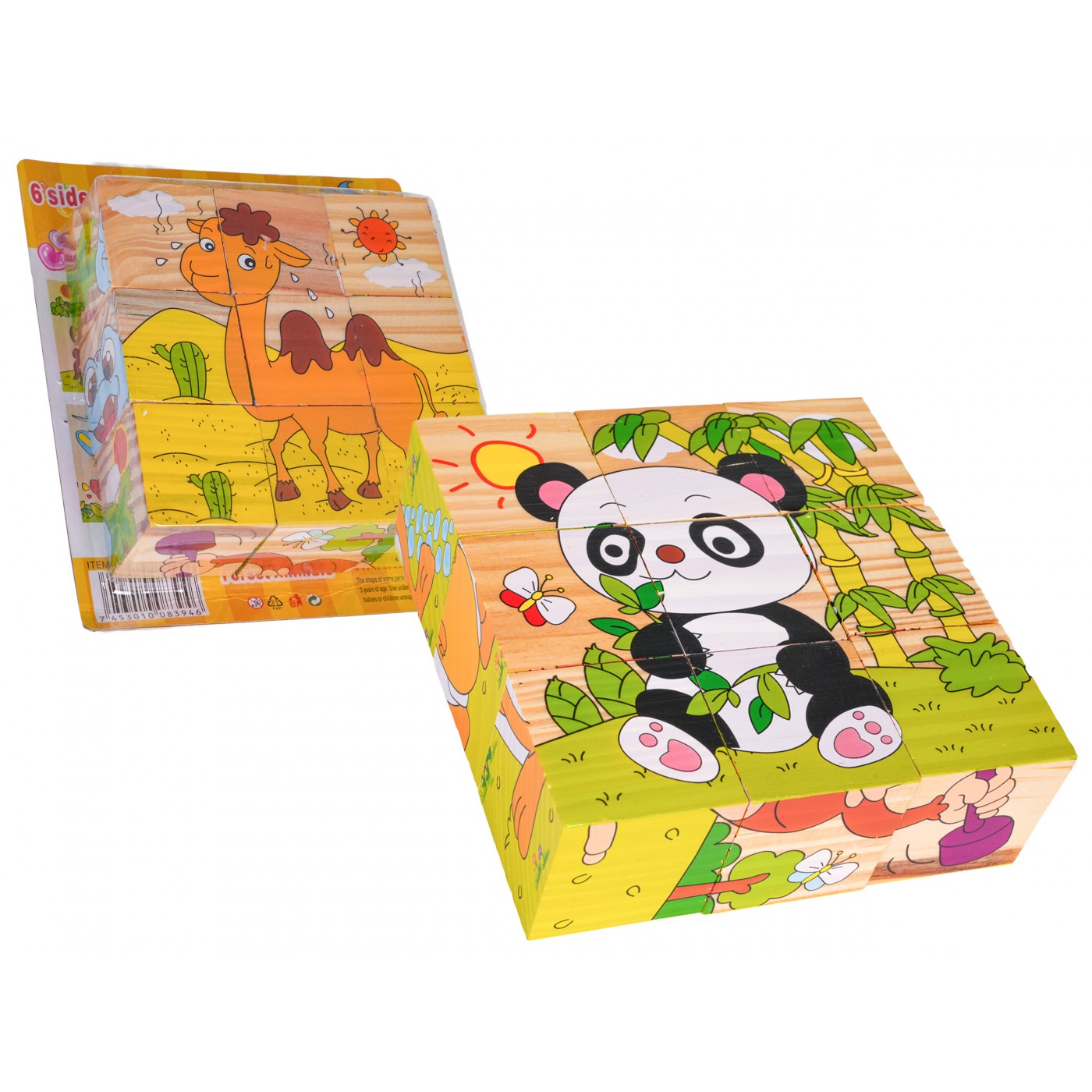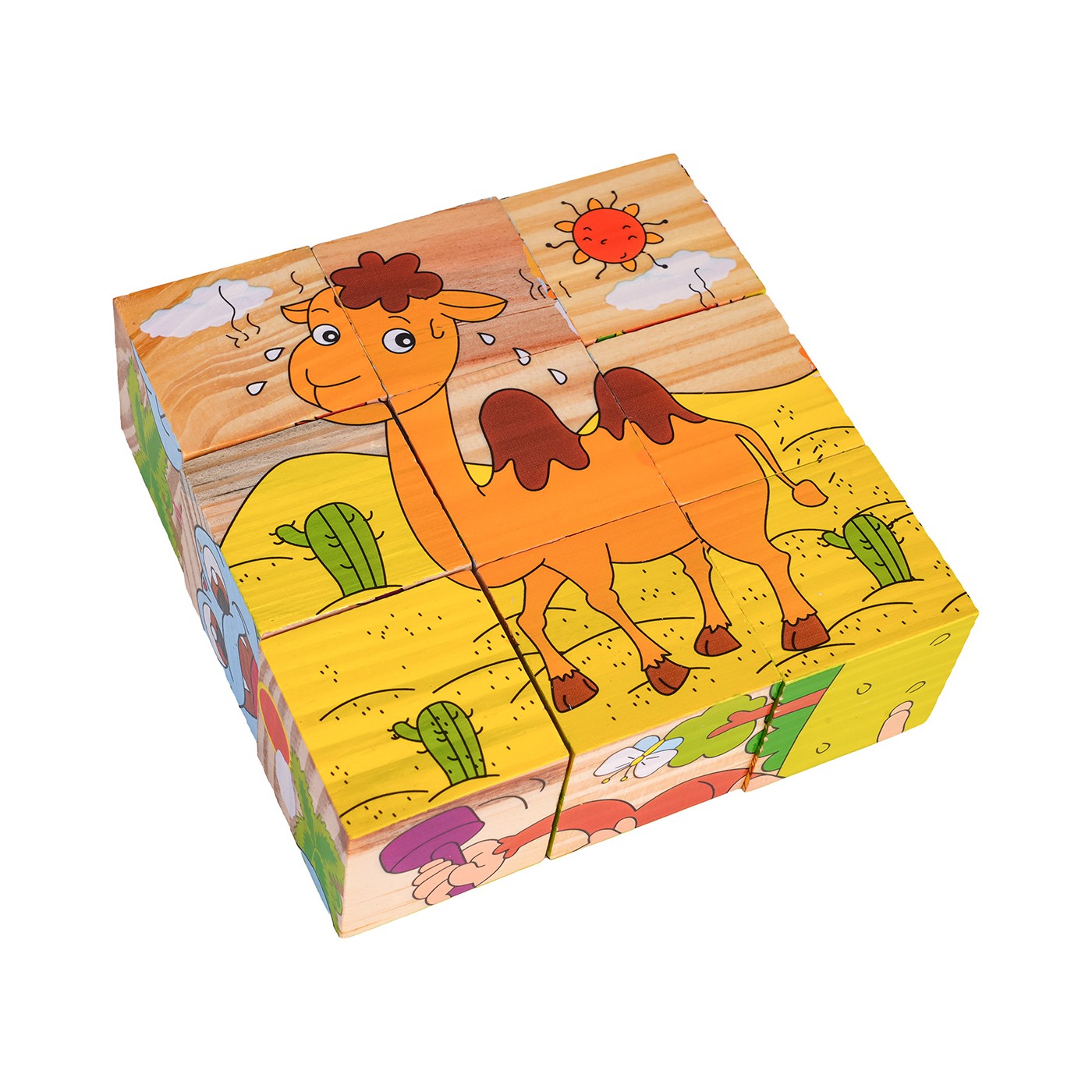 Prezentujemy zestaw 9 drewnianych klocków do układania obrazków dla dzieci od 18-go miesiąca. Na każdym z sześcianów namalowane zostały fragmenty 6 rysunków, które ukażą się w całości po ułożeniu przez malucha.