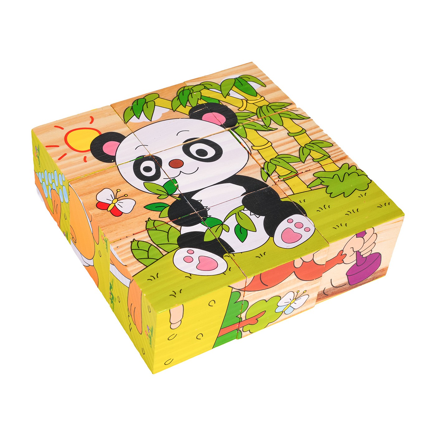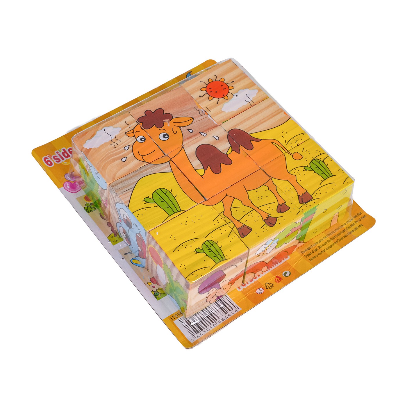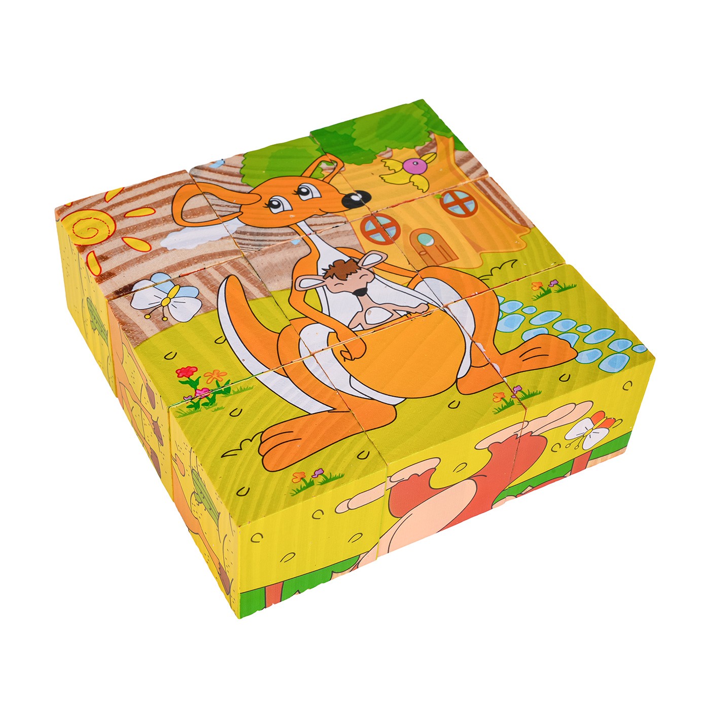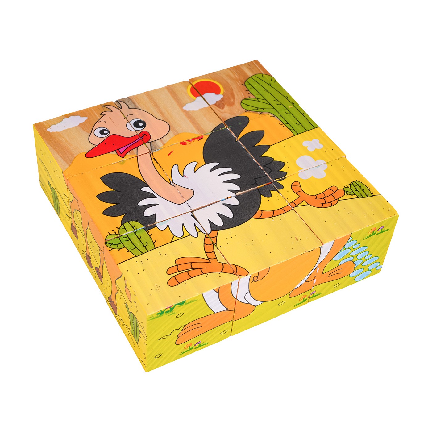 Prezentujemy zestaw 9 drewnianych klocków do układania obrazków dla dzieci od 18-go miesiąca. Na każdym z sześcianów namalowane zostały fragmenty 6 rysunków, które ukażą się w całości po ułożeniu przez malucha.