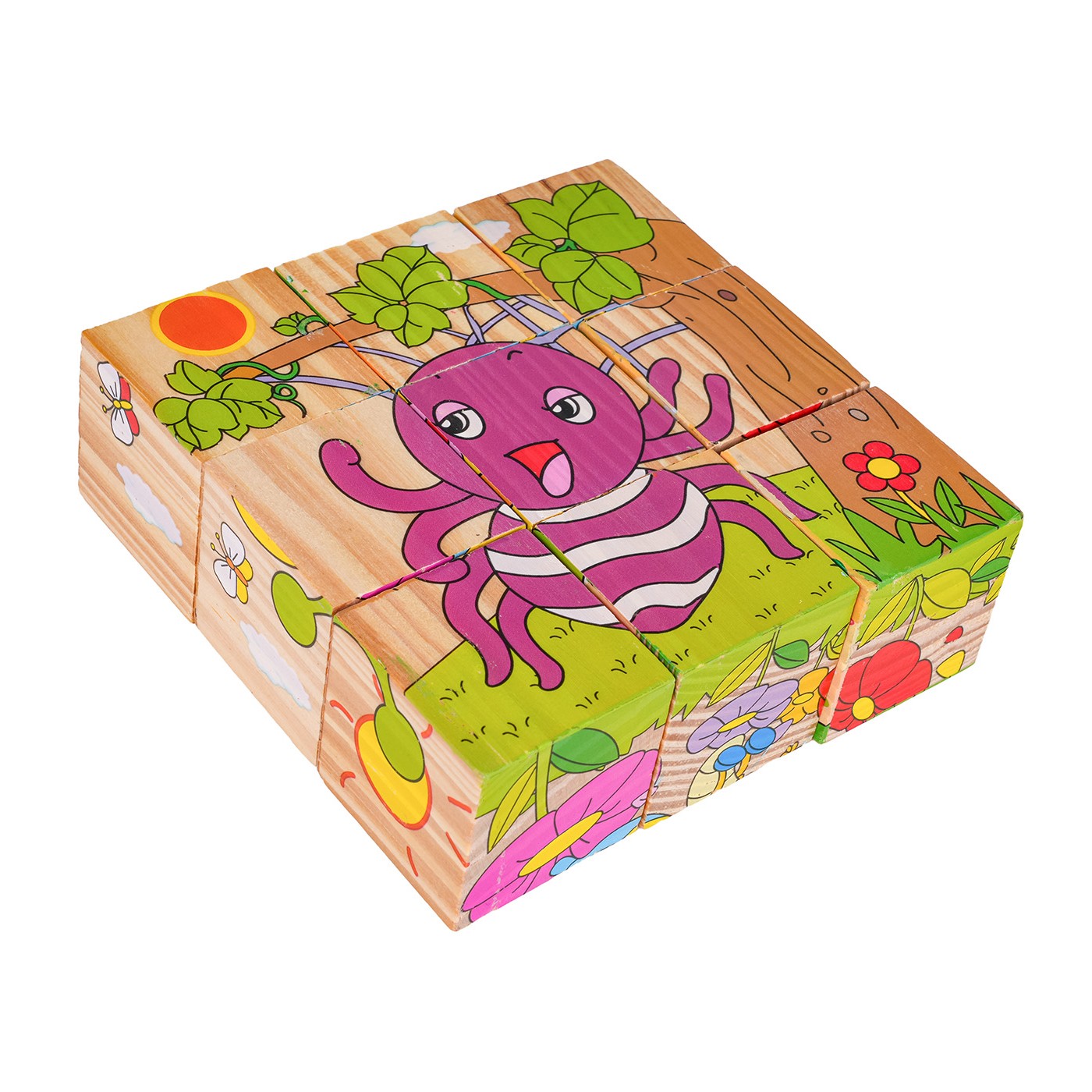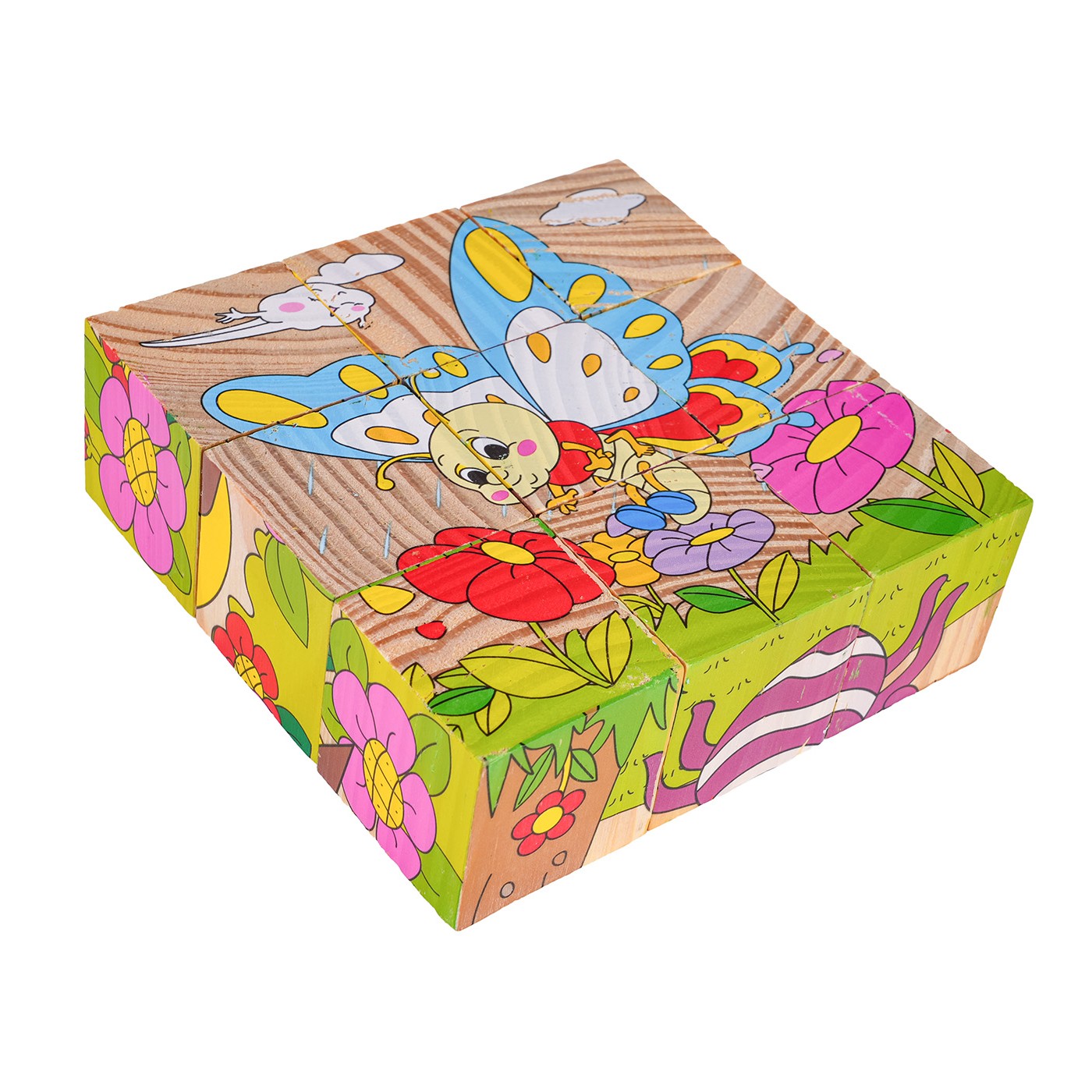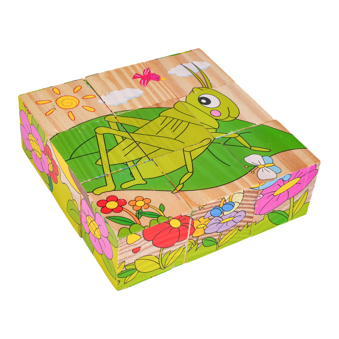 Prezentujemy zestaw 9 drewnianych klocków do układania obrazków dla dzieci od 18-go miesiąca. Na każdym z sześcianów namalowane zostały fragmenty 6 rysunków, które ukażą się w całości po ułożeniu przez malucha.