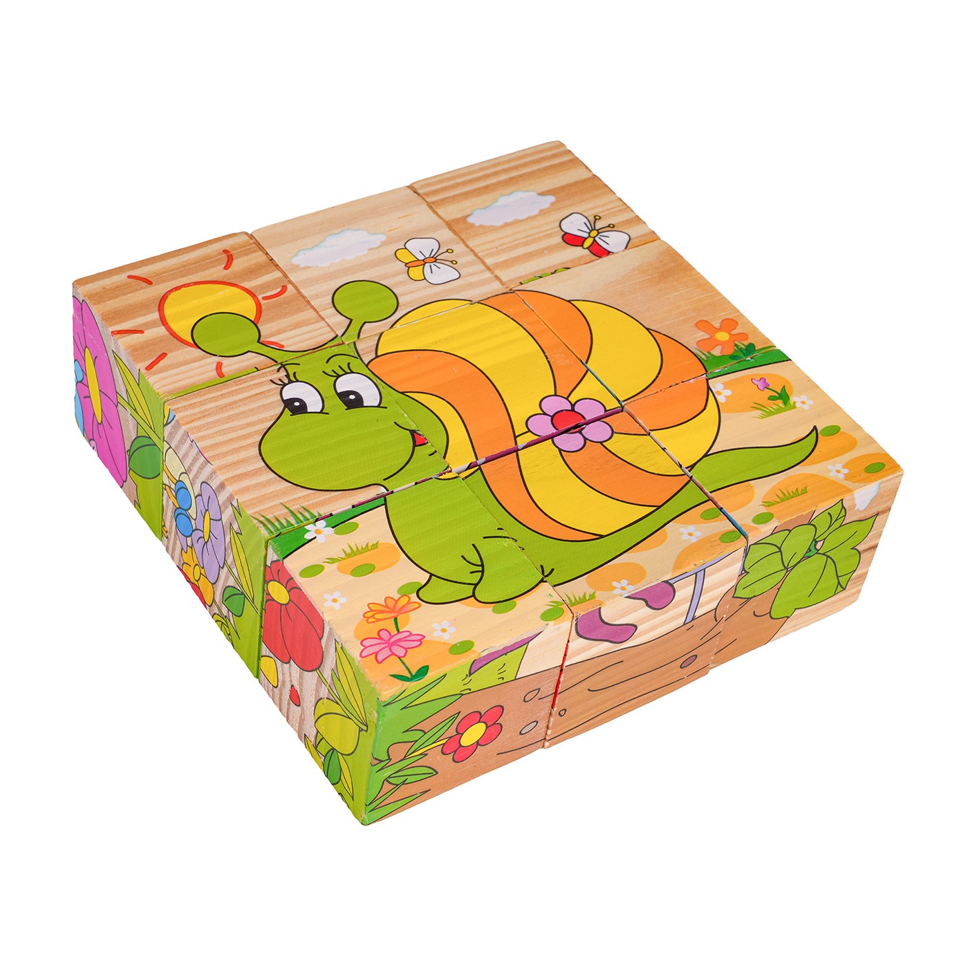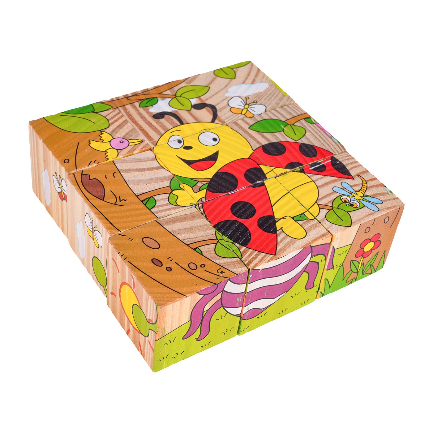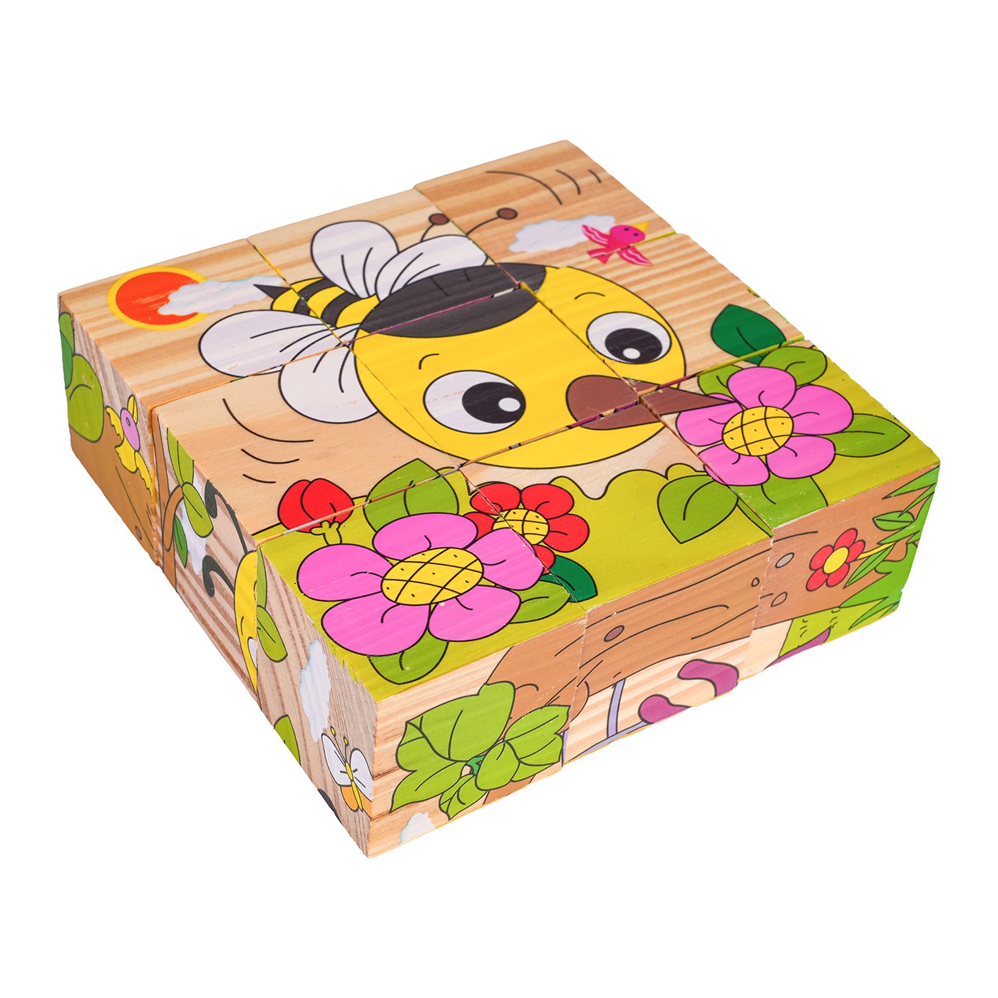 Prezentujemy zestaw 9 drewnianych klocków do układania obrazków dla dzieci od 18-go miesiąca. Na każdym z sześcianów namalowane zostały fragmenty 6 rysunków, które ukażą się w całości po ułożeniu przez malucha.