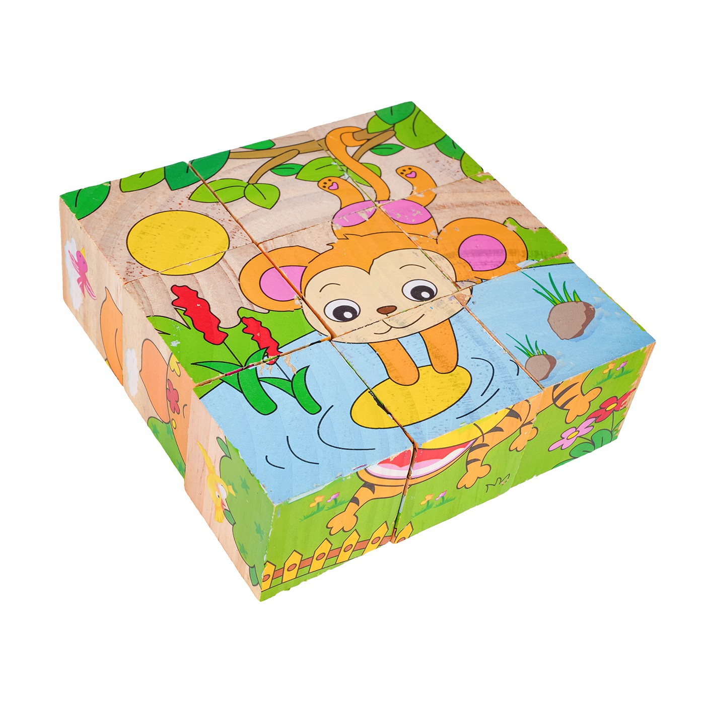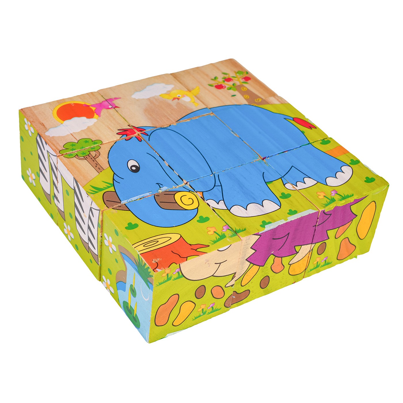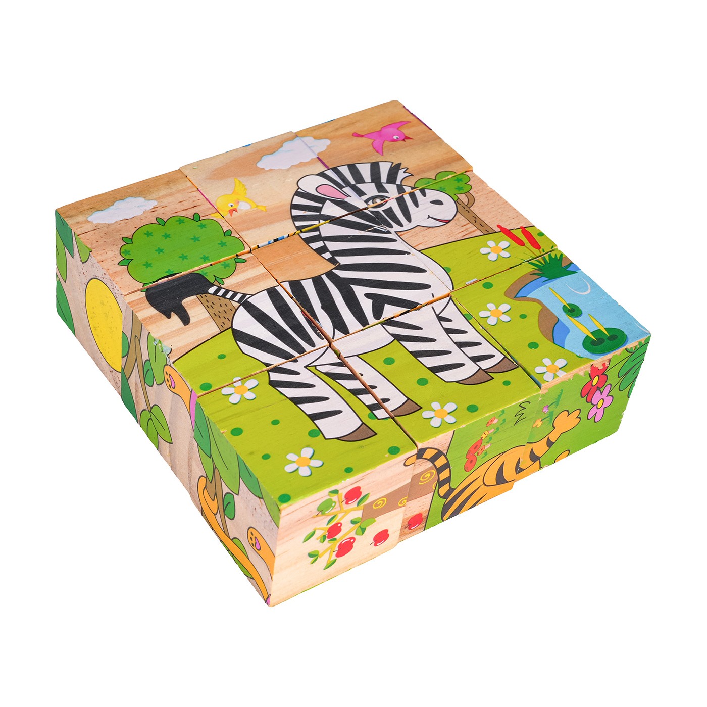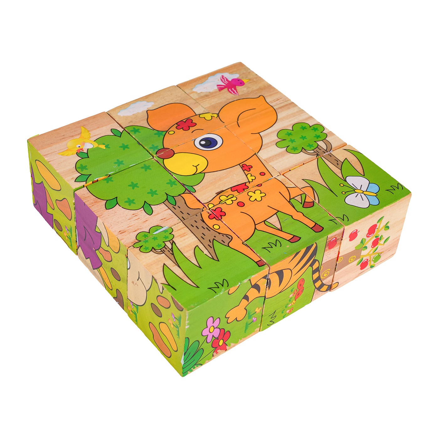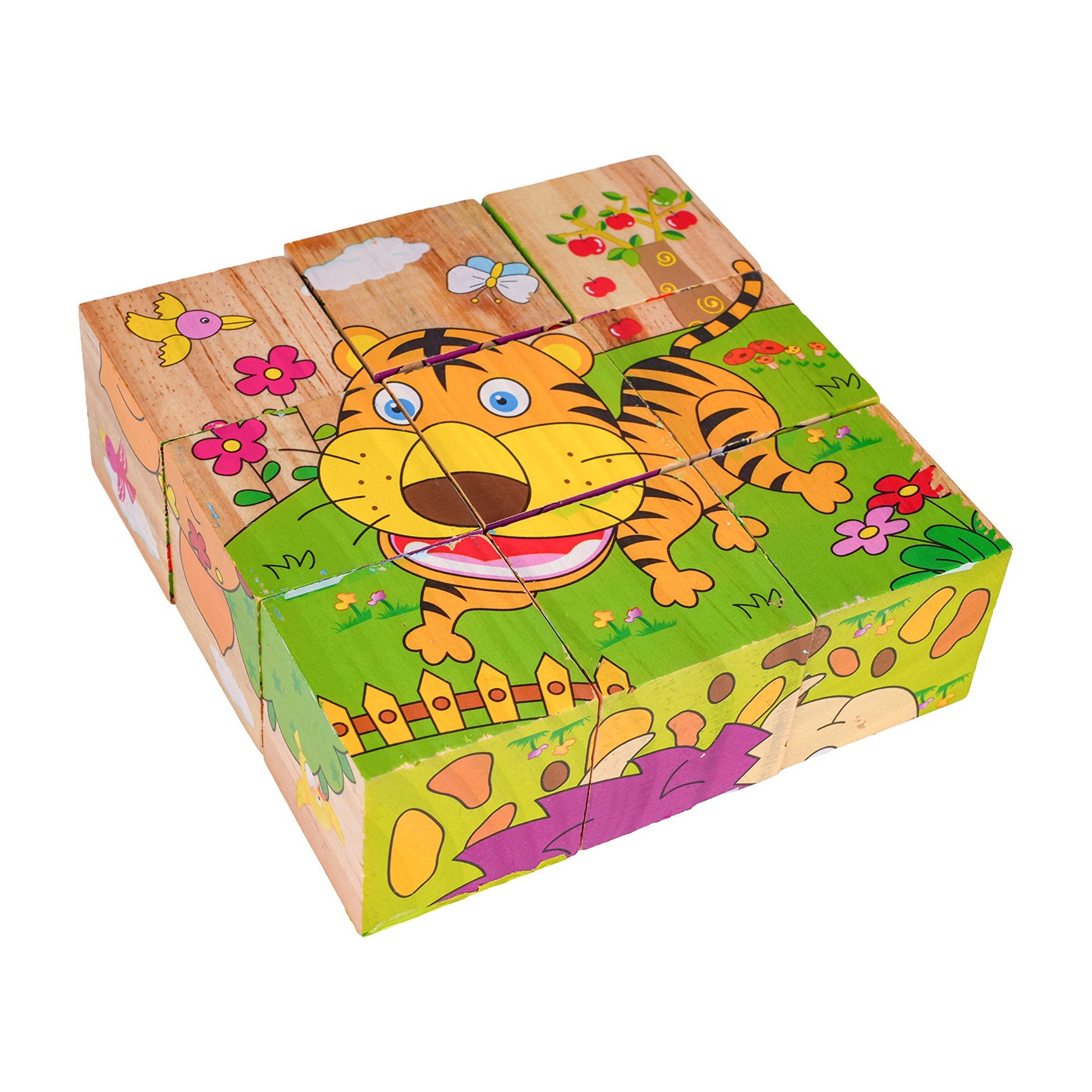 Prezentujemy zestaw 9 drewnianych klocków do układania obrazków dla dzieci od 18-go miesiąca. Na każdym z sześcianów namalowane zostały fragmenty 6 rysunków, które ukażą się w całości po ułożeniu przez malucha.