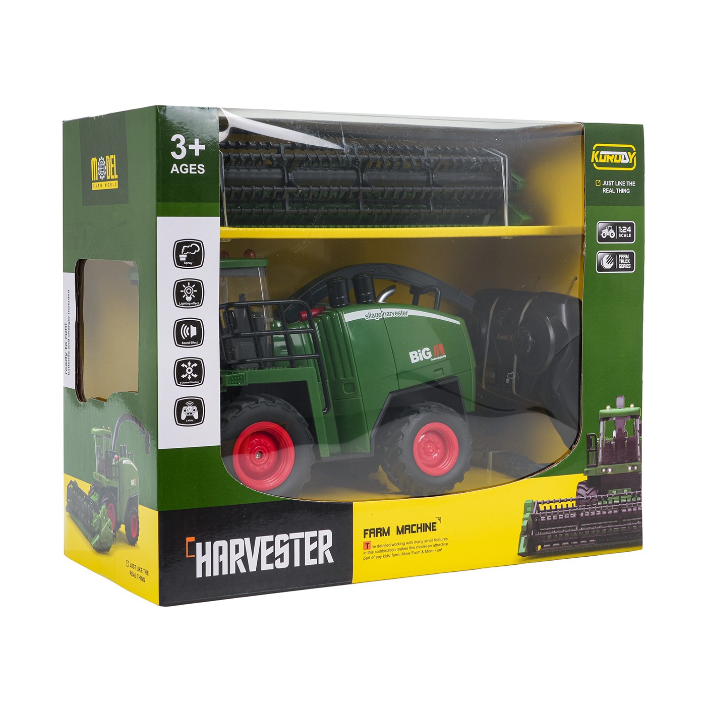 Zdalnie sterowany kombajn w skali 1:24 to interaktywna zabawka, która oddaje wygląd i działanie prawdziwej maszyny rolniczej w wersji dostosowanej do dzieci już od 3-go roku życia. Model porusza się we wszystkich kierunkach i został osadzony na dużych gumowych kołach, co zapewnia mu dobrą przyczepność i płynność jazdy po różnych powierzchniach. Charakterystyczne detale, takie jak obracający się bęben tnący, ruchoma rura wysypowa oraz zdejmowany heder, sprawiają, że zabawka wiernie odwzorowuje funkcje prawdziwego kombajnu.