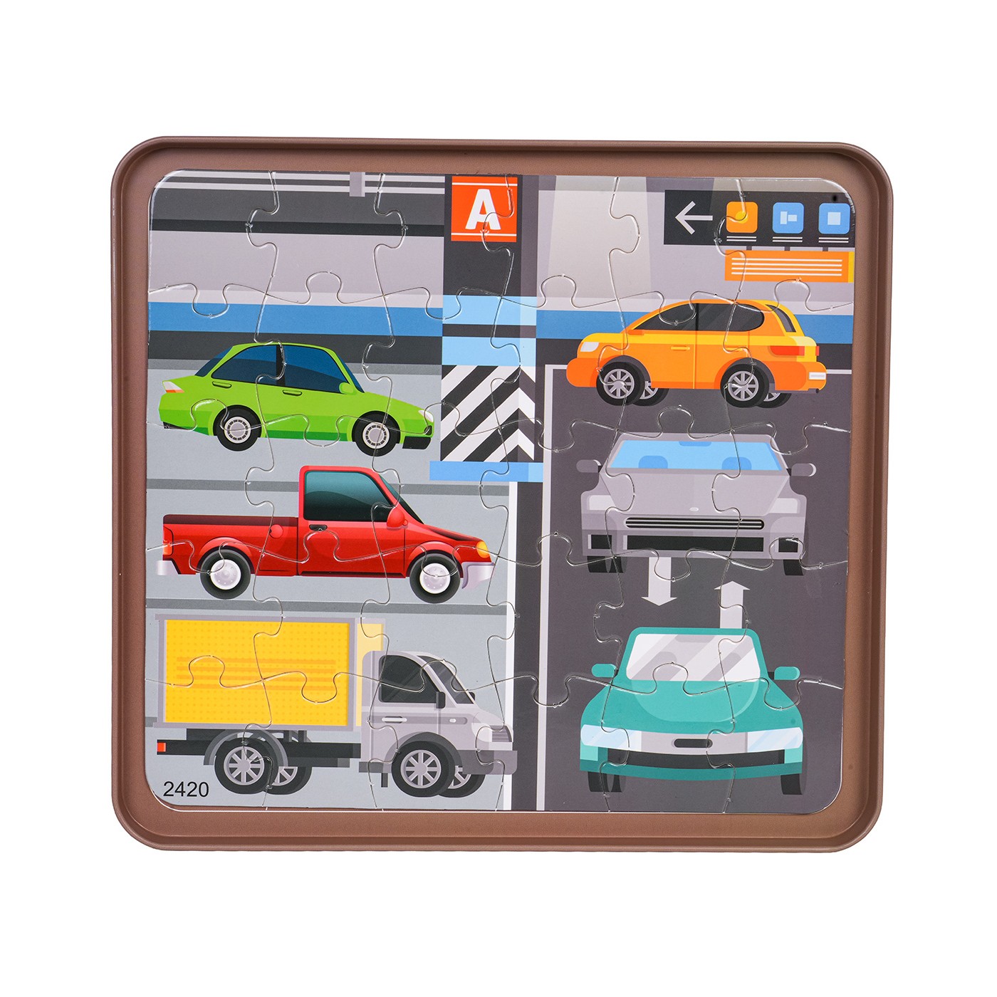 Zestaw składa się z magnetycznego pudełka, w którym znajdują się dwie plansze do układania – na wewnętrznej stronie górnej i dolnej klapy. Każda plansza zawiera po 30 elementów przedstawiających różnorodne pojazdy, co daje dziecku możliwość układania aż dwóch pełnych scen.