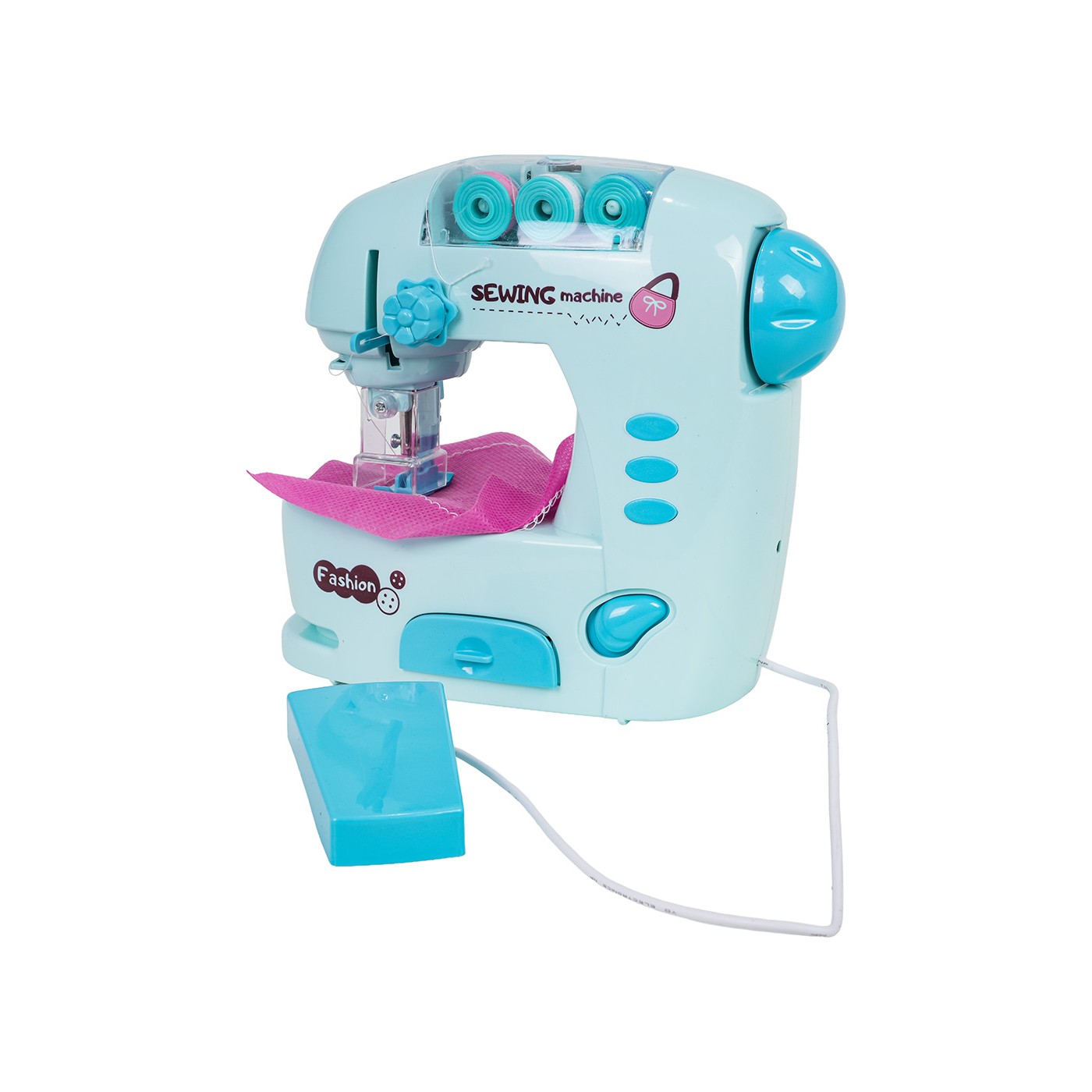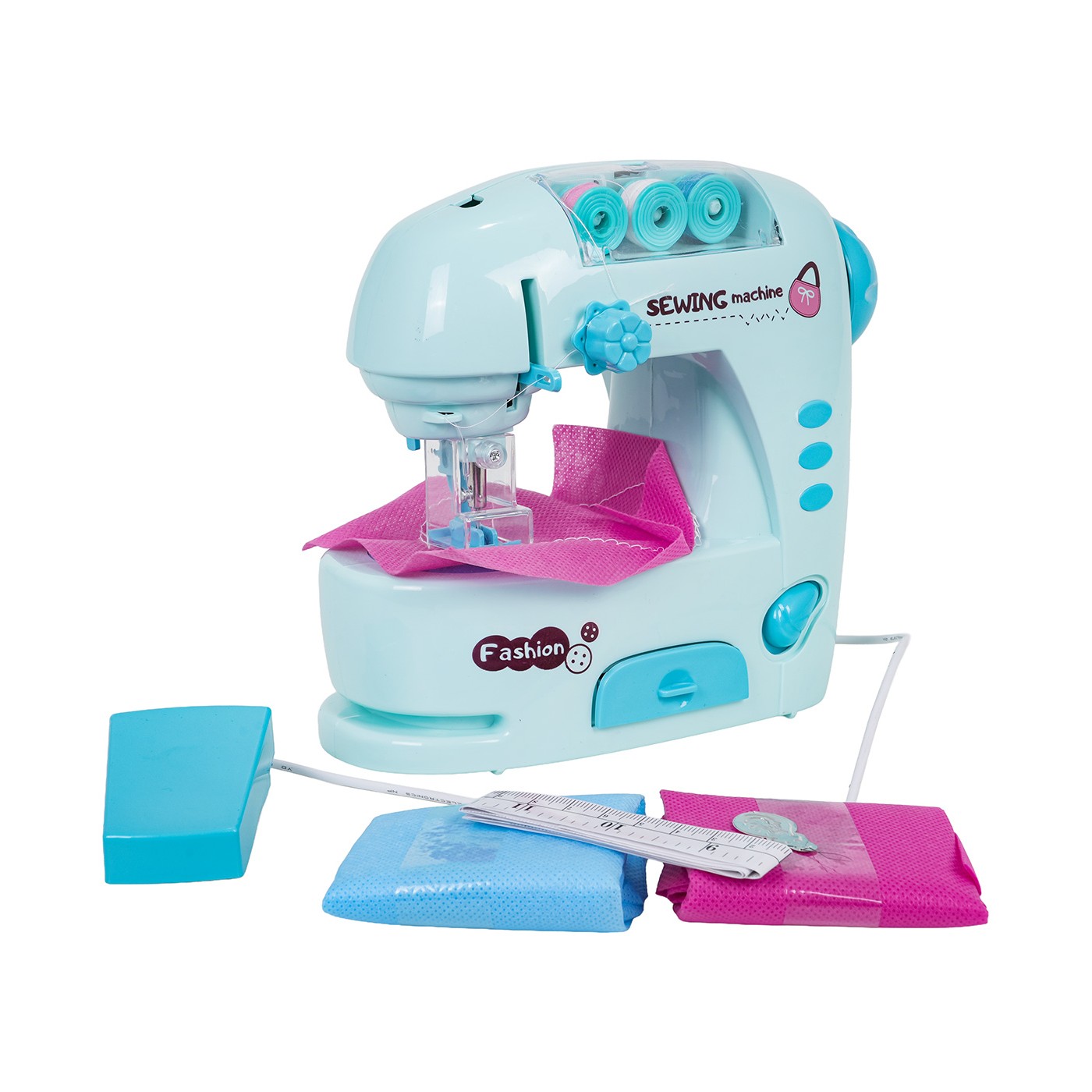 Dodatkowo dołączono 3 szpulki nici, dwa kawałki materiału, nawlekacz i metr krawiecki – wszystko, czego potrzeba do rozpoczęcia pierwszych prób szycia. Maszyna imituje prawdziwą pracę – podczas działania wydaje dźwięki i świeci się lampka nad polem szycia.
