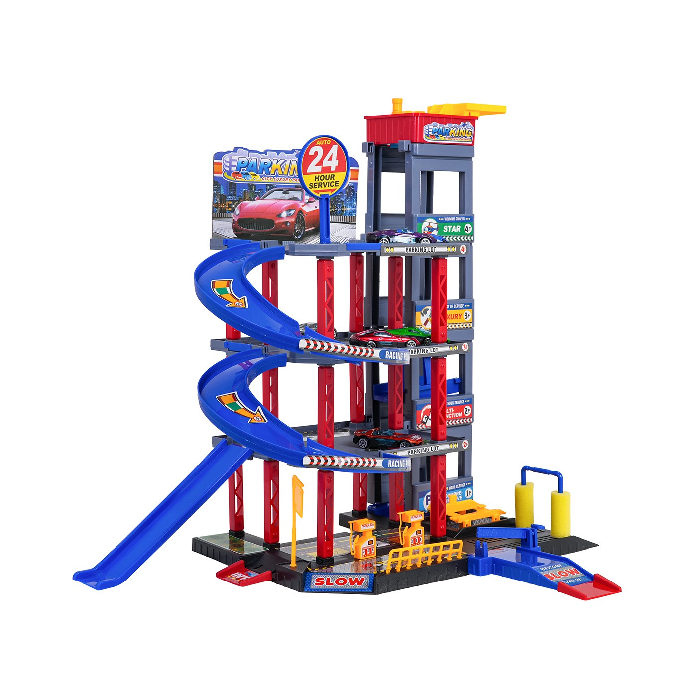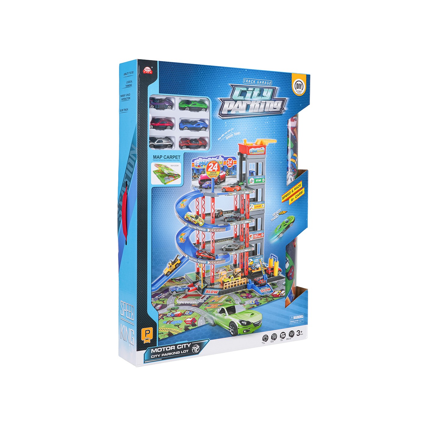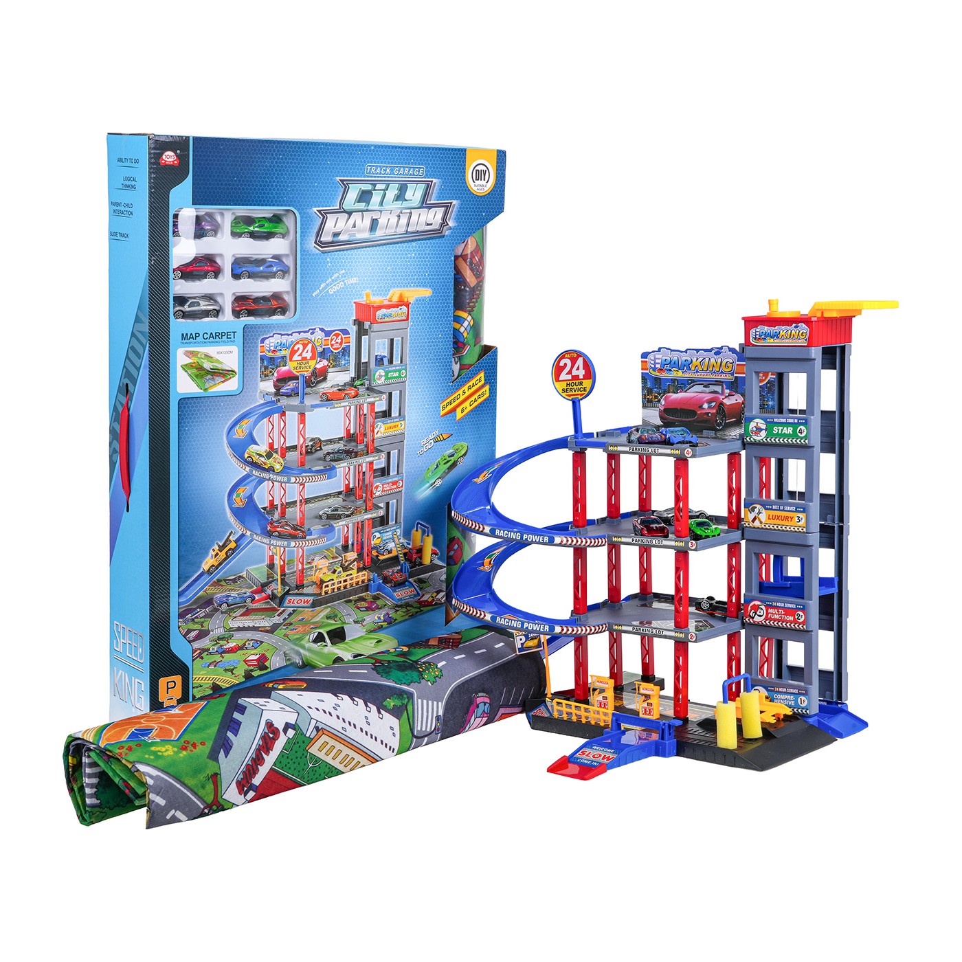 Zestaw składa się z wielopoziomowego parkingu, filcowej maty z nadrukowanymi ulicami oraz sześciu pojazdów typu resoraki z metalową karoserią. Każdy poziom parkingu połączony jest z osobną zjeżdżalnią, co pozwala na dynamiczną i urozmaiconą zabawę.