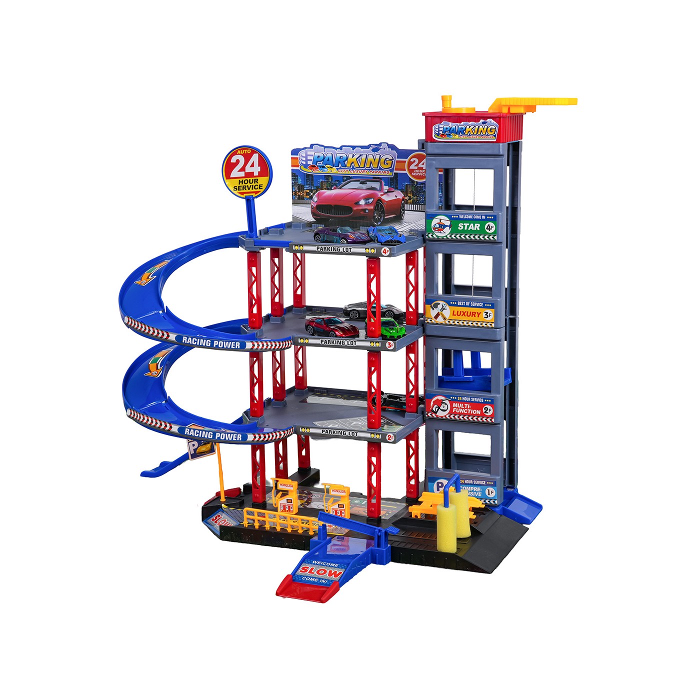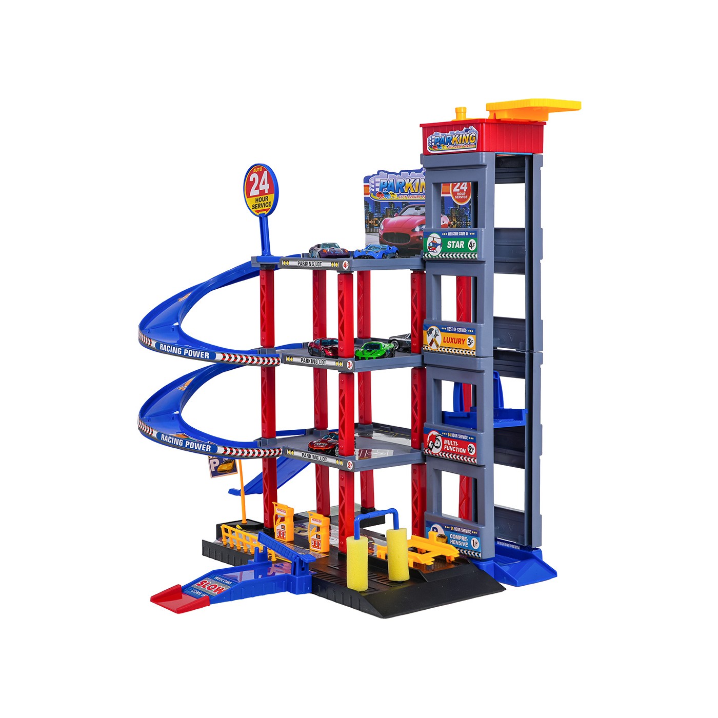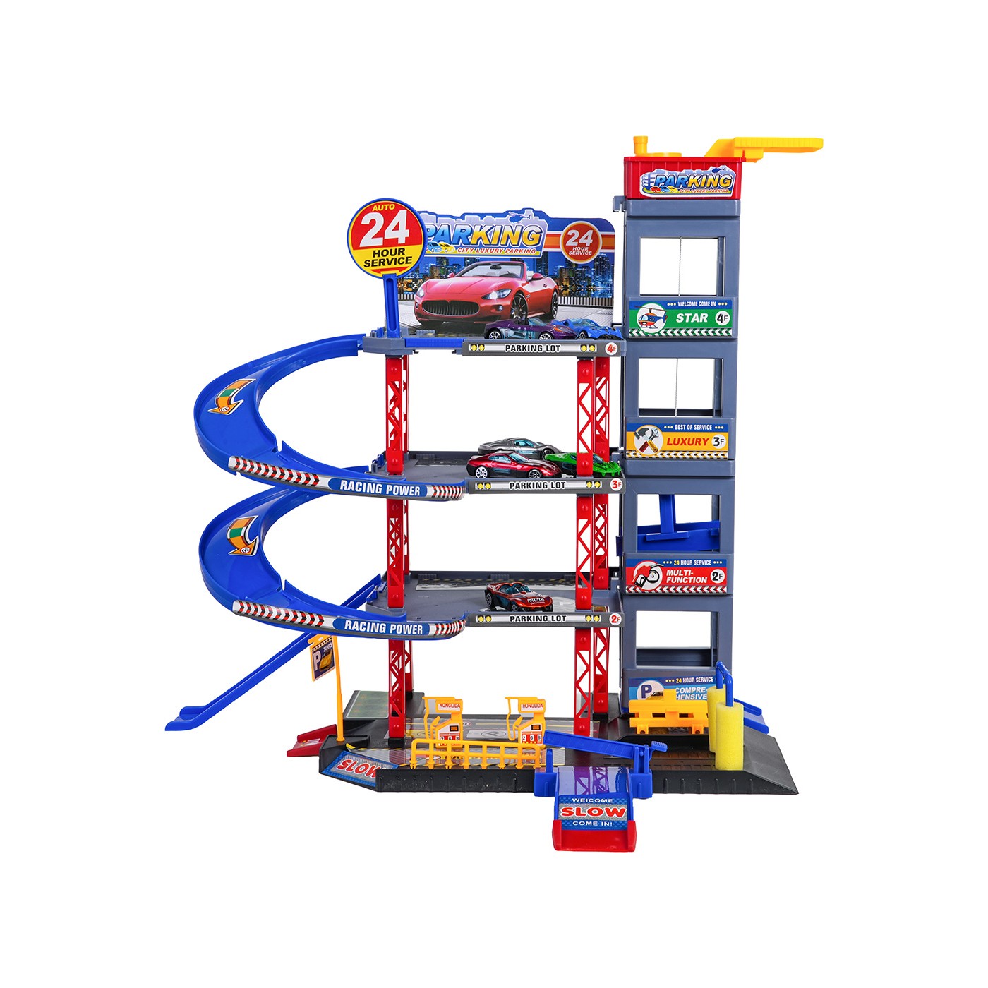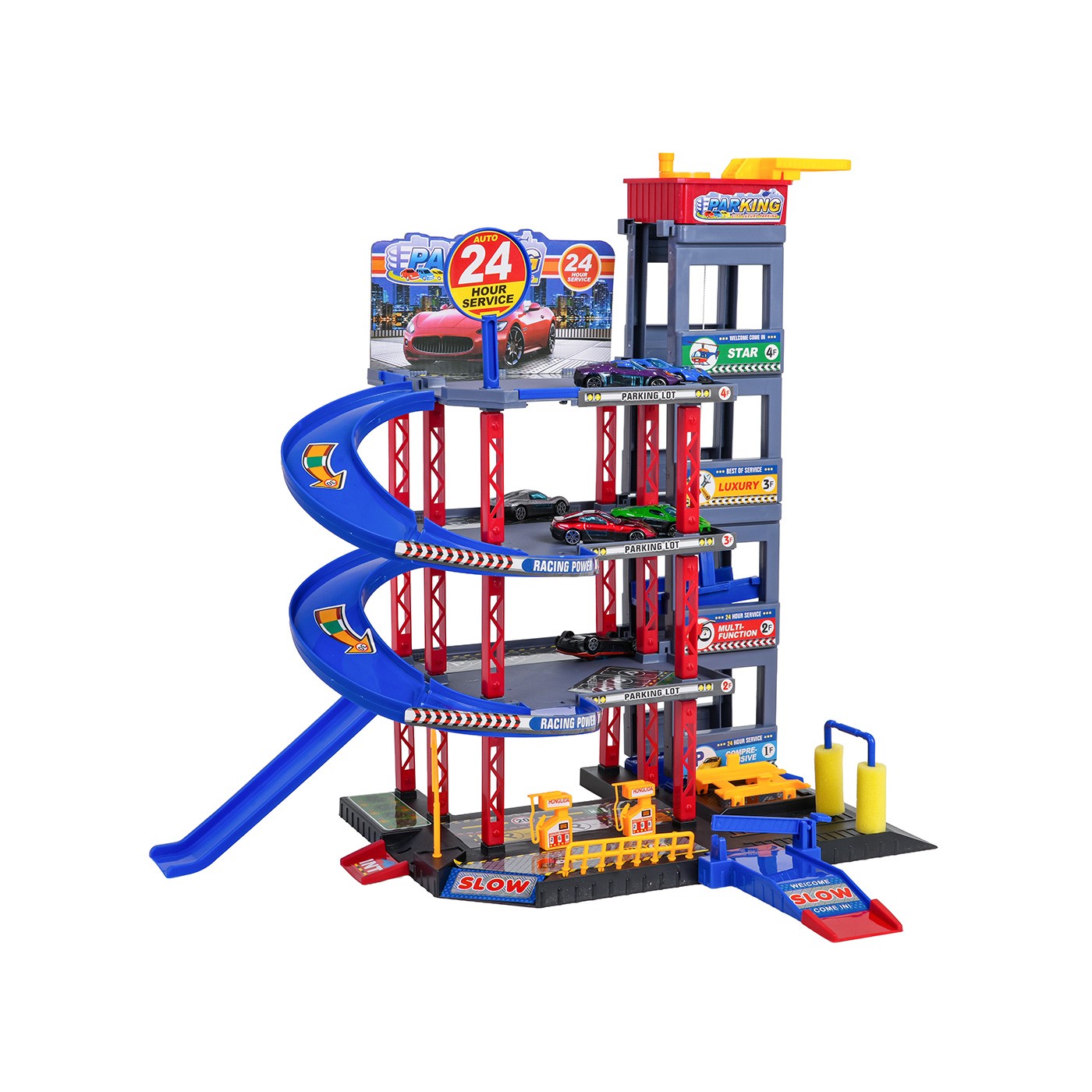 Zestaw składa się z wielopoziomowego parkingu, filcowej maty z nadrukowanymi ulicami oraz sześciu pojazdów typu resoraki z metalową karoserią. Każdy poziom parkingu połączony jest z osobną zjeżdżalnią, co pozwala na dynamiczną i urozmaiconą zabawę.