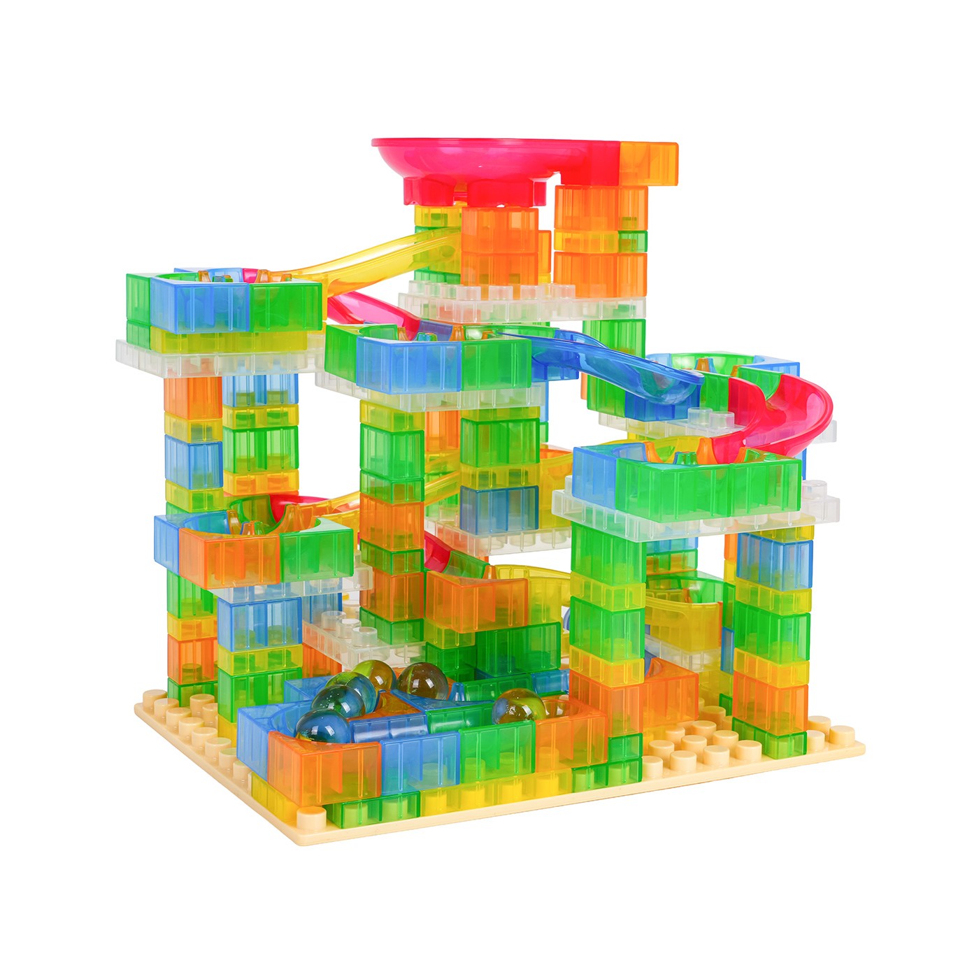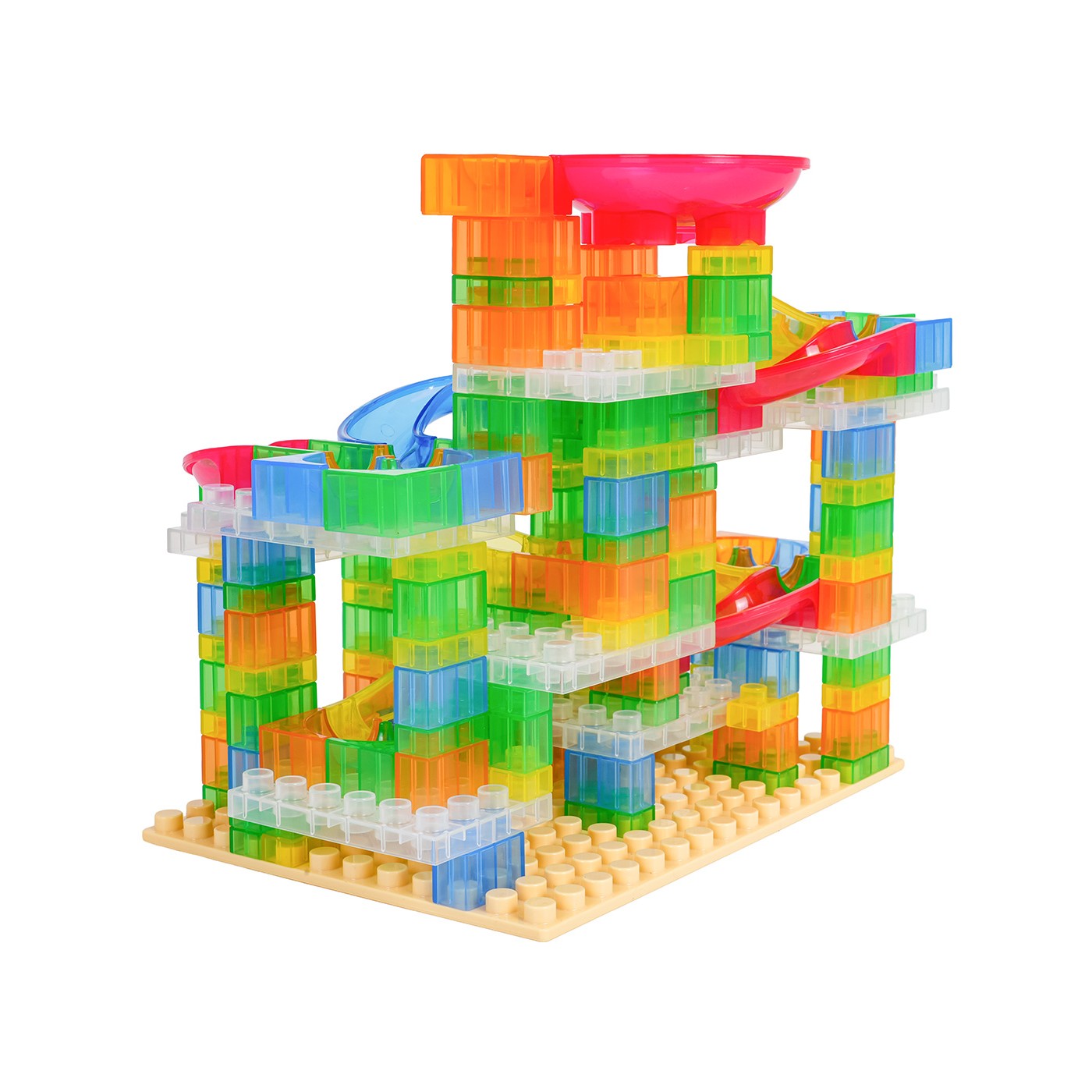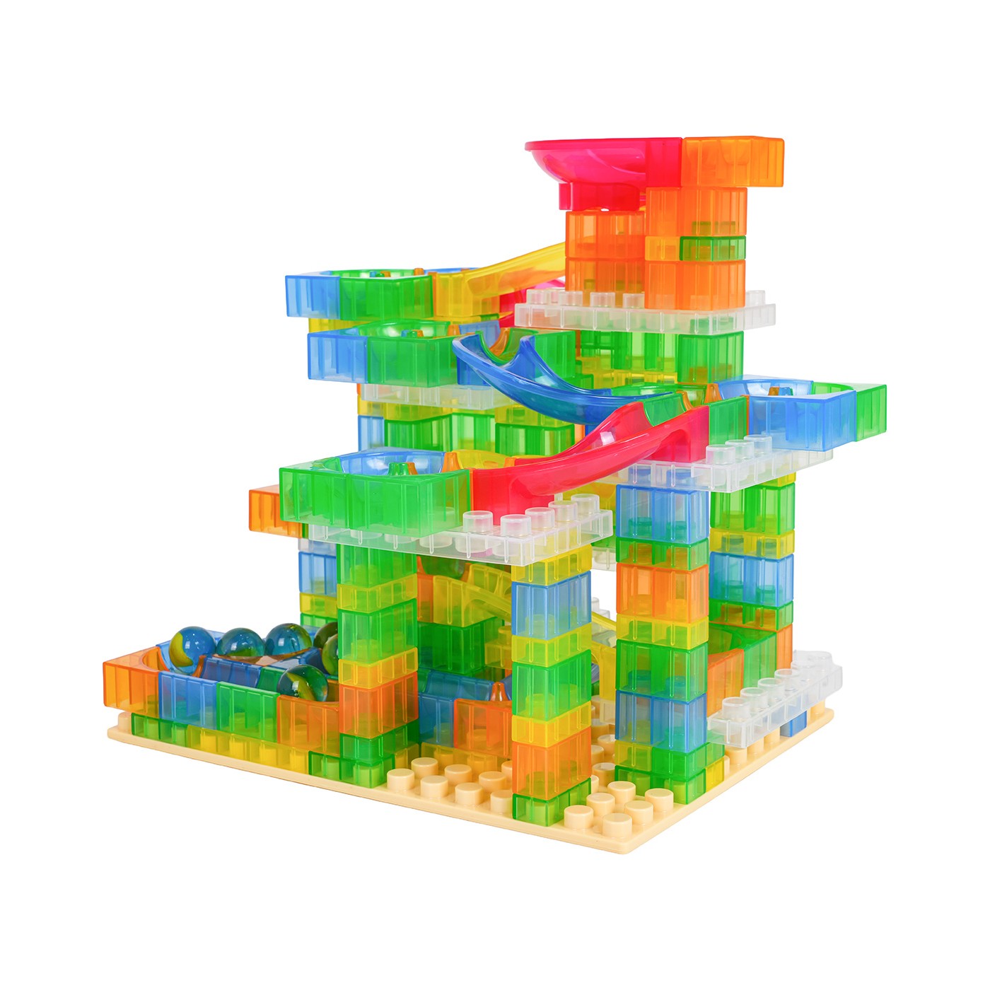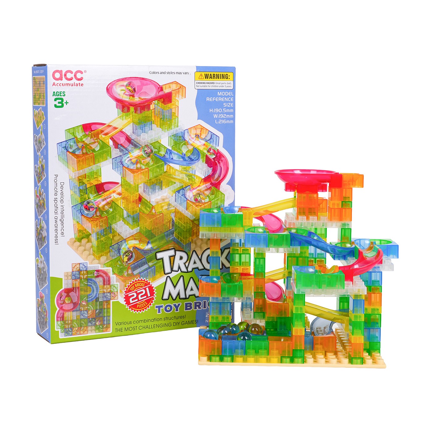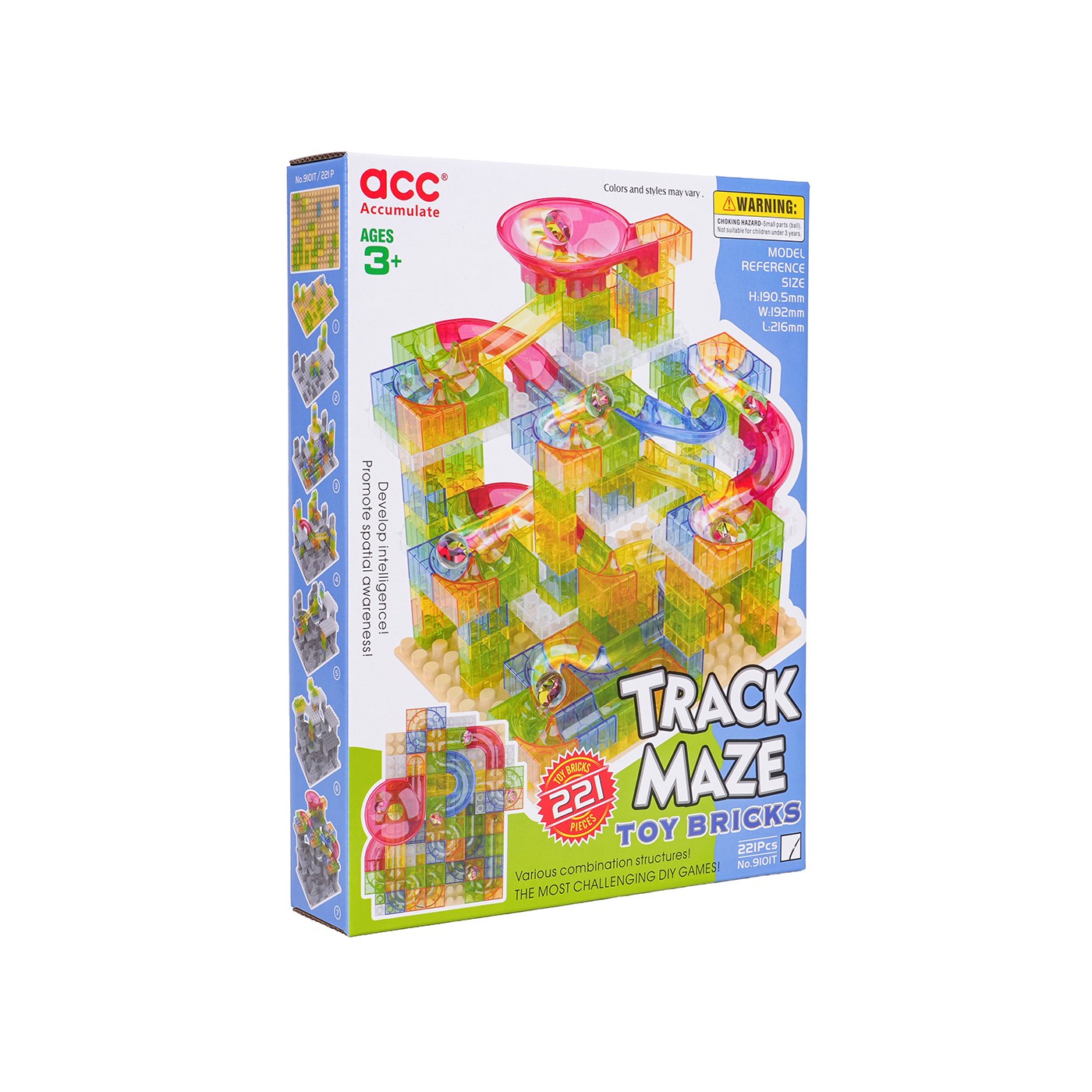 W zestawie znajduje się aż 221 kolorowych elementów, które można łączyć w dowolny sposób, tworząc tor dopasowany do własnych pomysłów. Konstrukcja jest stabilna, dobrze osadzona i pozwala na bezproblemowe puszczanie szklanych kuleczek przez zakręty, zjeżdżalnie i tunele. Wszystkie części zostały wykonane z wytrzymałych, bezpiecznych materiałów o intensywnych kolorach, które przyciągają uwagę i pobudzają zmysły.