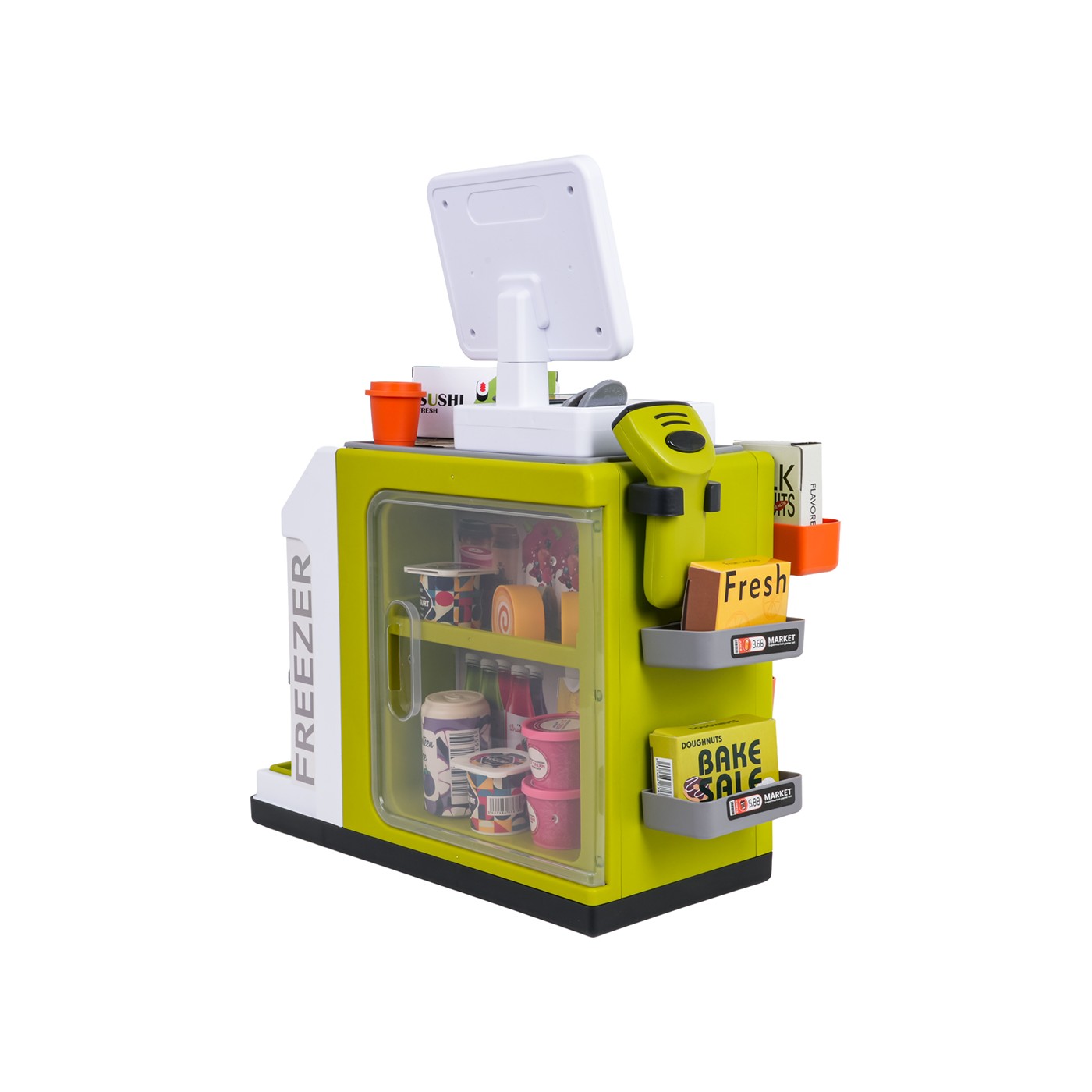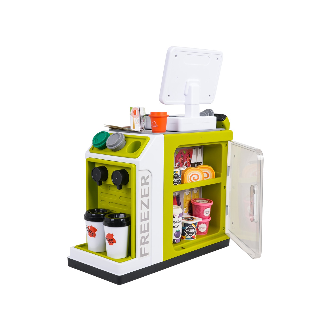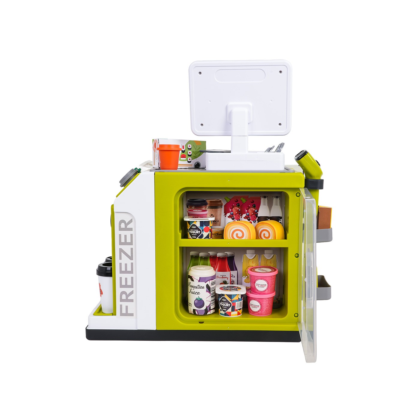 Zestaw zawiera wiele elementów, które oddają klimat prawdziwego sklepu: półki wypełnione atrapami produktów spożywczych, otwieraną lodówkę, ekspres do kawy z kapsułkami oraz stanowisko kasowe z symulatorem kasy fiskalnej. Kasa reaguje dźwiękiem na naciśnięcie przycisków kalkulatora oraz wybór płatności kartą.