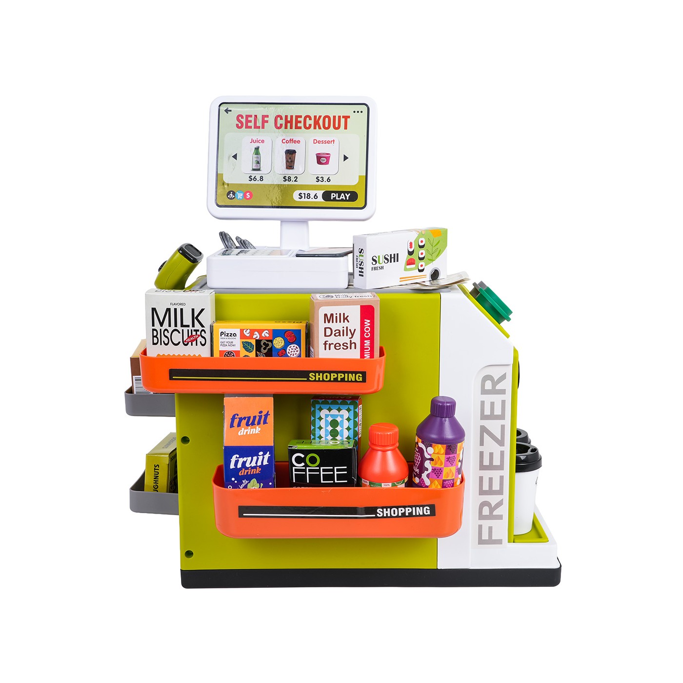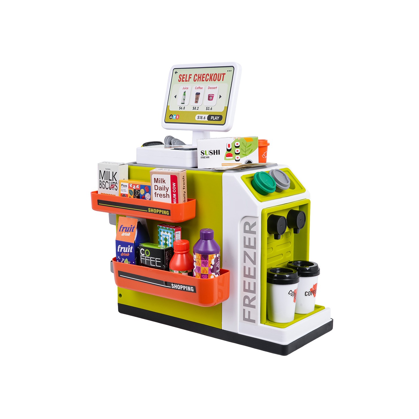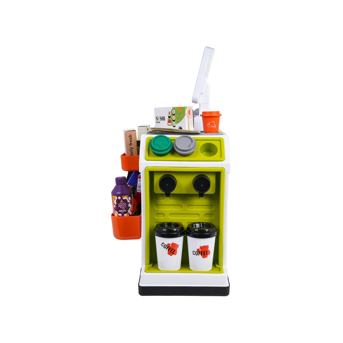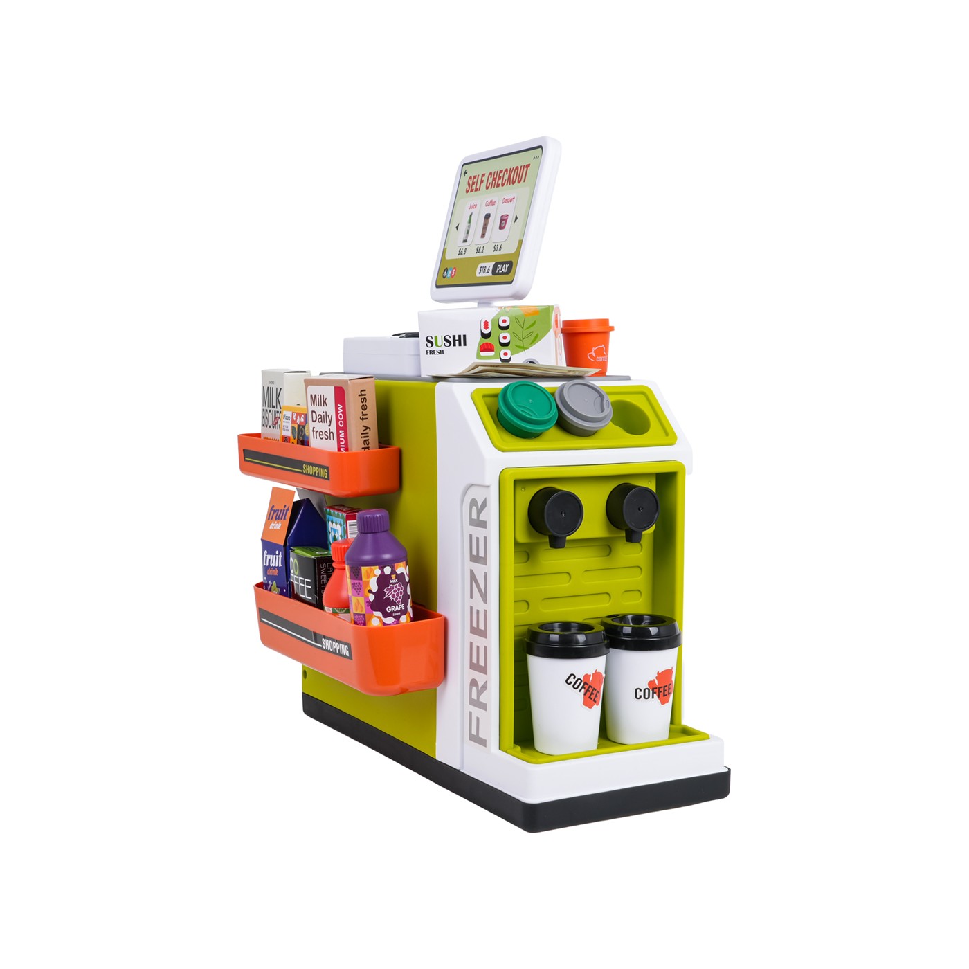 Zestaw zawiera wiele elementów, które oddają klimat prawdziwego sklepu: półki wypełnione atrapami produktów spożywczych, otwieraną lodówkę, ekspres do kawy z kapsułkami oraz stanowisko kasowe z symulatorem kasy fiskalnej. Kasa reaguje dźwiękiem na naciśnięcie przycisków kalkulatora oraz wybór płatności kartą.