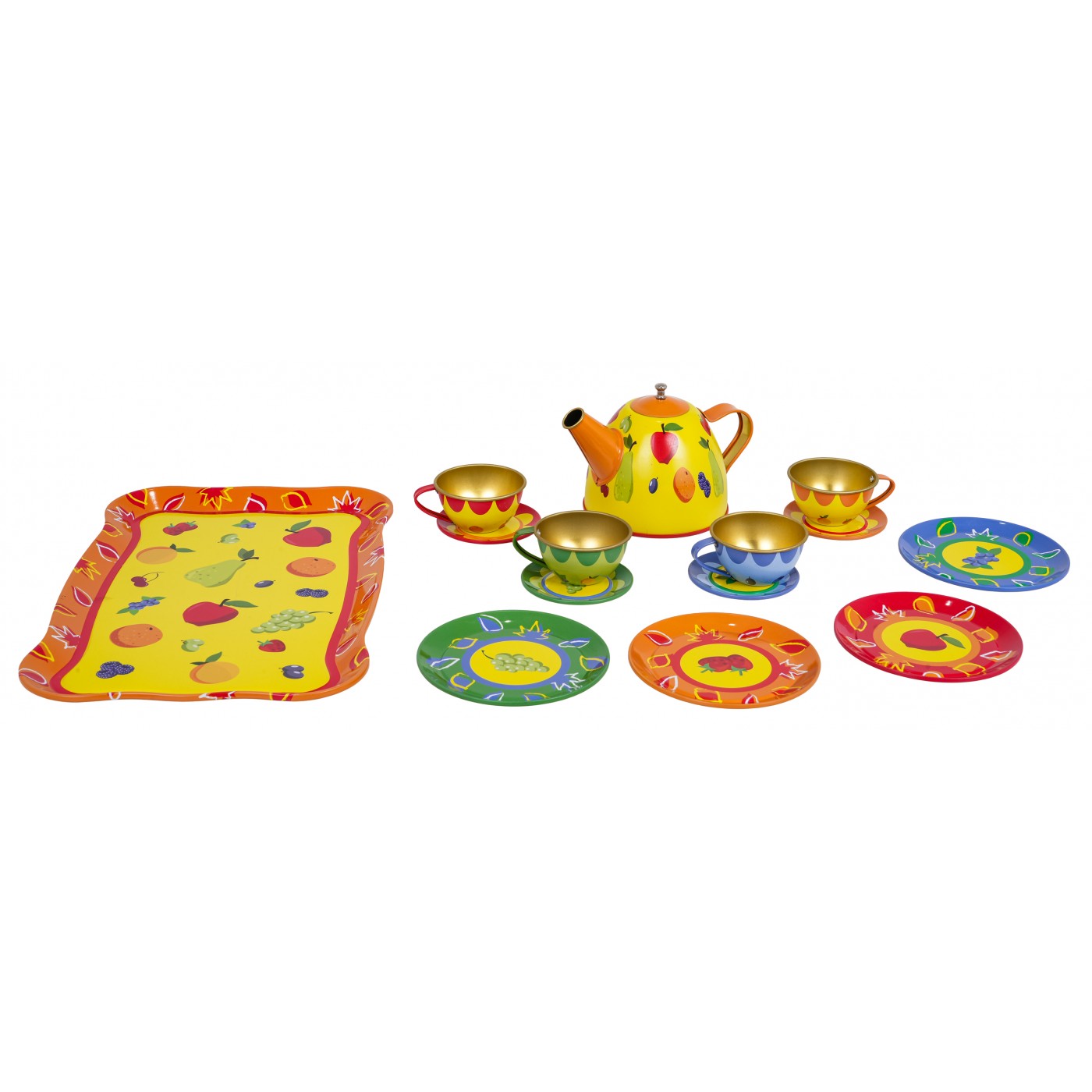 Zestaw składa się z 15 metalowych elementów, wśród których znajdują się czajniczek z pokrywką, filiżanki, spodki, talerzyki oraz taca. Każdy z komponentów wykonano z metalu i pokryto bezpieczną, nietoksyczną farbą, co gwarantuje trwałość oraz bezpieczeństwo podczas codziennej zabawy.