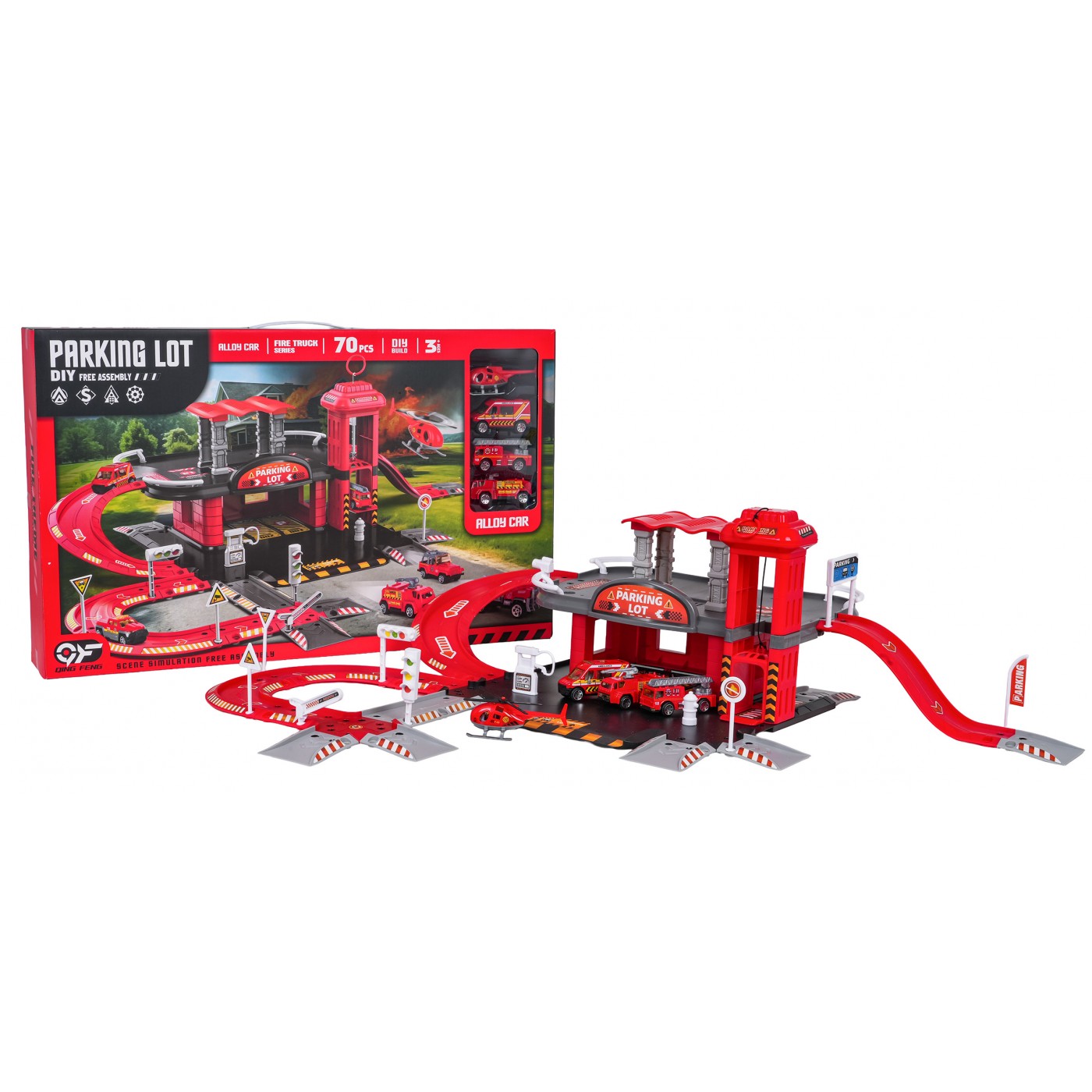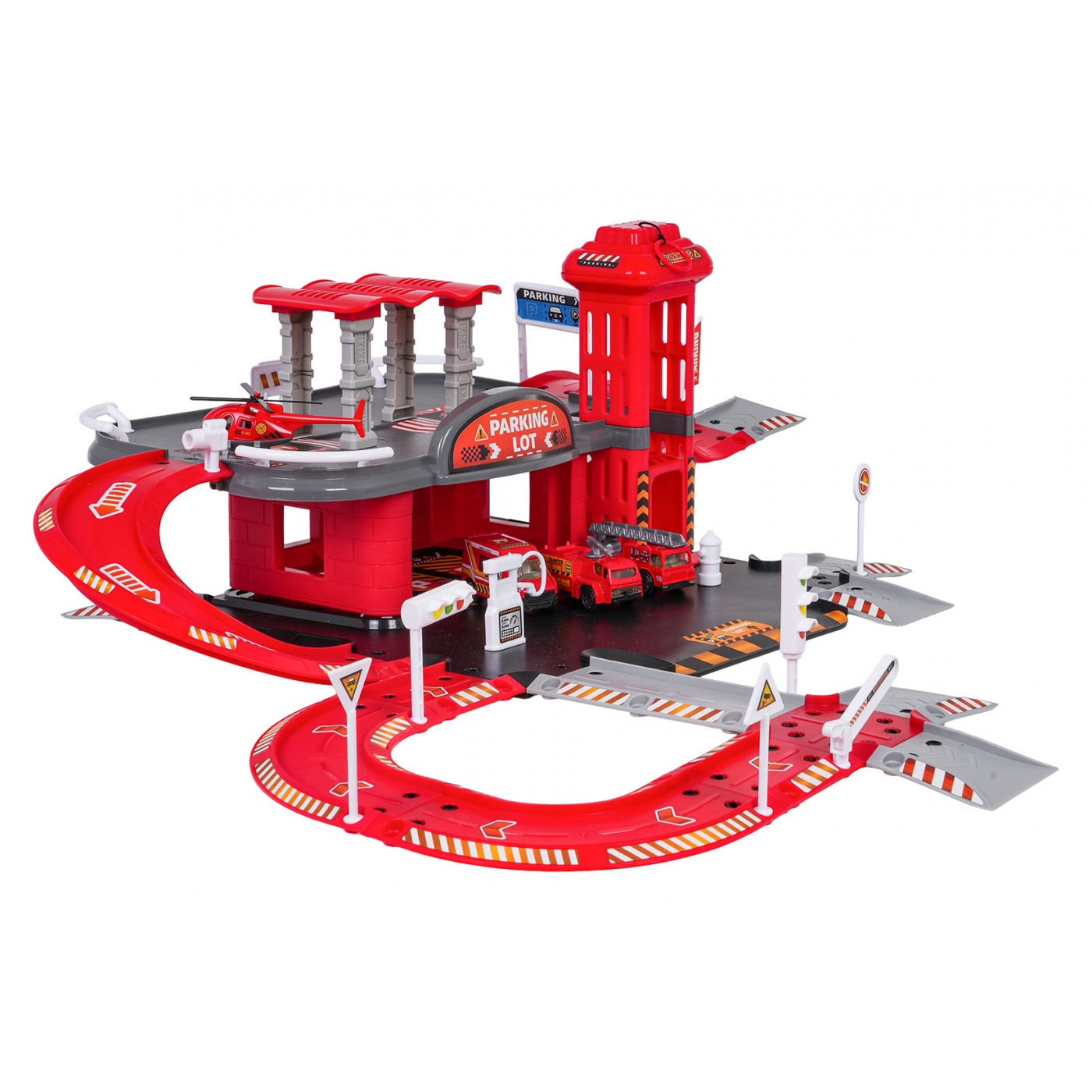 W skład zestawu wchodzi aż 70 elementów, w tym: stacja benzynowa, drogi dojazdowe, zjeżdżalnia oraz ręcznie obsługiwana winda, która transportuje pojazdy z parteru na pierwsze piętro parkingu. Do dyspozycji są trzy pojazdy strażackie z metalową karoserią i ruchomymi elementami, a także helikopter do akcji z powietrza. Całość została zaprojektowana z myślą o łatwym montażu oraz stabilności gotowej konstrukcji, która nie zajmuje dużo miejsca po złożeniu.