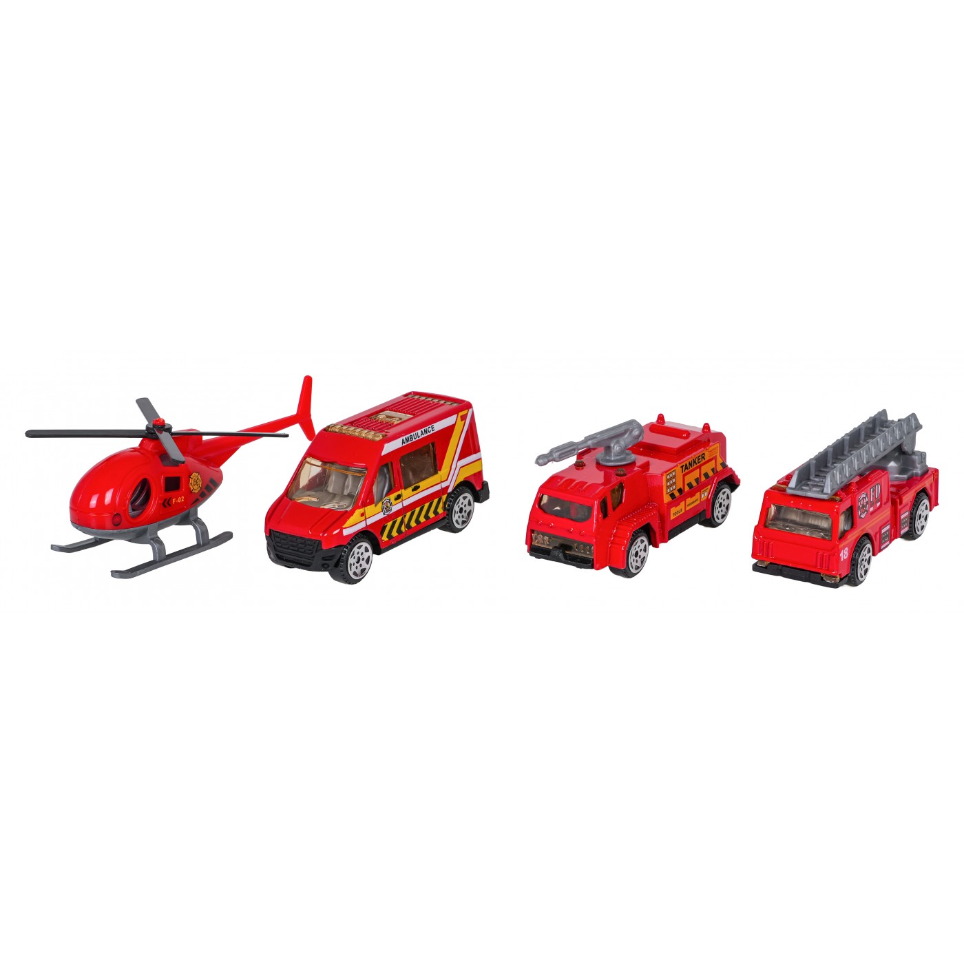 - 3 pojazdy strażackie (z drabiną, z armatką wodną, ambulans) – każdy ok. 7,5 x 3 x 3 cm,