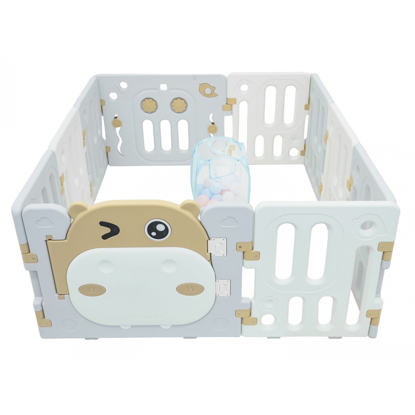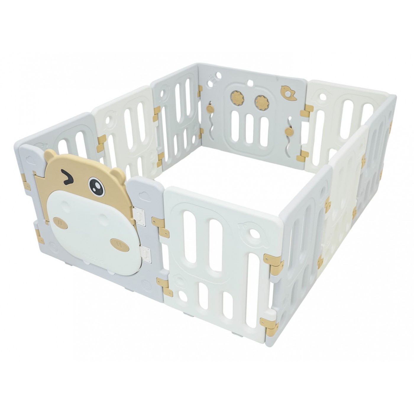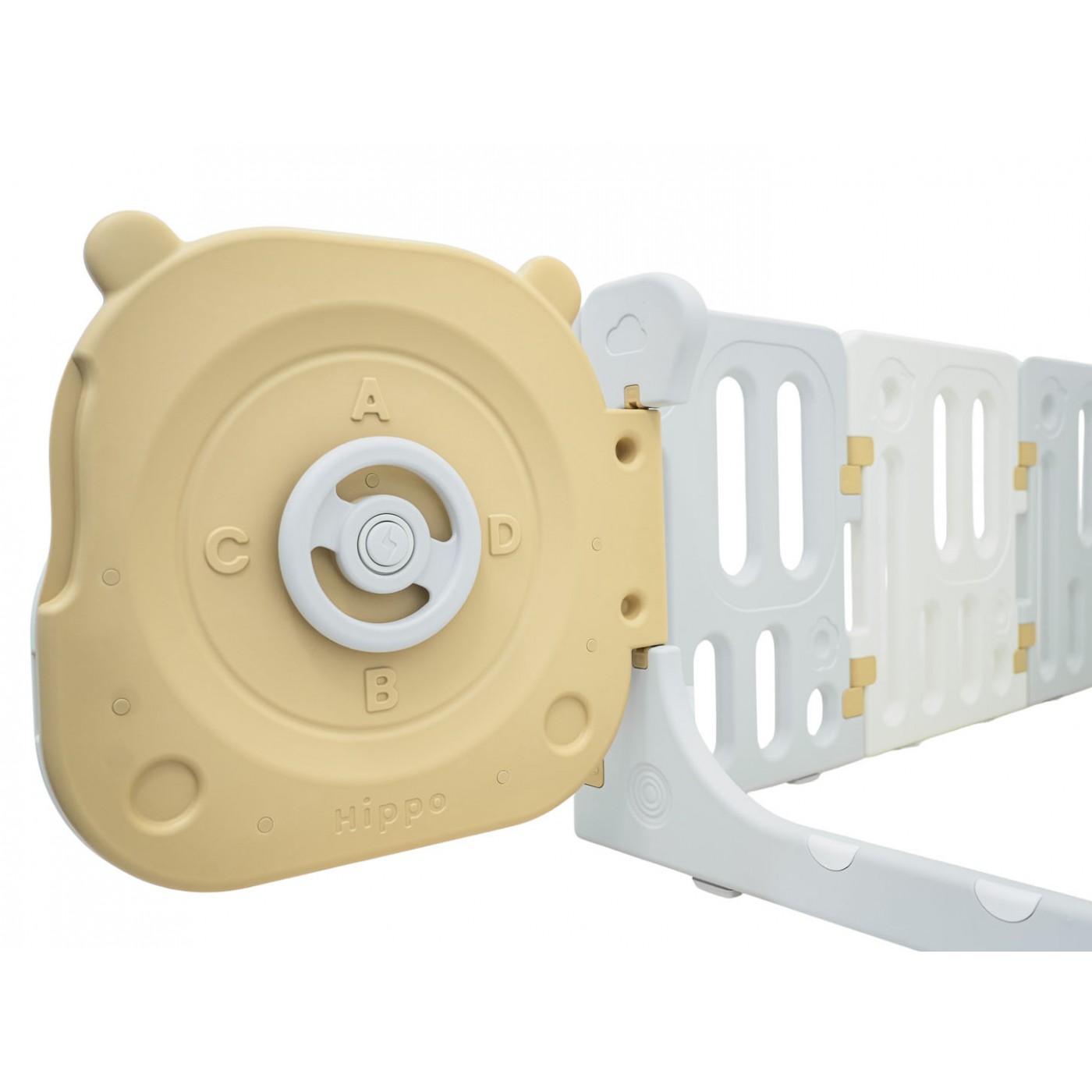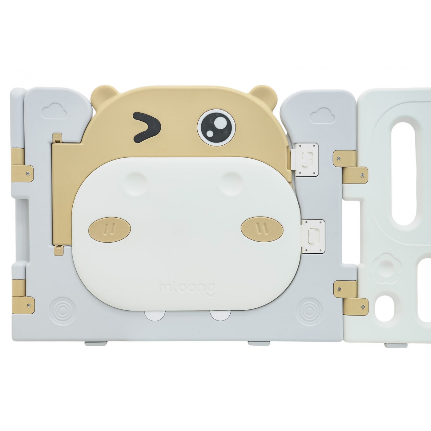Zestaw zawiera 10 paneli, w tym jeden z bezpiecznymi drzwiczkami, które można zablokować od zewnątrz – co uniemożliwia dziecku samodzielne otwarcie i wydostanie się z płotka/kojca. Kształt drzwi przypomina głowę wesołego hipopotama, co będzie dobrze kojarzyć się najmłodszym i zachęcać ich do wejścia. Na drzwiczkach od wewnętrznej strony znajduje się obrotowa kierownica z piszczałką na środku i literami „ABCD” wokół. Zachęci to maluchy do zabawy i manipulowania kierownicą.