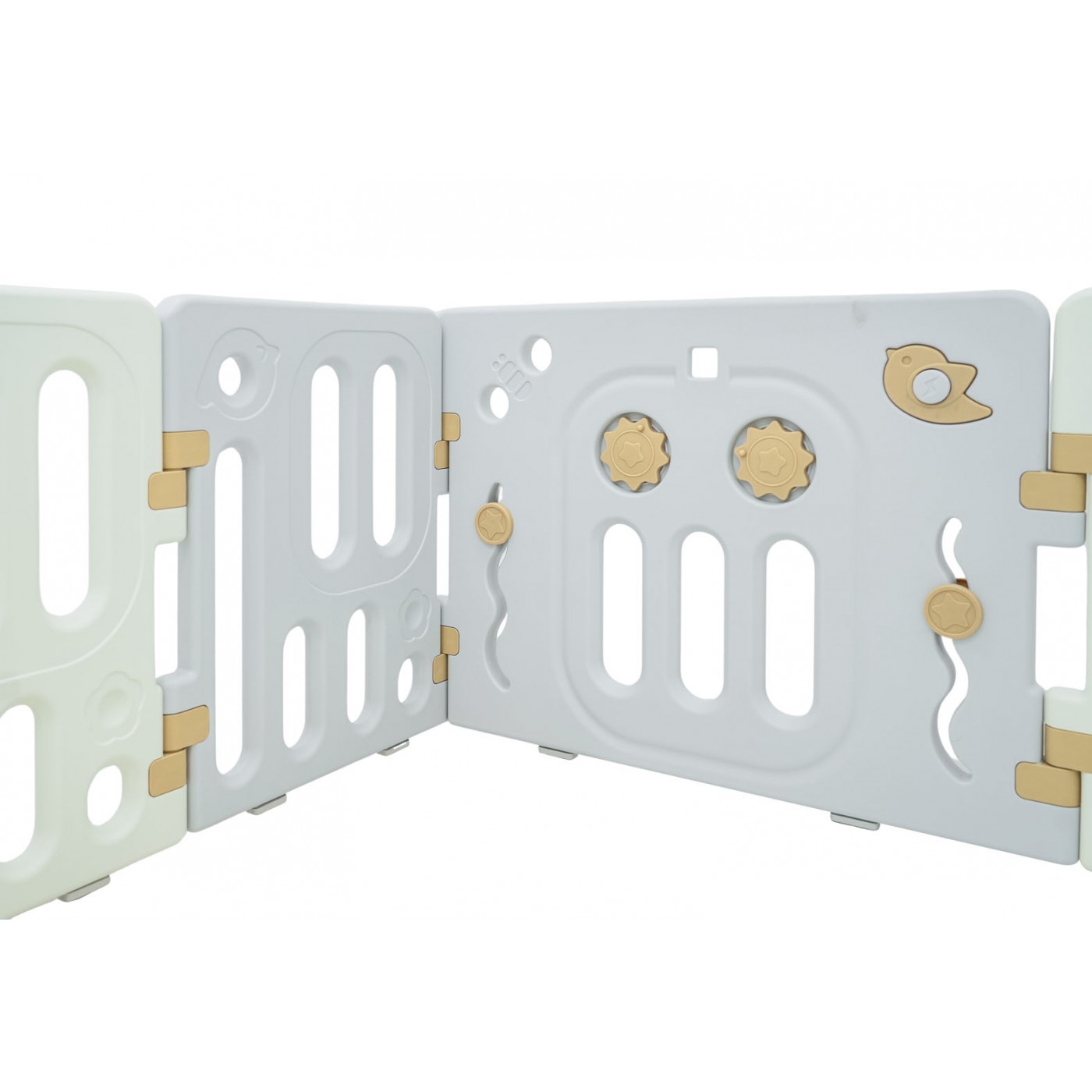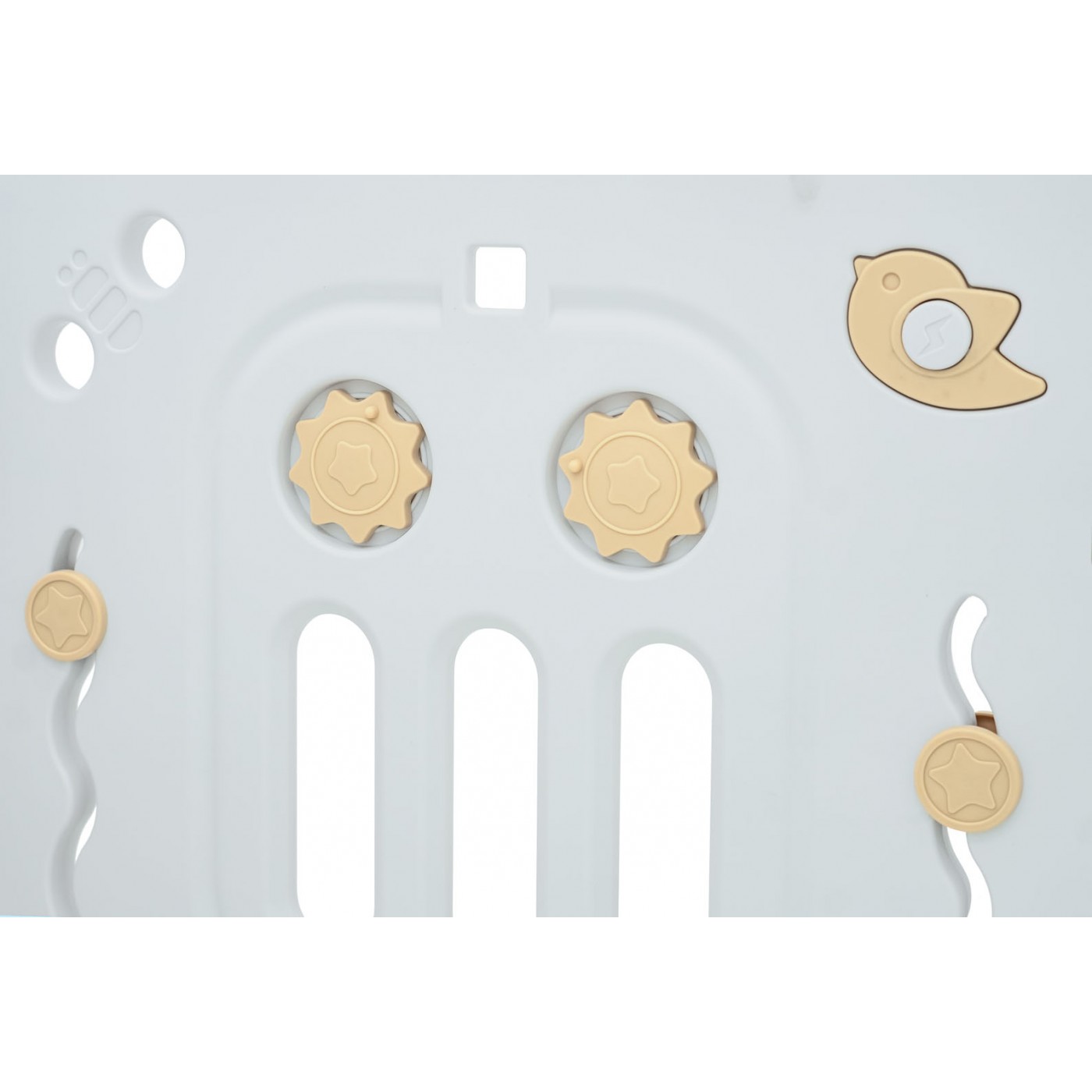Wśród paneli tworzących płotek/kojec modułowy dla dzieci, znajduje się specjalna szeroka ścianka sensoryczna. Posiada ona mini zabawy motoryczne, takie jak koła zębate do obracania, postać ptaszka z piszczałką na środku czy 2 labirynty manipulacyjne z gwiazdkami.