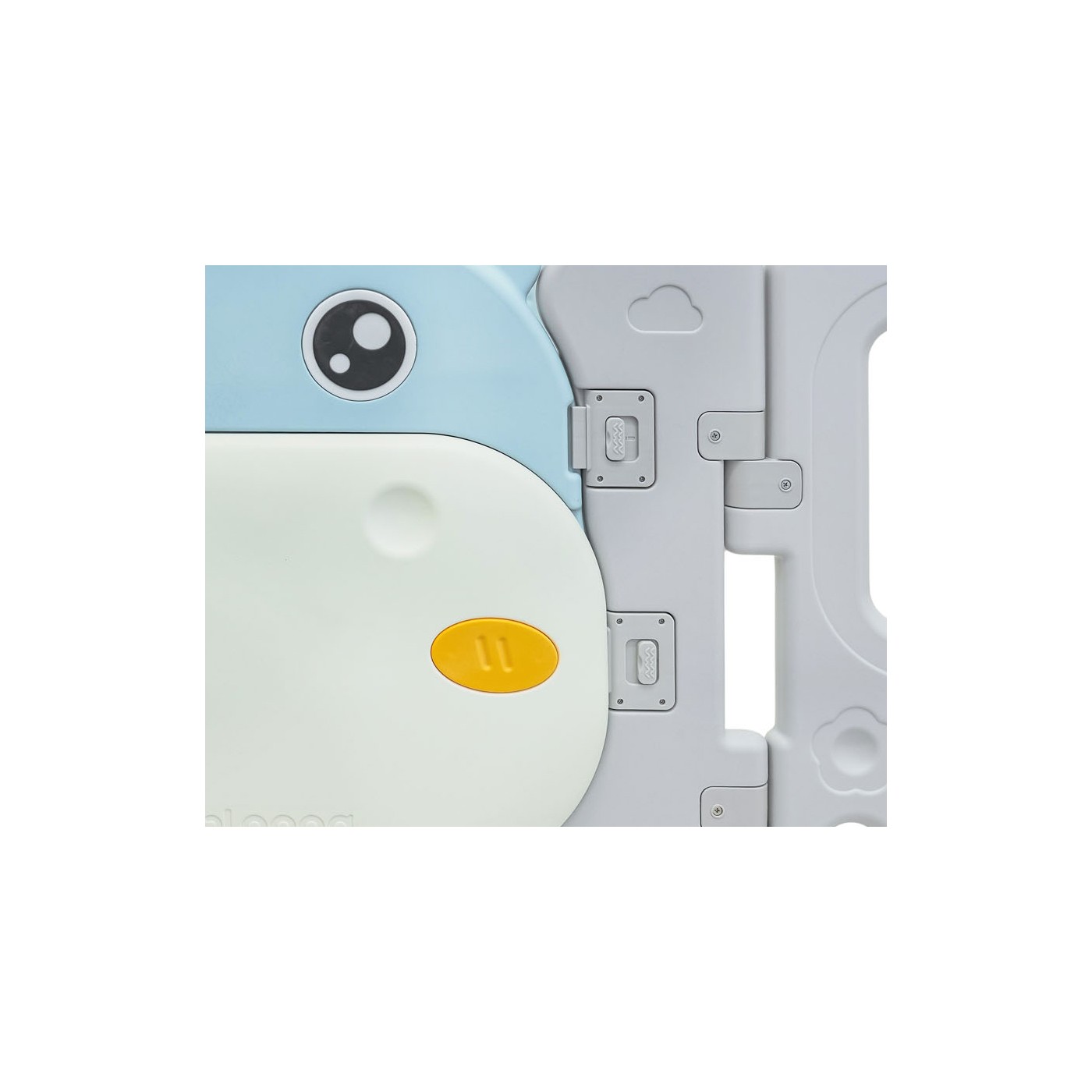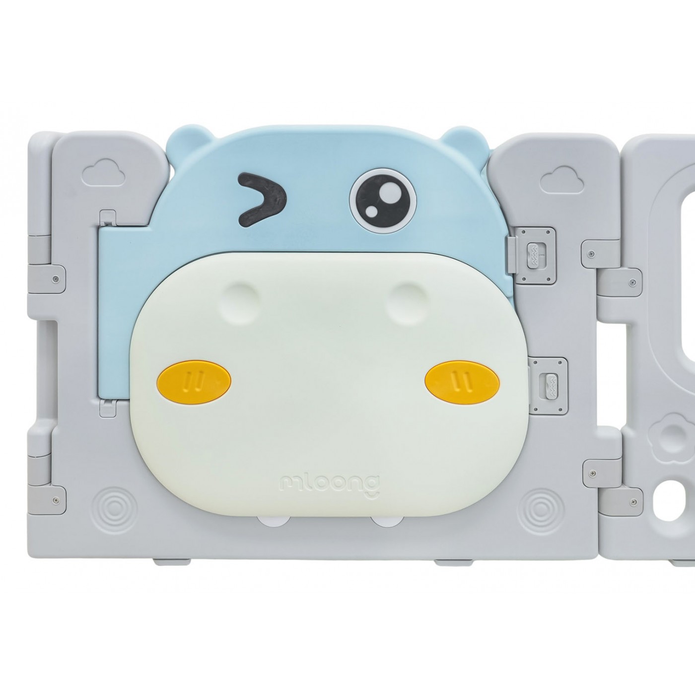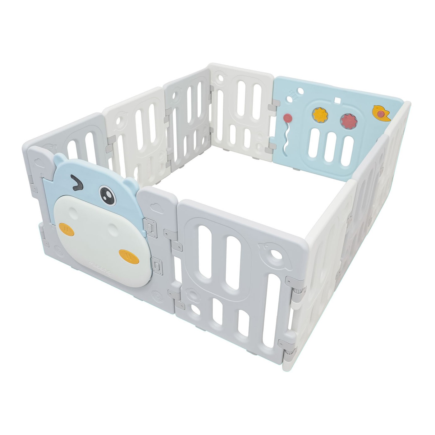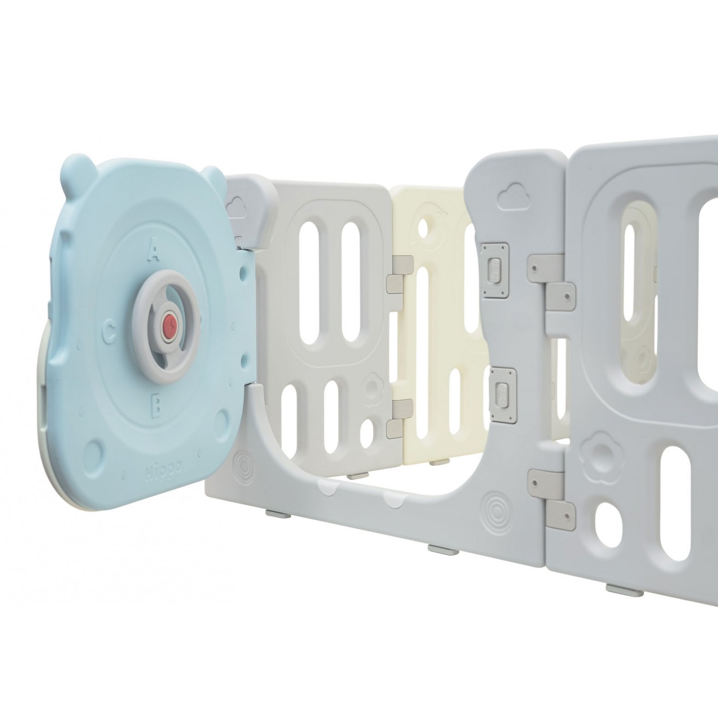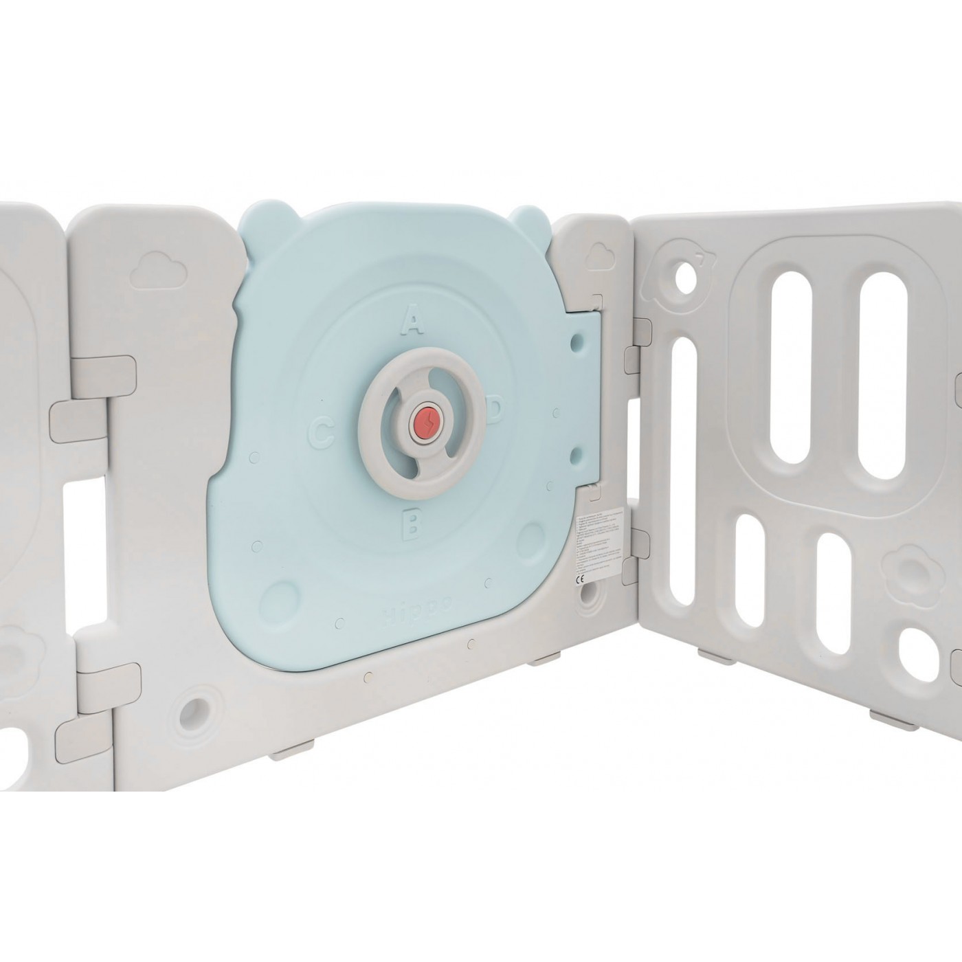 Zestaw zawiera 10 paneli, w tym jeden z bezpiecznymi drzwiczkami, które można zablokować od zewnątrz – co uniemożliwia dziecku samodzielne otwarcie i wydostanie się z płotka/kojca. Kształt drzwi przypomina głowę wesołego hipopotama, co będzie dobrze kojarzyć się najmłodszym i zachęcać ich do wejścia. Na drzwiczkach od wewnętrznej strony znajduje się obrotowa kierownica z piszczałką na środku i literami „ABCD” wokół. Zachęci to maluchy do zabawy i manipulowania kierownicą.