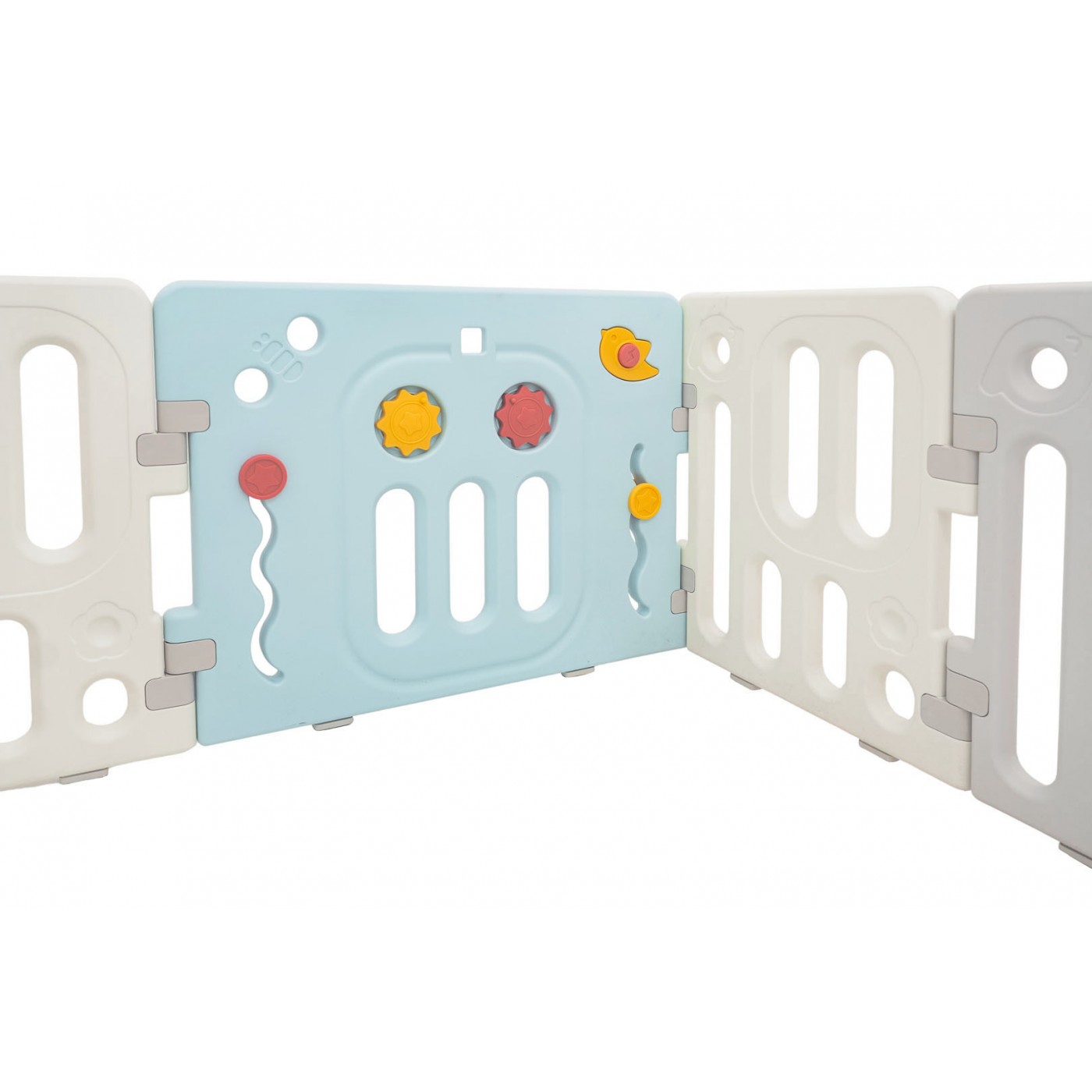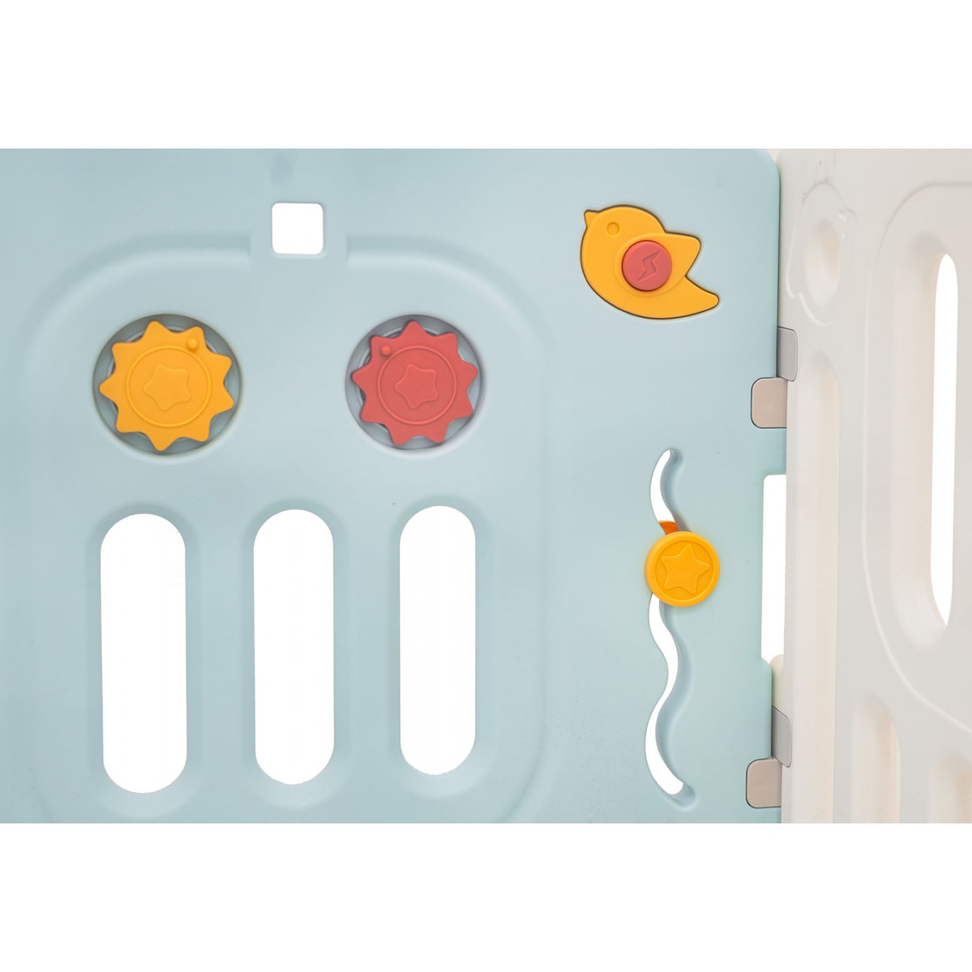 Wśród paneli tworzących modułowy płotek/kojec dla dzieci, znajduje się specjalna szeroka ścianka sensoryczna. Posiada ona mini zabawy motoryczne, takie jak koła zębate do obracania, postać ptaszka z piszczałką na środku czy 2 labirynty manipulacyjne z gwiazdkami.