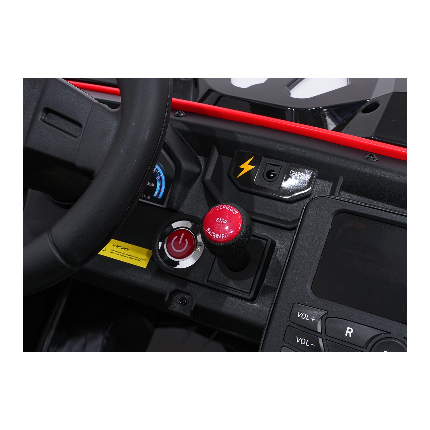 Zasilanie realizowane jest za pomocą 2 akumulatorów 12V o pojemności 14Ah, połączonych w szeregu, co daje mocny system o napięciu 24V. Uruchamianie pojazdu odbywa się przy użyciu przycisku start, który zapewnia prostotę obsługi dla najmłodszych i natychmiastową gotowość do jazdy.