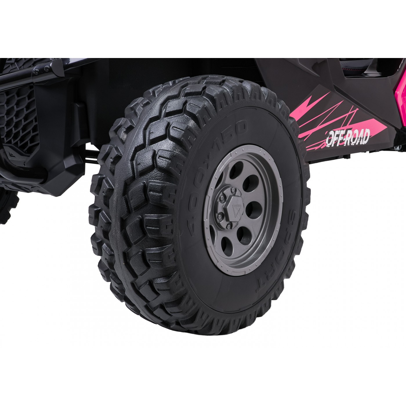 Zasilanie realizowane jest za pomocą 2 akumulatorów 12V o pojemności 14Ah, połączonych w szeregu, co daje mocny system o napięciu 24V. Uruchamianie pojazdu odbywa się przy użyciu przycisku start, który zapewnia prostotę obsługi dla najmłodszych i natychmiastową gotowość do jazdy.