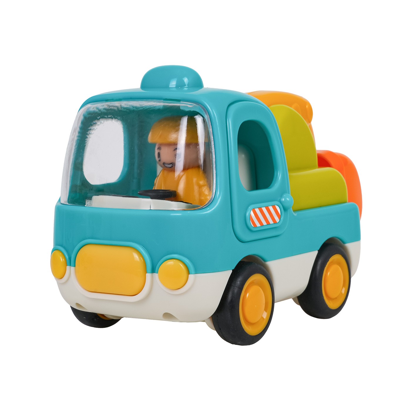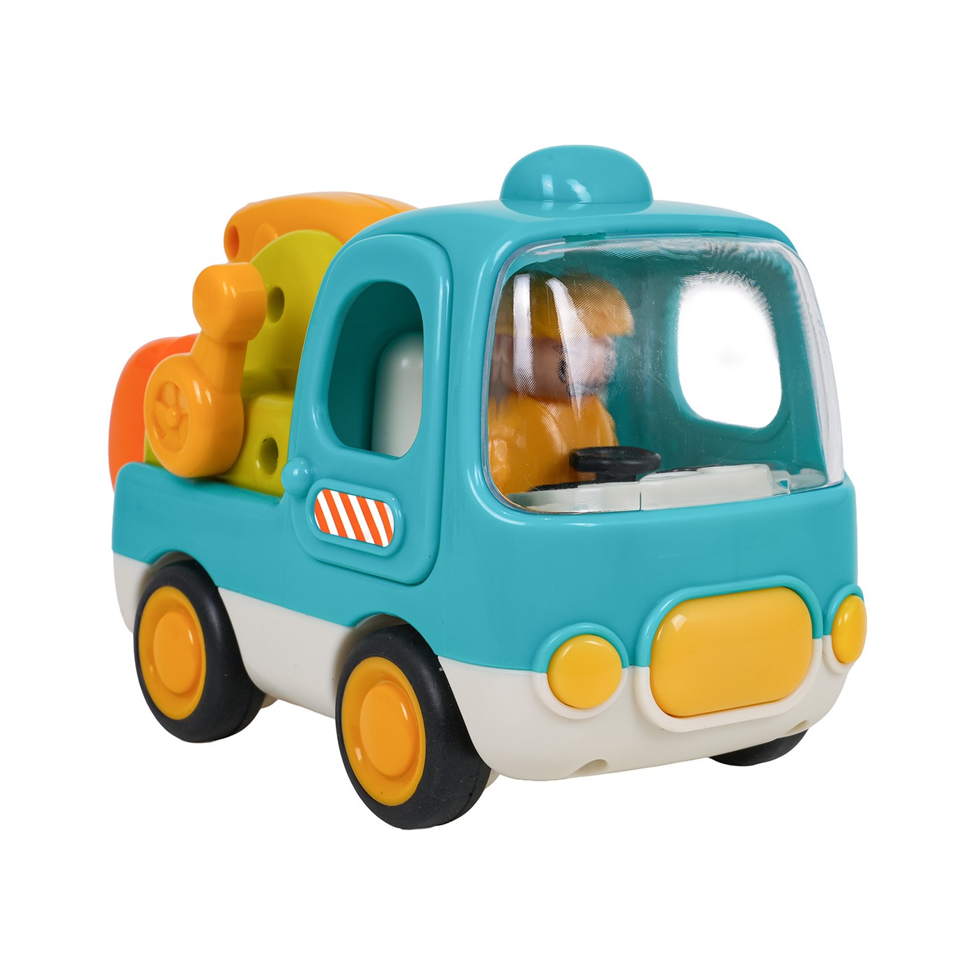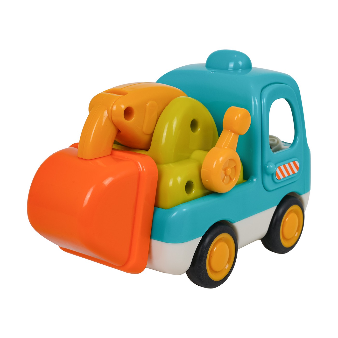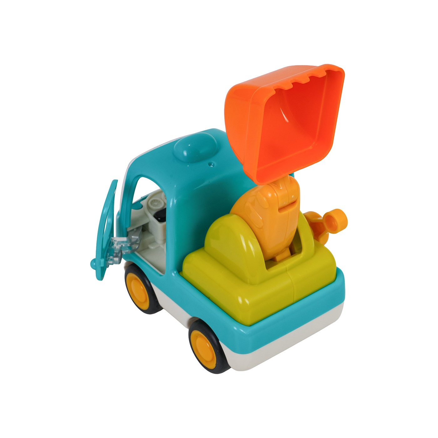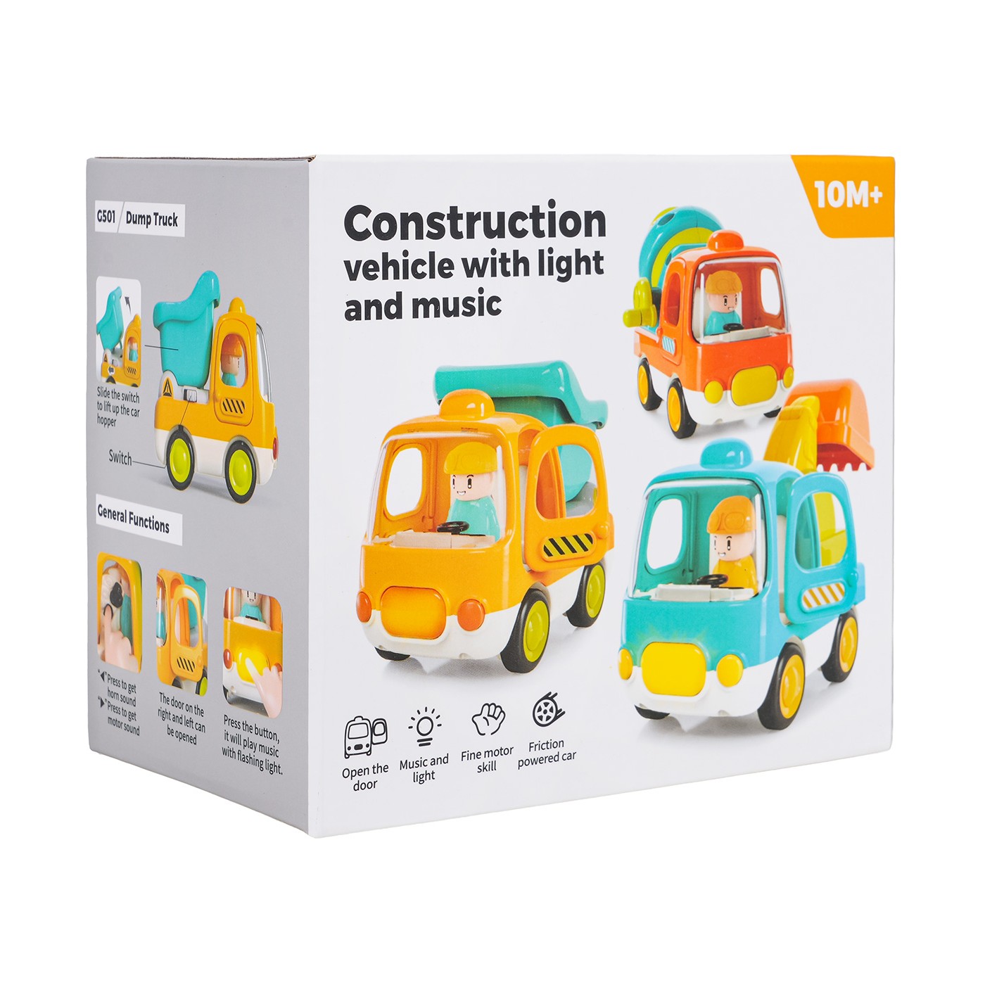 Koparka porusza się dzięki napędowi typu friction, który pozwala na łatwe przesuwanie jej po podłożu bez potrzeby stosowania dodatkowych mechanizmów. Zabawka została wyposażona w przycisk z przodu pojazdu, który uruchamia wesołe melodie i światła, a przyciski wewnątrz kabiny odtwarzają realistyczne odgłosy – klakson i dźwięk odpalania silnika.
