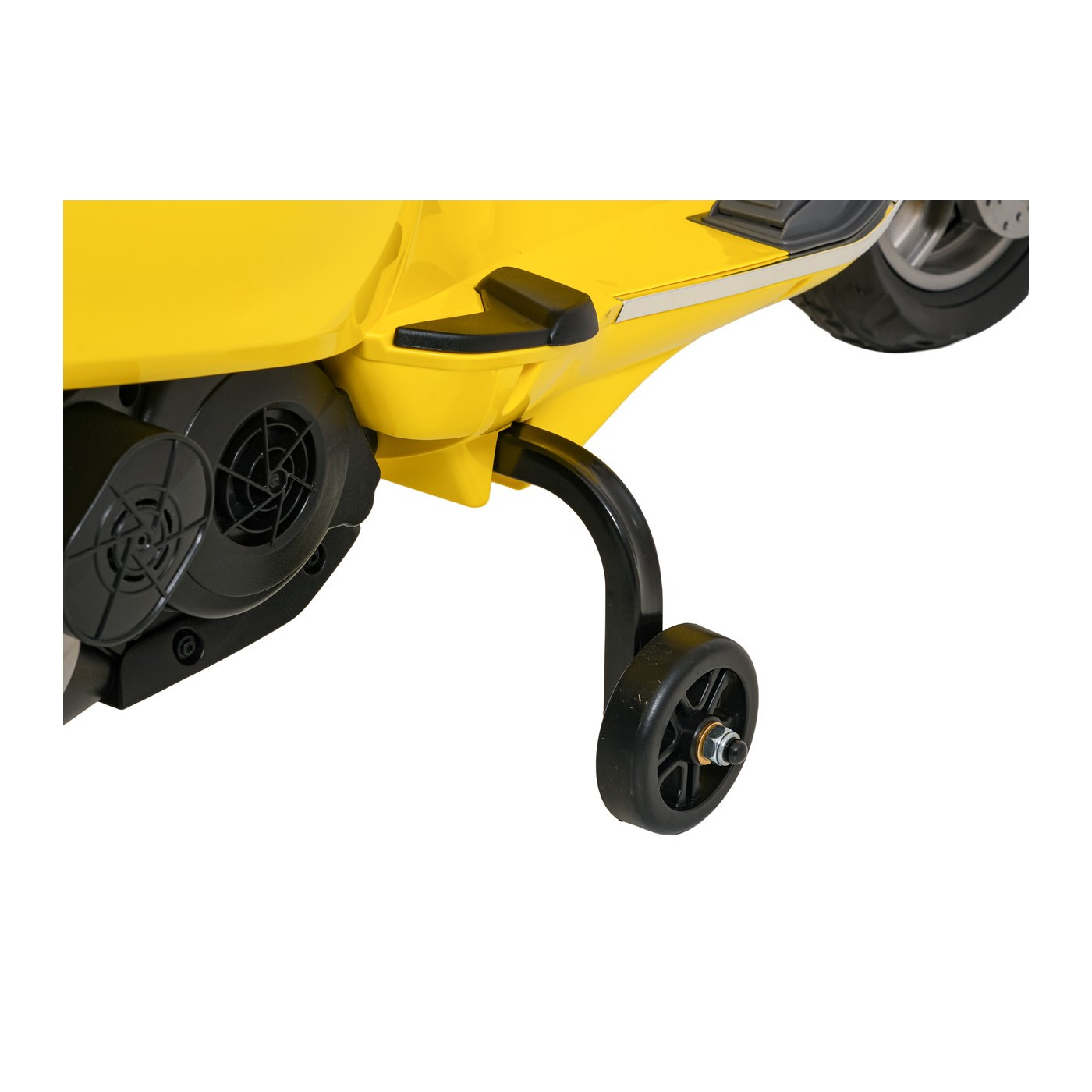 Na kierownicy znajdują się wygodne przyciski umożliwiające uruchomienie różnych dźwięków oraz realistycznego klaksonu, co sprawia, że dziecko ma kontrolę nad efektami dźwiękowymi, jak w prawdziwym skuterze. Całość tworzy kompletne, przemyślane wyposażenie multimedialne, które łączy bezpieczeństwo z funkcją zabawy i personalizacji przejażdżki.