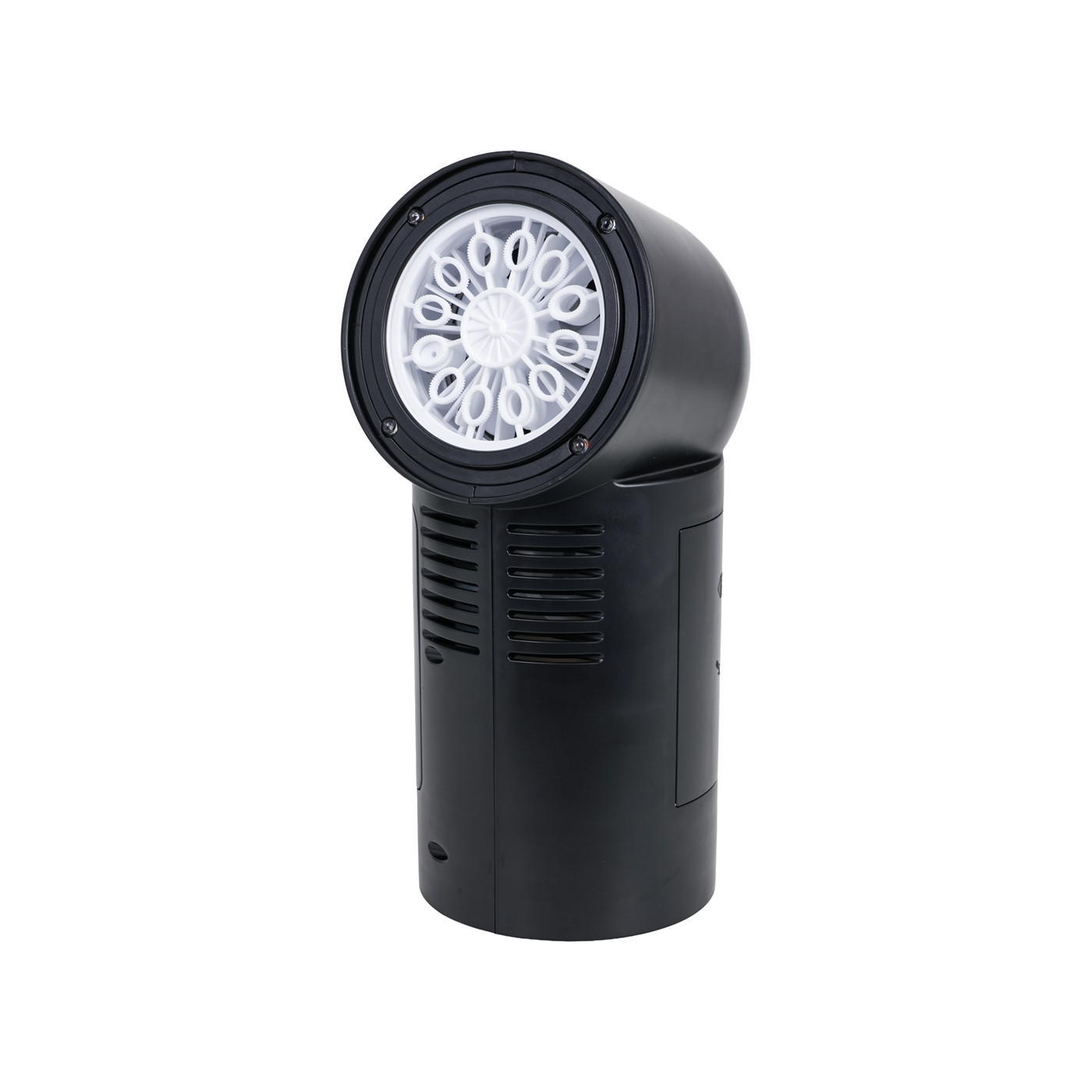 Wytwornica została wykonana z trwałego tworzywa sztucznego i wyposażona w specjalną kieszeń na zbiornik z płynem, co pozwala na bezpieczne i wygodne użytkowanie. Na górze urządzenia znajduje się przycisk odpowiedzialny za sterowanie obrotem – możliwy jest obrót o 90° lub 180°, w zależności od liczby naciśnięć.
