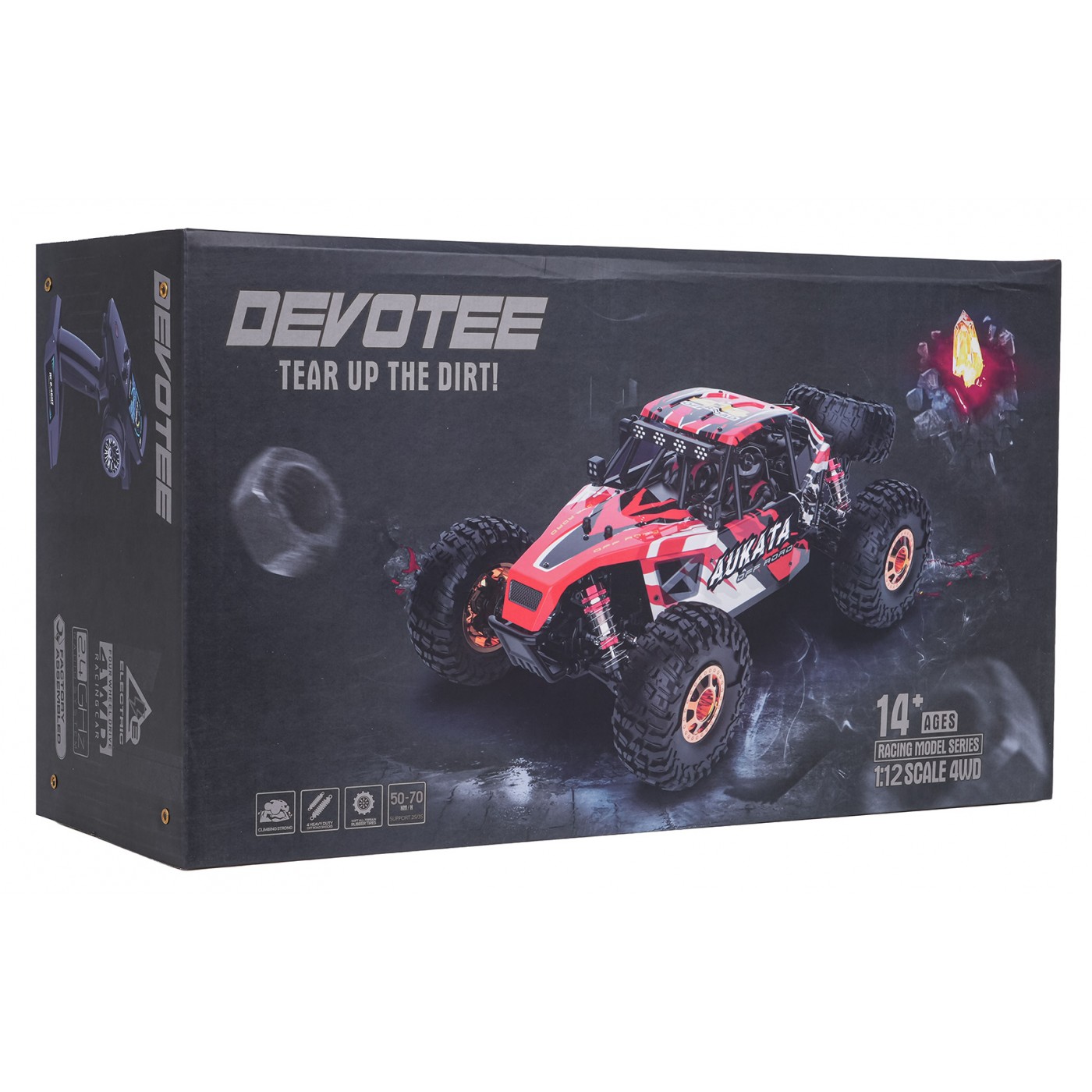 Crawler został wykonany z najwyższej jakości komponentów – metalowej karoserii i podwozia, co zwiększa jego odporność na uderzenia i intensywną eksploatację. Pojazd wyposażono w zmodyfikowany układ przeniesienia napędu, bezszczotkowy napęd 4x4, aluminiowe regulowane amortyzatory oraz antypoślizgowe gumowe opony o głębokim bieżniku, które zapewniają przyczepność na każdej nawierzchni. Model osiąga imponującą prędkość około 50 km/h w zaledwie 3 sekundy, a jego sterowanie odbywa się za pomocą pilota 2,4 GHz z pełnym zakresem ruchu. W zestawie znajduje się wydajny akumulator 7,4 V oraz dodatkowe koło zapasowe.