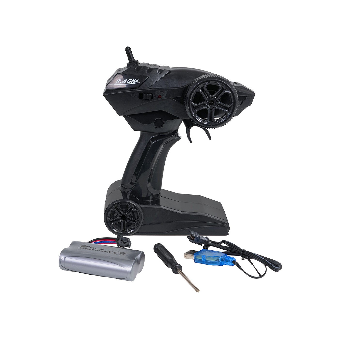 Pojazd sterowany jest za pomocą pilota 2,4 GHz z regulacją skrętu. Wbudowane oświetlenie LED umożliwia jazdę po zmroku, zwiększając realizm zabawy. Zasilanie odbywa się za pomocą akumulatora 7,4 V (w zestawie), natomiast pilot wymaga 3 baterii AA (brak w zestawie). Czas ładowania pojazdu to około 3 godziny, a jazdy – około 10 minut.