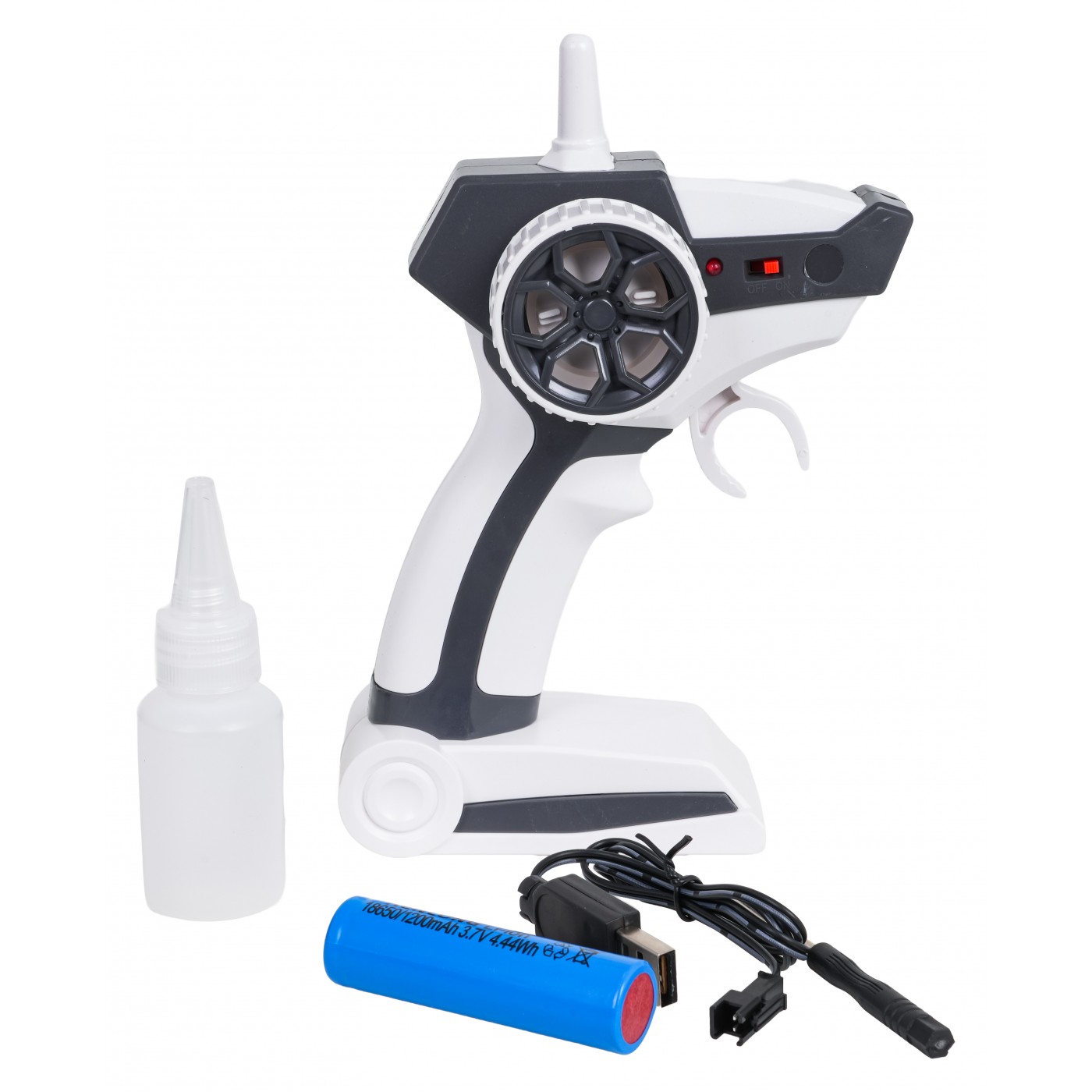 Sprężynowe zawieszenie każdego z kół pozwala pojazdowi wspinać się po nierównościach, co dodatkowo podnosi realizm jazdy. Po napełnieniu zbiorniczka wodą uruchamia się efekt dymu z tyłu pojazdu, co czyni zabawę bardziej angażującą. Zasilanie zapewnia akumulator 3,7 V (w zestawie), a pilot wymaga dwóch baterii AA (brak w zestawie). Czas ładowania wynosi około 2 godziny, a jazdy – około 10 minut.
