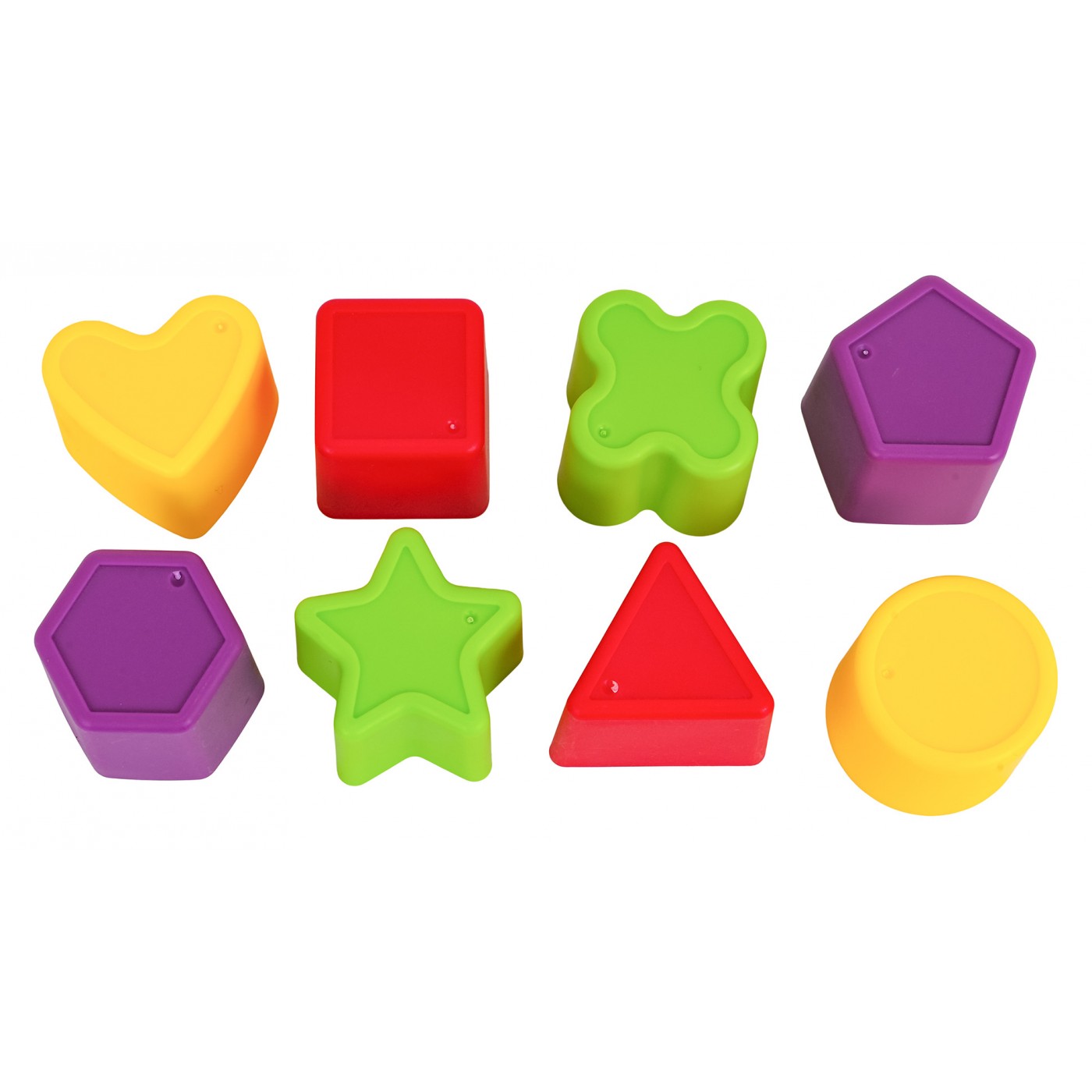 - 8 klocków o różnych kształtach i kolorach – każdy ok. 4 cm wysokości.