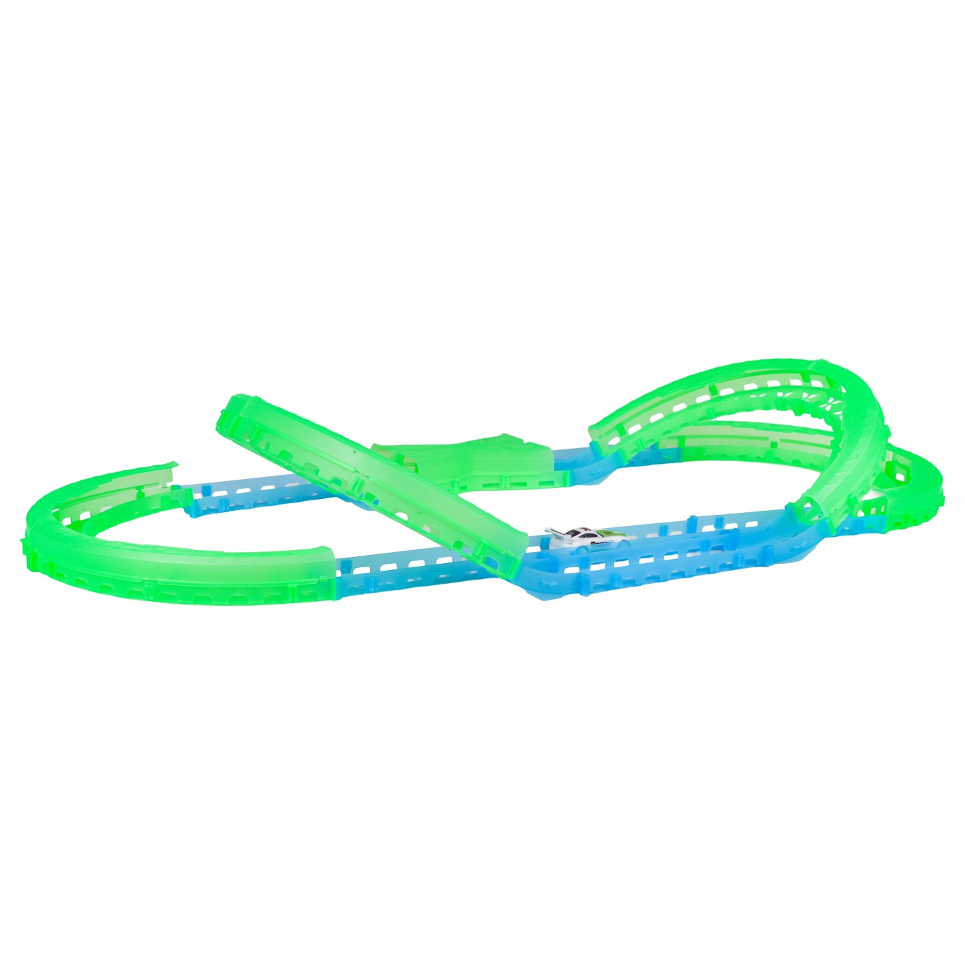 Pilot wymaga 2 baterii typu AAA (brak w zestawie) i umożliwia sterowanie ruchem pojazdu do przodu. Elementy toru zostały wykonane z materiału fluorescencyjnego, który świeci w ciemności, dzięki czemu całość prezentuje się niezwykle atrakcyjnie wizualnie i przyciąga wzrok podczas zabawy.