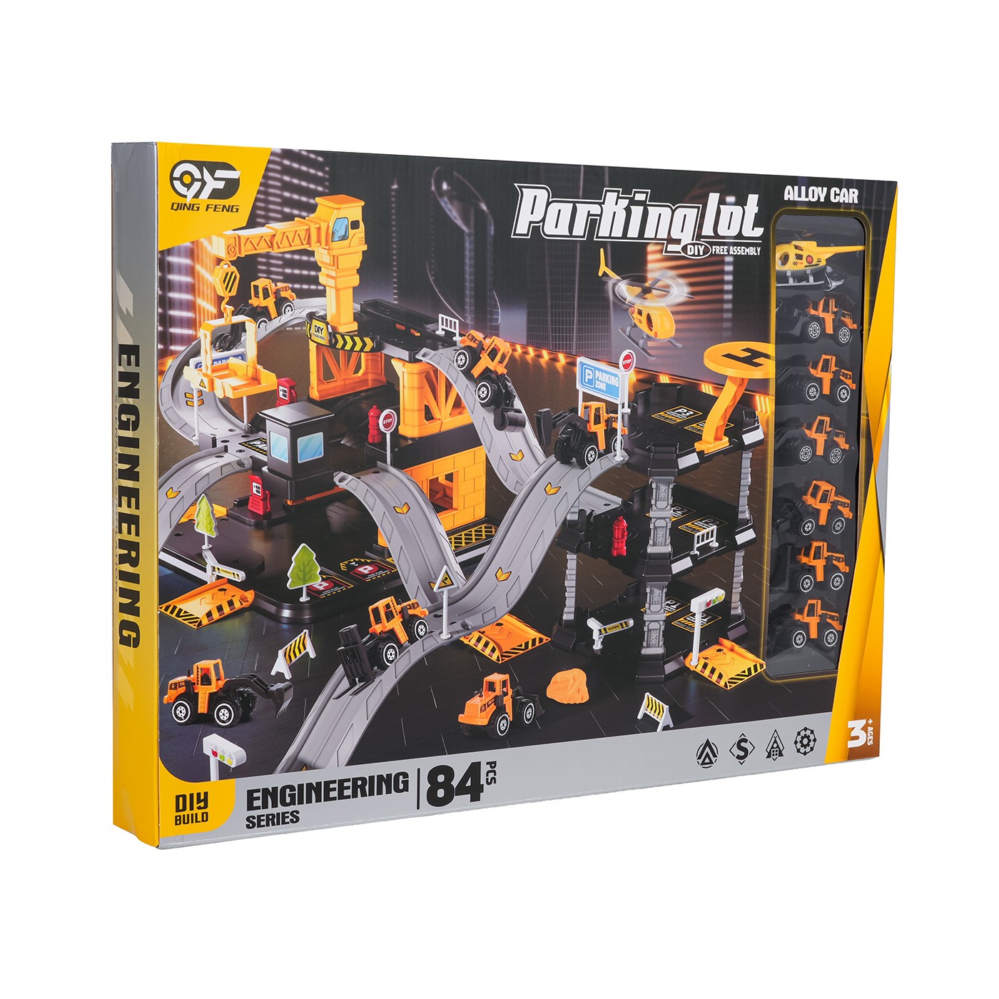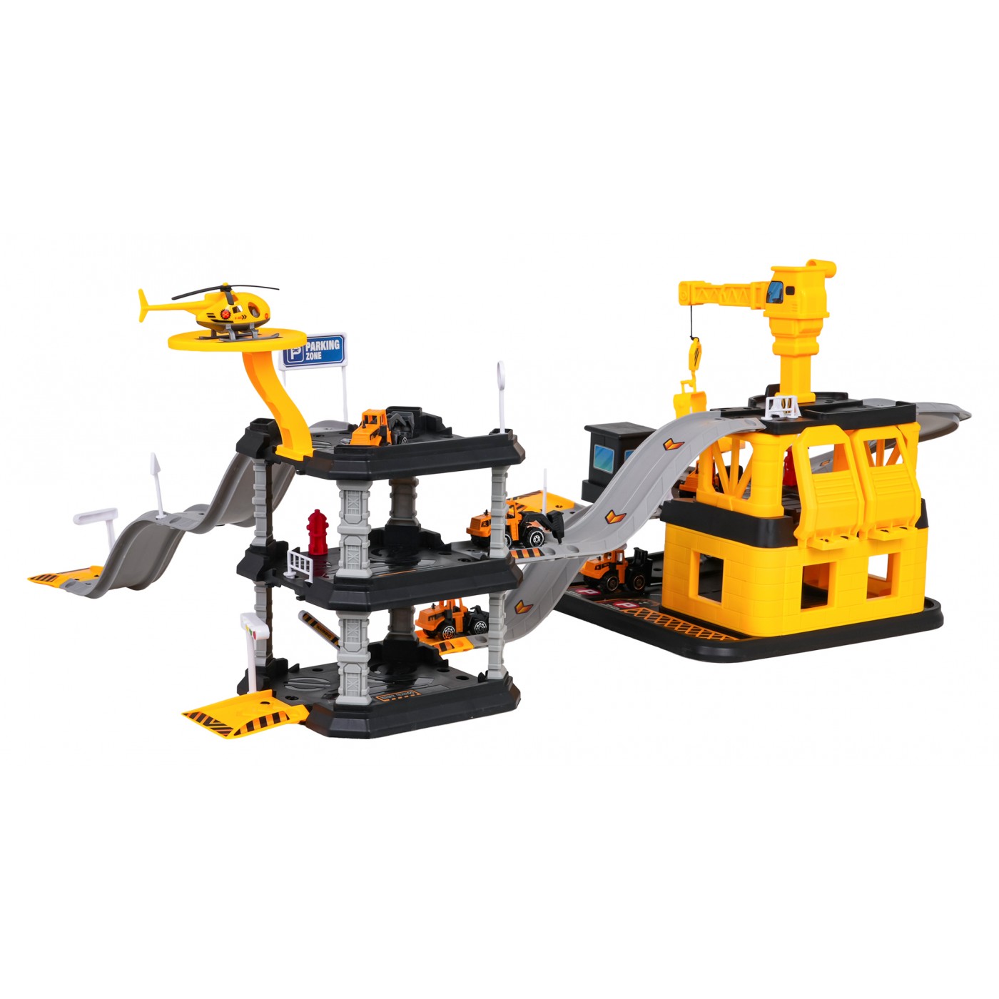 W zestawie znajduje się 6 pojazdów budowlanych o metalowych karoseriach i ruchomych elementach: koparka, walec, ładowarka, wózek widłowy, pojazd z turem oraz pojazd z młotem pneumatycznym. Dodatkowo całość uzupełnia helikopter, który może lądować na dachu parkingu. Wszystkie elementy wykonano z trwałych i bezpiecznych materiałów, a zjeżdżalnia łączy dwa główne człony konstrukcji: parking i plac budowy. Montaż jest prosty i intuicyjny, a po złożeniu zestaw nie zajmuje dużo miejsca, mimo swojej rozbudowanej formy.