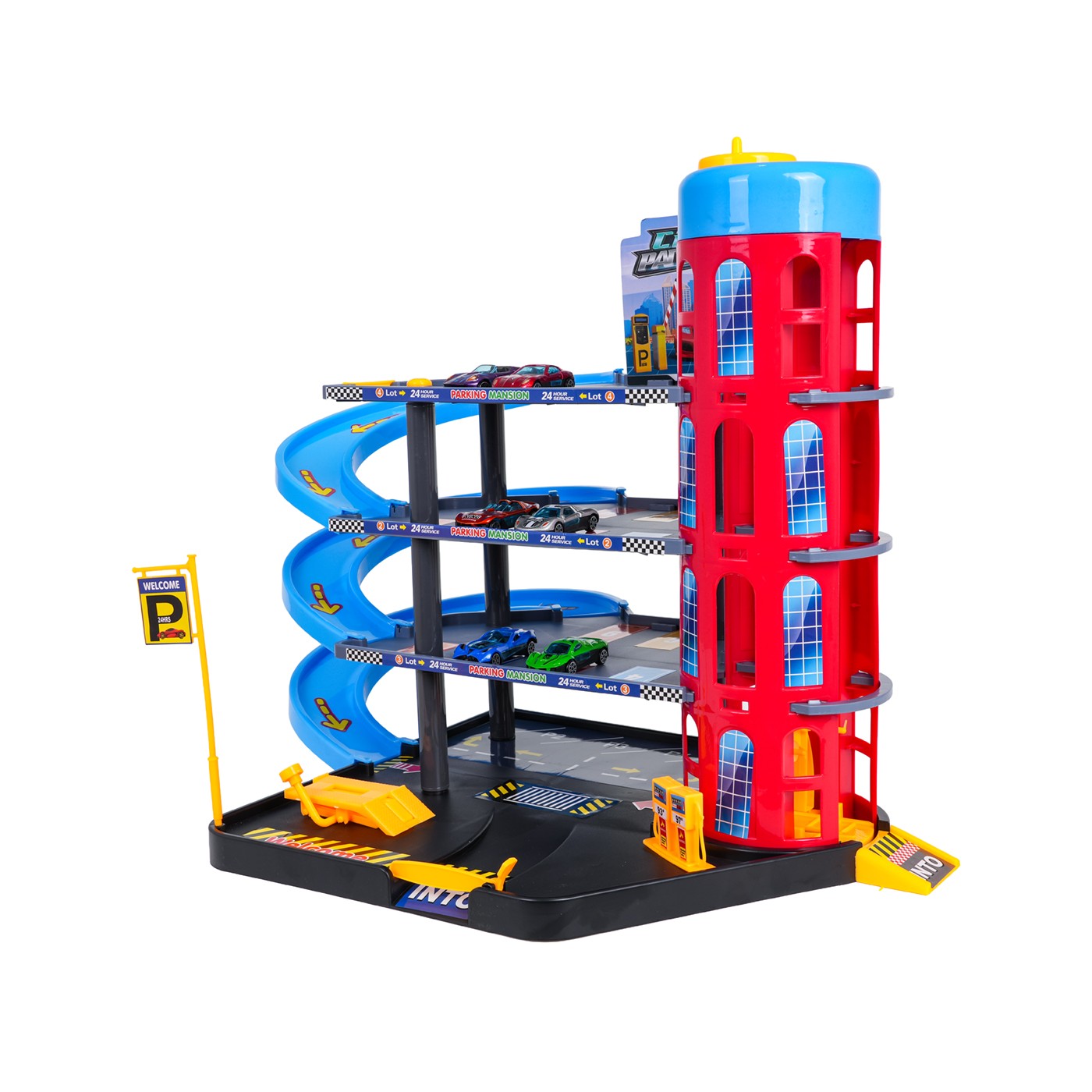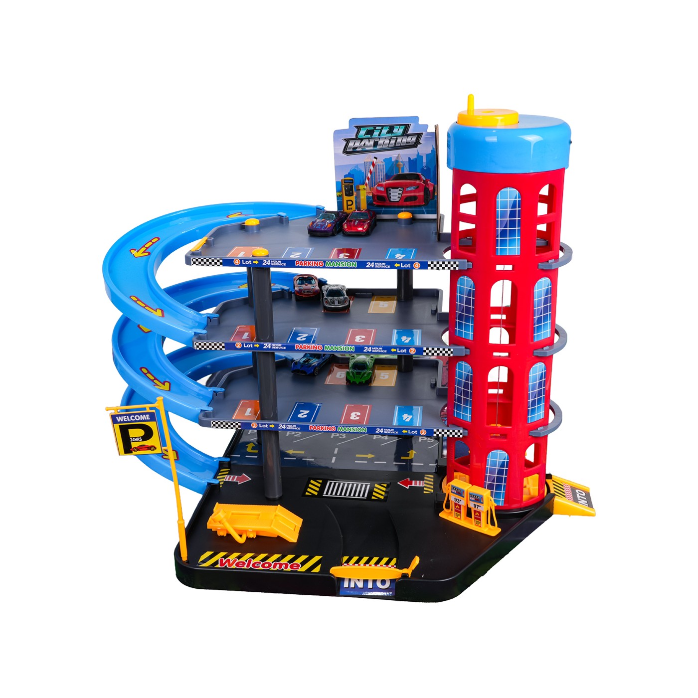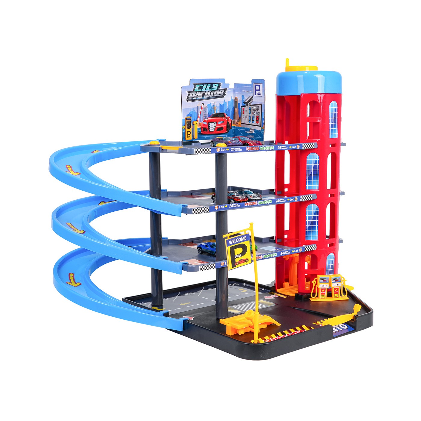 Zestaw zawiera dużą, wielopoziomową strukturę parkingową z miejscami parkingowymi, stacją benzynową, podnośnikiem samochodowym oraz manualną windą obsługiwaną za pomocą korbki. Każdy poziom połączony jest z osobną zjeżdżalnią, co umożliwia autkom szybką i efektowną jazdę w dół.