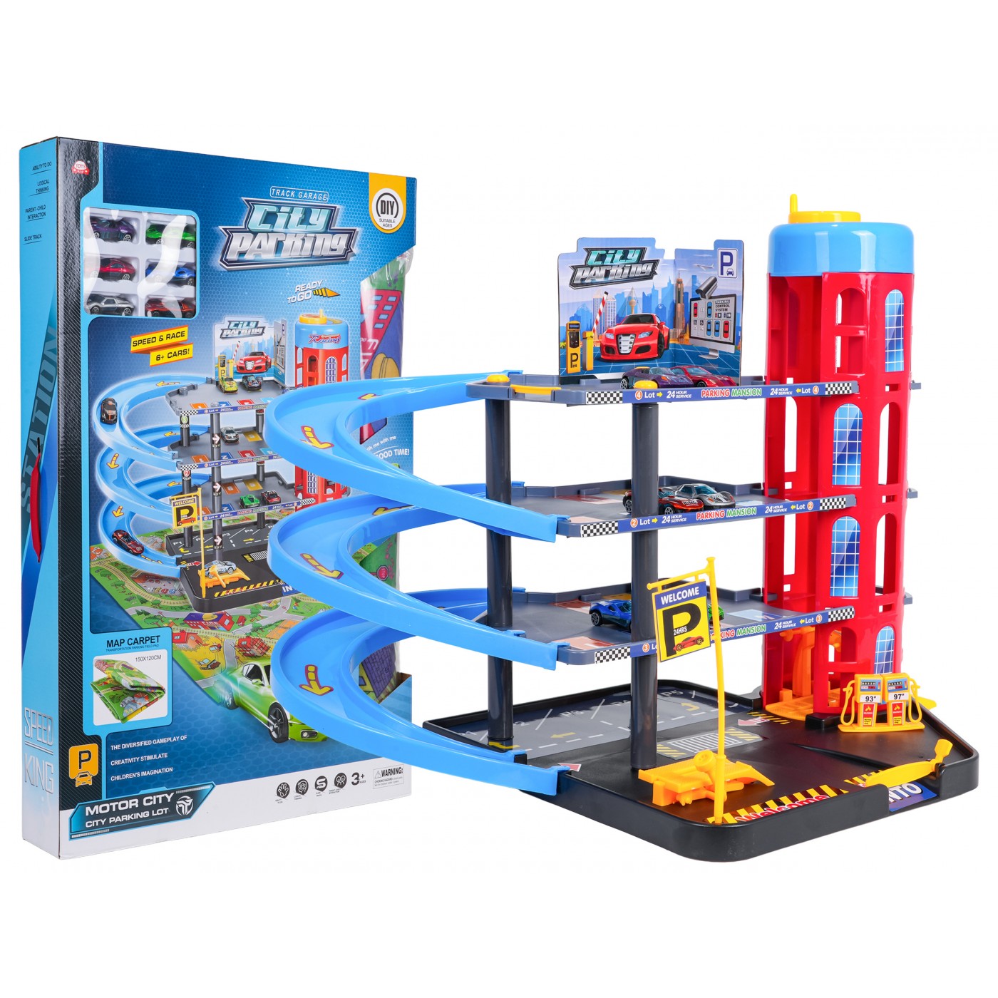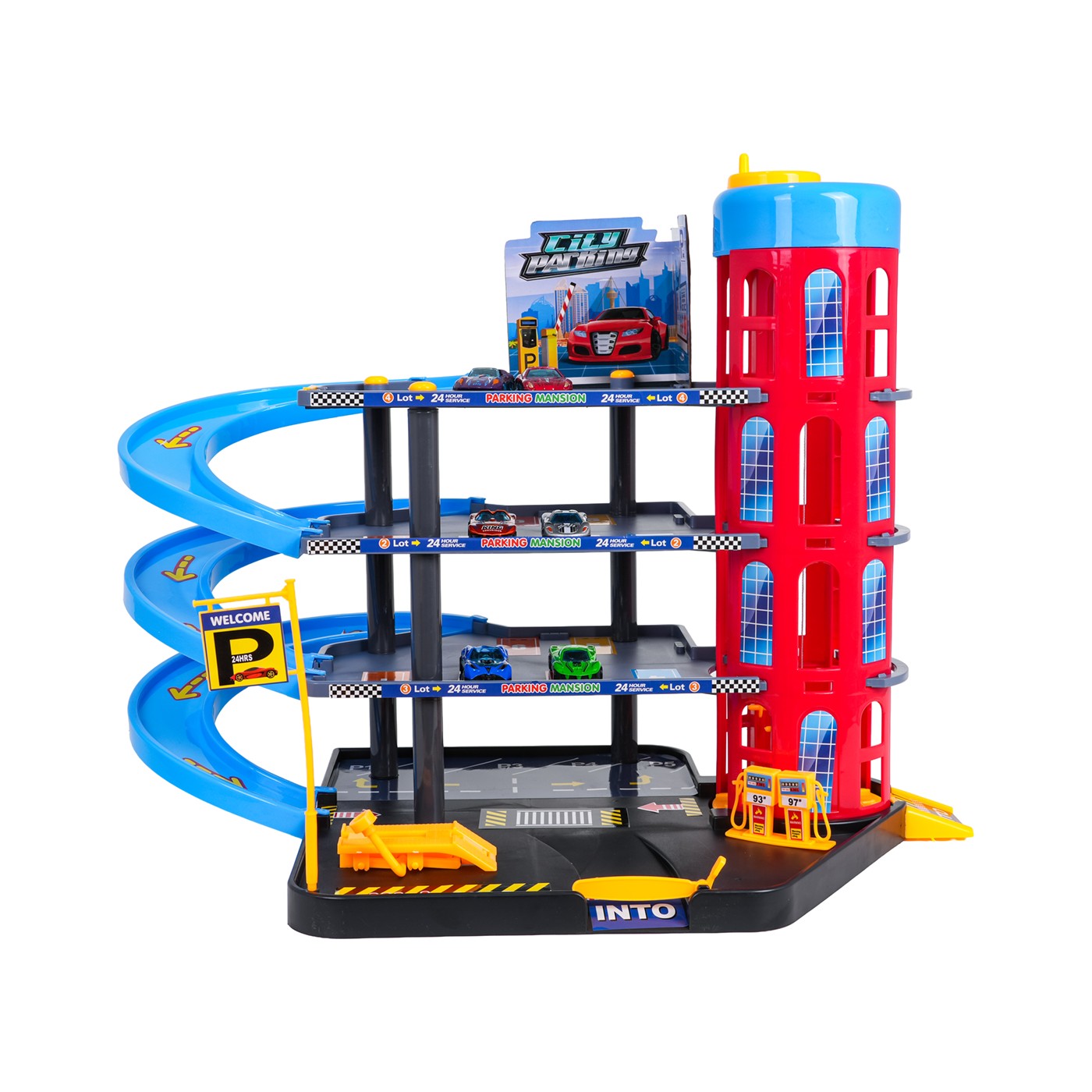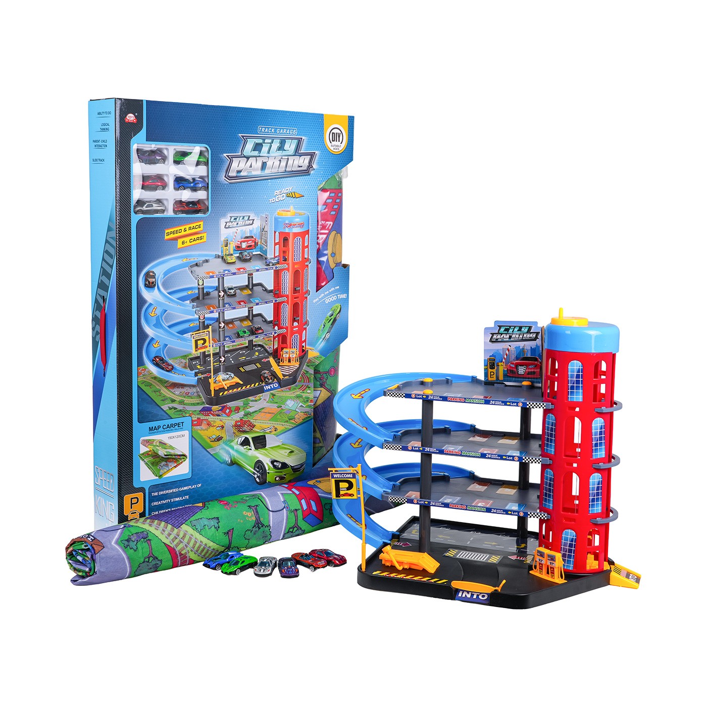 Zestaw zawiera dużą, wielopoziomową strukturę parkingową z miejscami parkingowymi, stacją benzynową, podnośnikiem samochodowym oraz manualną windą obsługiwaną za pomocą korbki. Każdy poziom połączony jest z osobną zjeżdżalnią, co umożliwia autkom szybką i efektowną jazdę w dół.