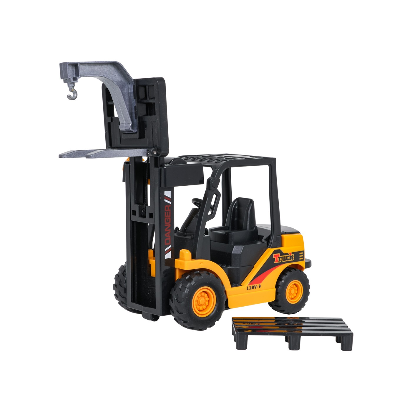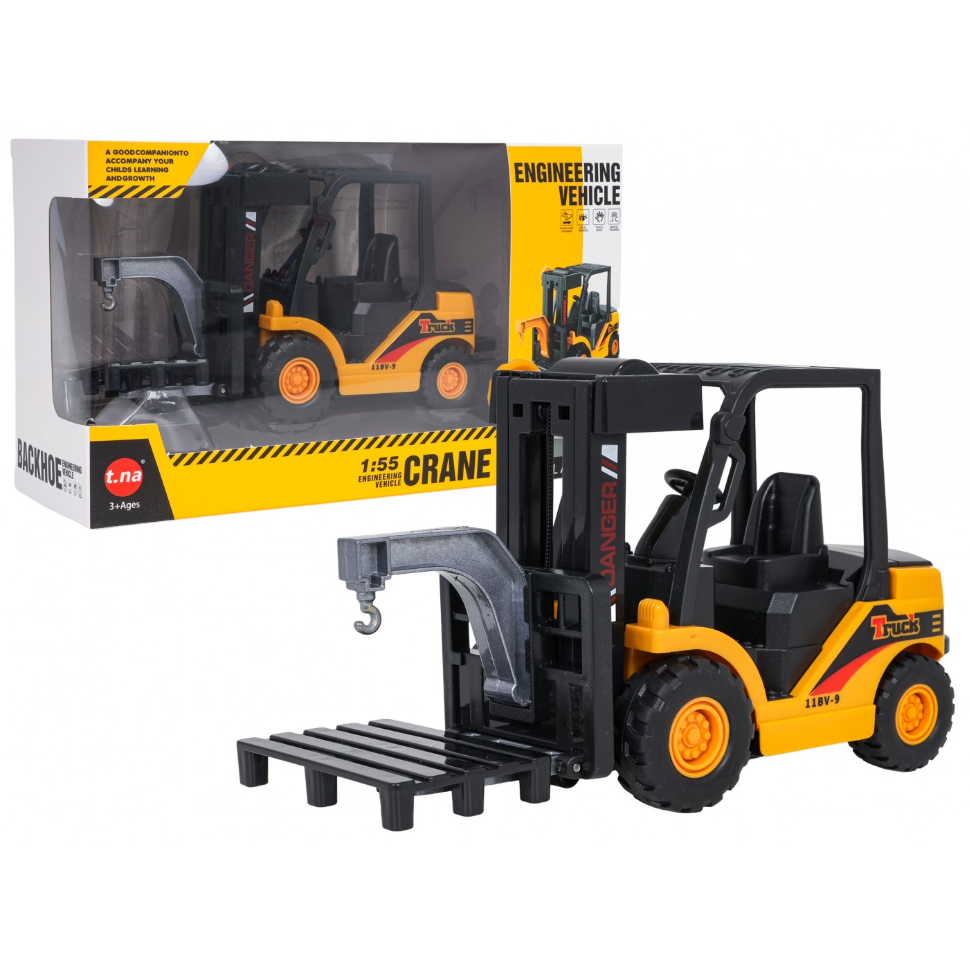 Zabawka została wykonana z wytrzymałego plastiku oraz metalowych wideł i haka, odpornych na uszkodzenia i intensywne użytkowanie. Wózek widłowy dla dzieci wyposażono w napęd frykcyjny umieszczony na tylnych kołach, co pozwala na swobodne poruszanie pojazdu do przodu i tyłu.