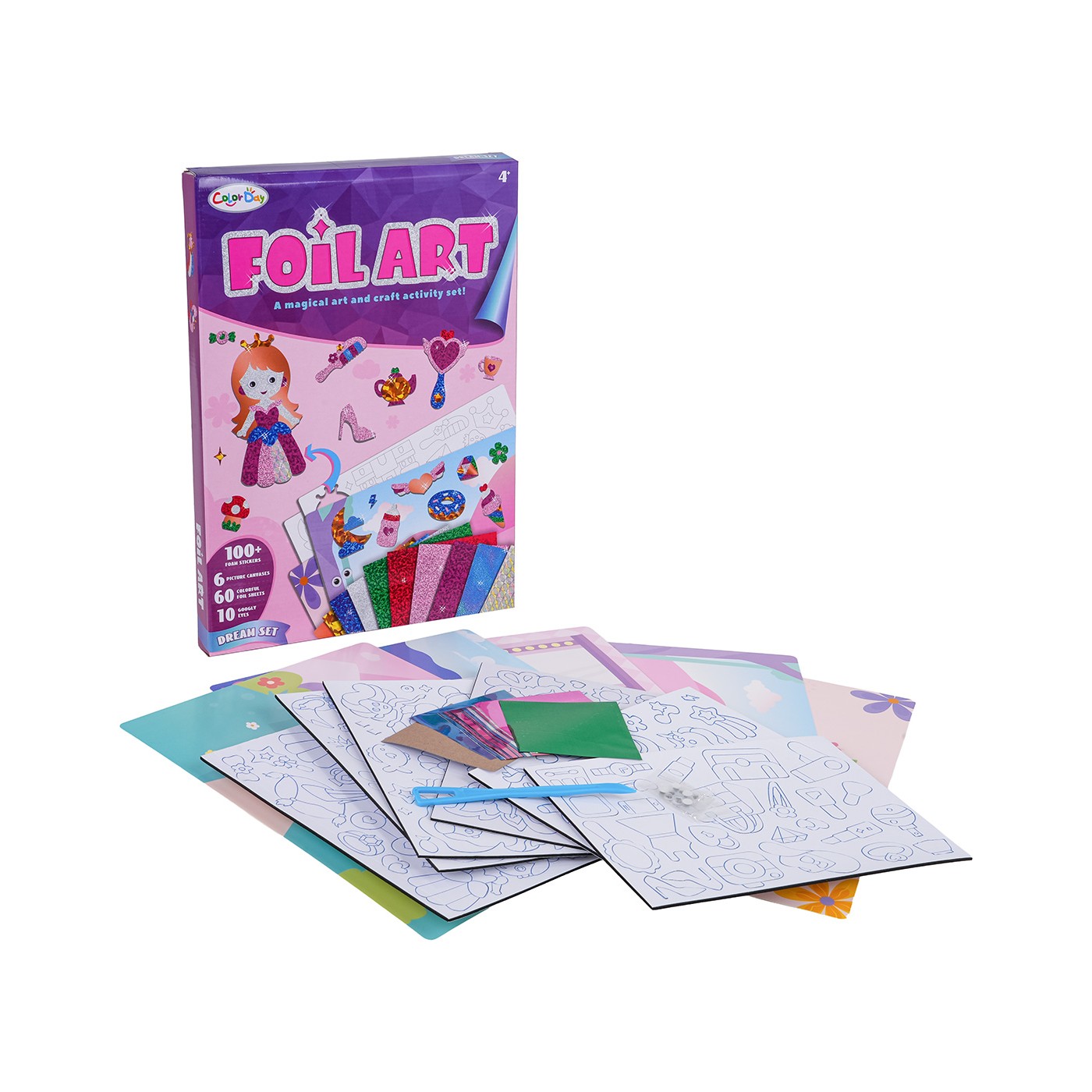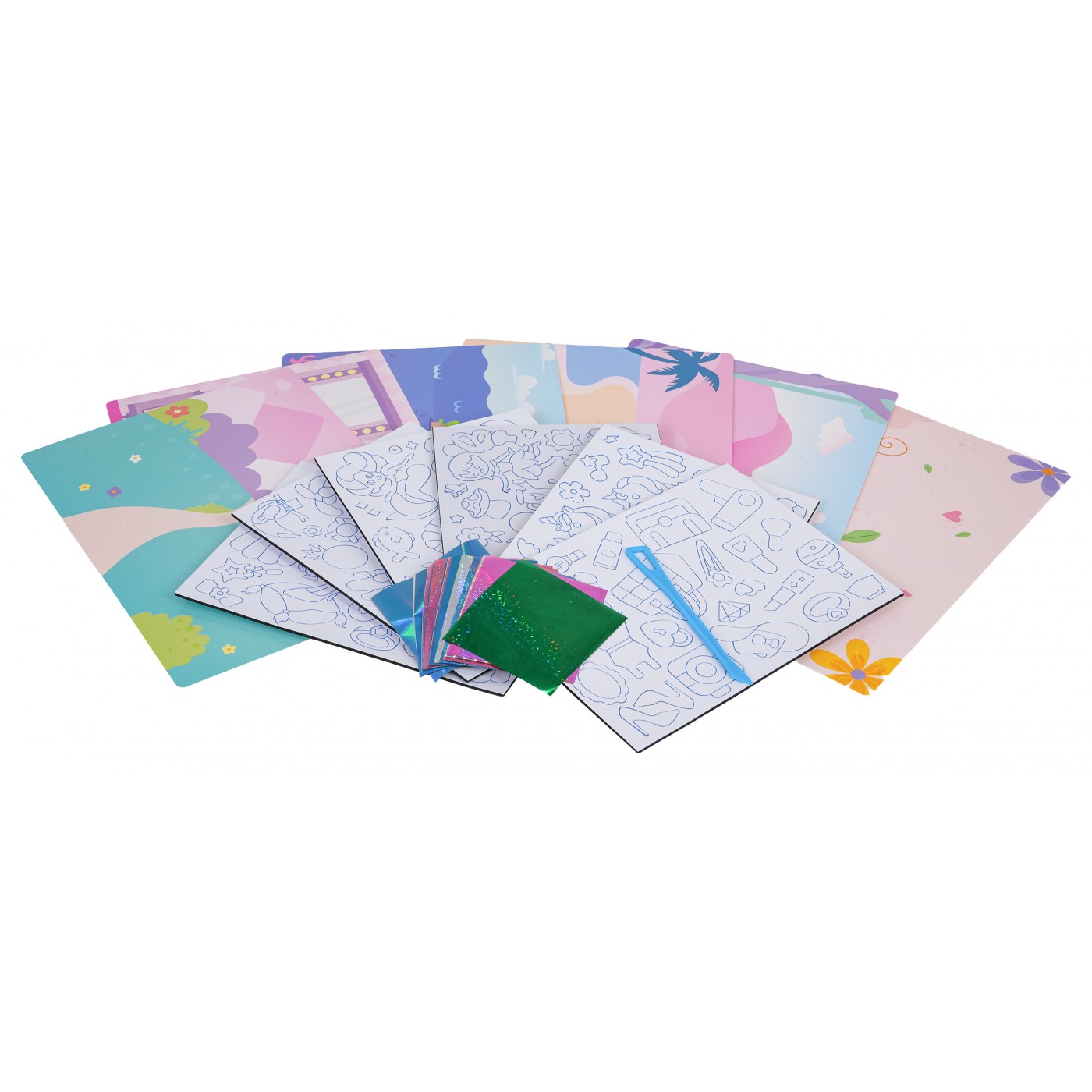 Komplet zawiera sześć szablonów z różnorodnym tłem, zestaw piankowych naklejek w tematyce księżniczek, syrenek, morskich stworzeń i magicznych akcentów, brokatowy papier oraz poręczną szpatułkę do pracy z naklejkami. Proces tworzenia polega na usunięciu papierowej osłonki z naklejki, nałożeniu na nią brokatowego papieru, a następnie przyklejeniu gotowego elementu na wybrany szablon. Wszystkie materiały są bezpieczne dla dzieci i łatwe w użyciu, co sprawia, że zabawa nie wymaga pomocy dorosłych i sprzyja samodzielności.