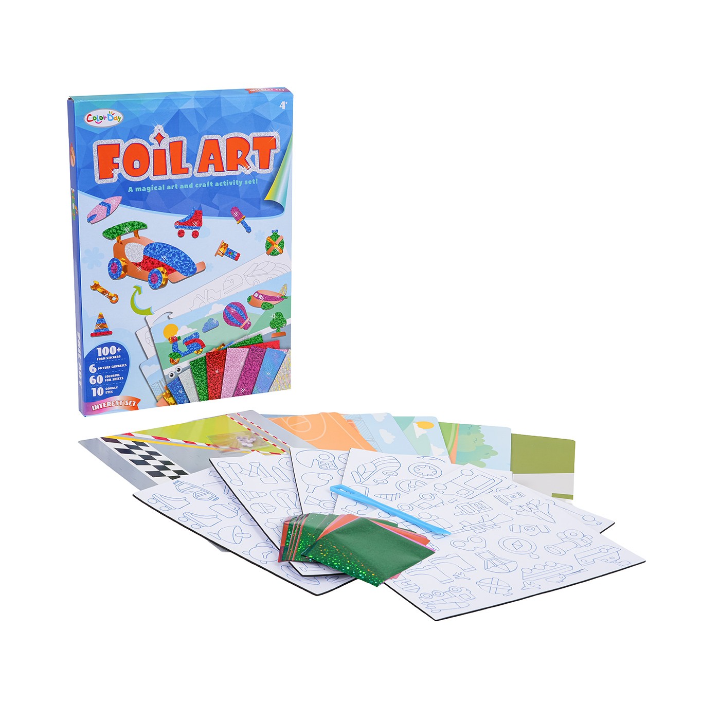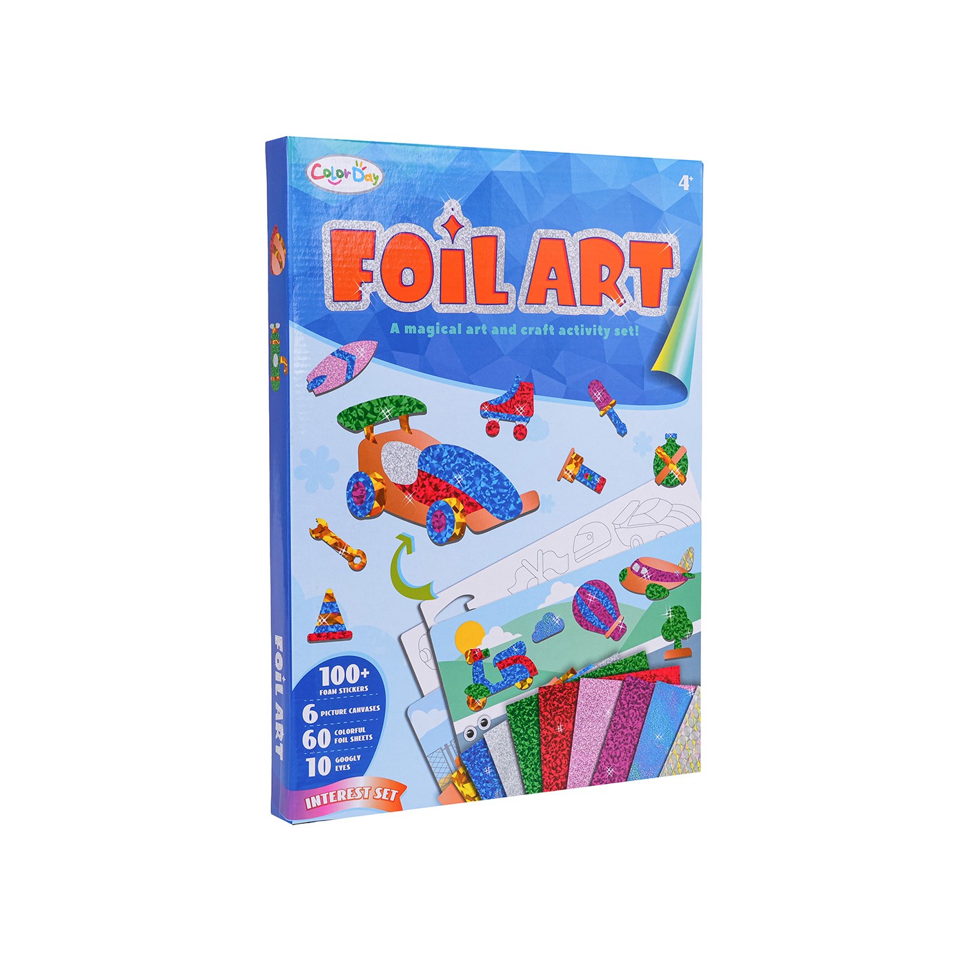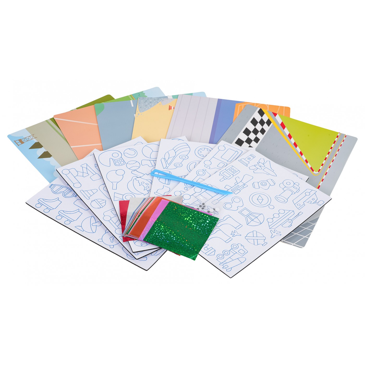 W skład zestawu wchodzi sześć tematycznych szablonów z tłem, piankowe naklejki przedstawiające pojazdy i elementy związane z motoryzacją, brokatowy papier oraz praktyczna szpatułka do pracy z naklejkami. Całość została wykonana z materiałów bezpiecznych dla dzieci, bez ostrych krawędzi i toksycznych dodatków.