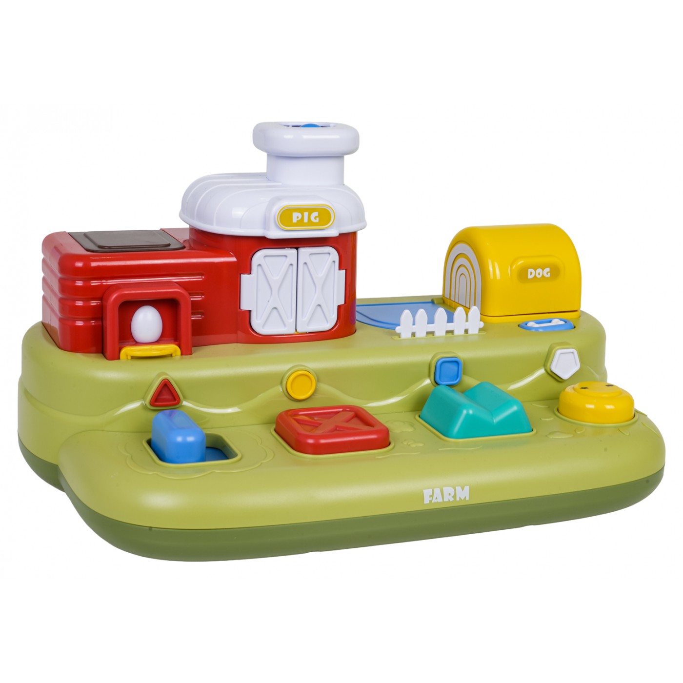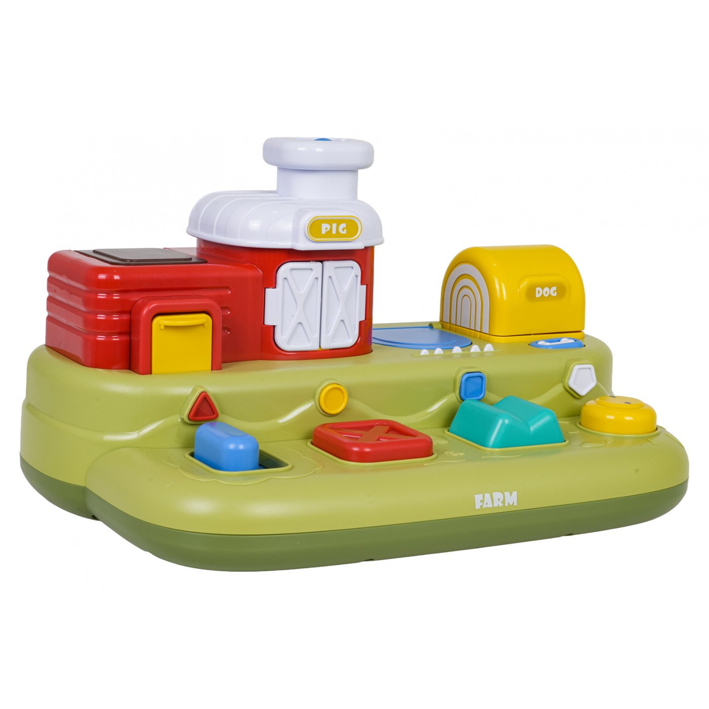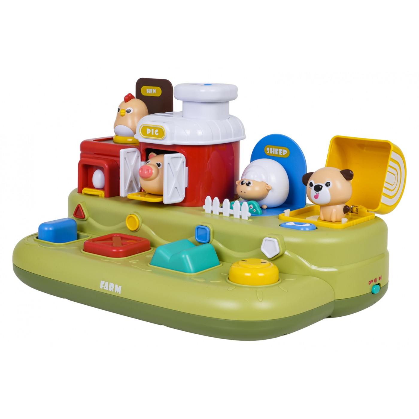 Zabawka została wykonana z trwałych, bezpiecznych materiałów, pozbawionych ostrych krawędzi, co czyni ją odpowiednią dla najmłodszych użytkowników. Każdy przycisk ma inny kształt i sposób działania, co wpływa na rozwój motoryki małej i koordynacji wzrokowo–ruchowej. Po uruchomieniu mechanizmu w boksie pojawiają się kolejno: kurczak, świnka, owieczka i piesek. Dodatkowo znajdujące się nad przyciskami guziczki aktywują wesołe melodie, dźwięki otwierania boksów oraz realistyczne odgłosy zwierząt. Zabawka posiada także funkcję regulacji głośności, co zwiększa komfort jej użytkowania.