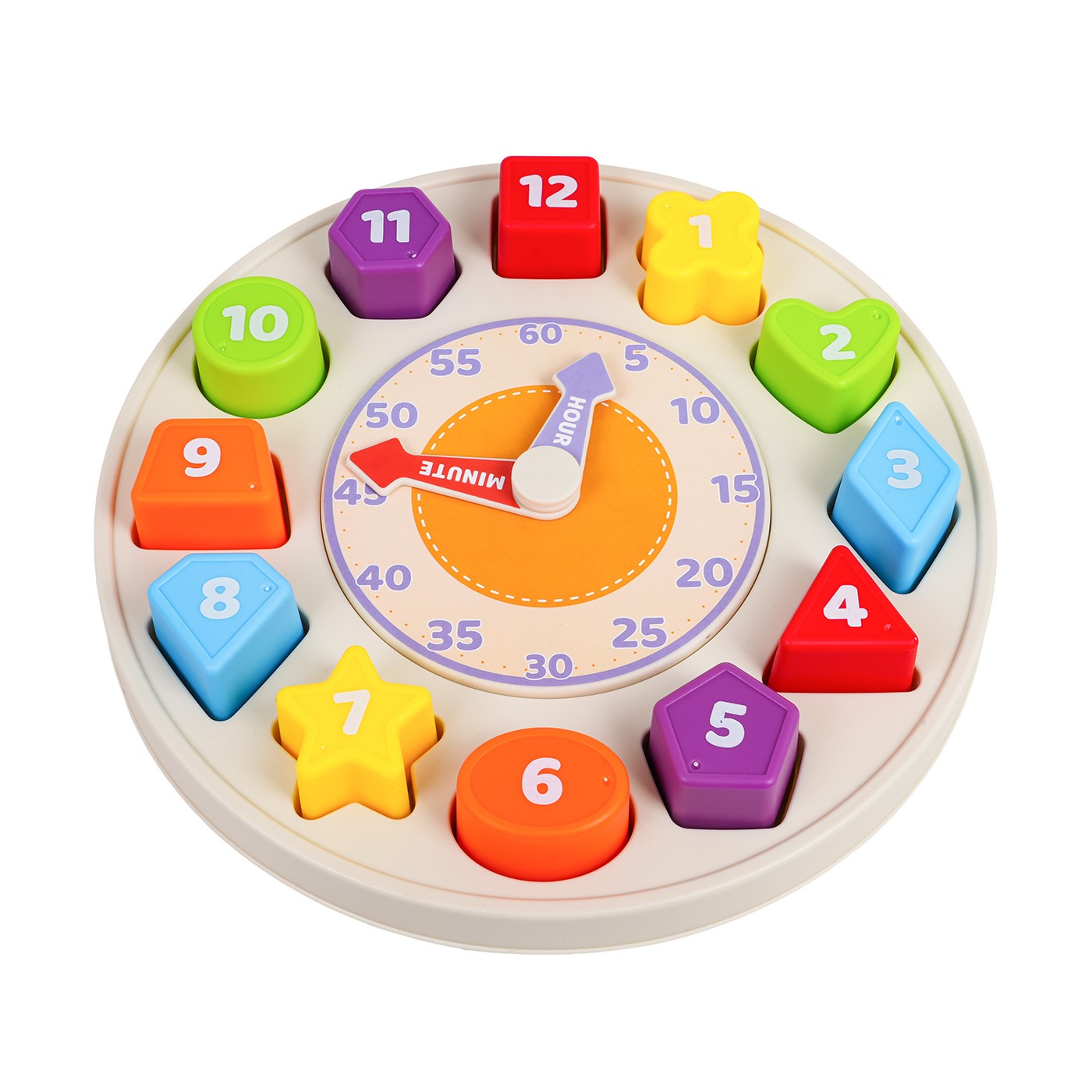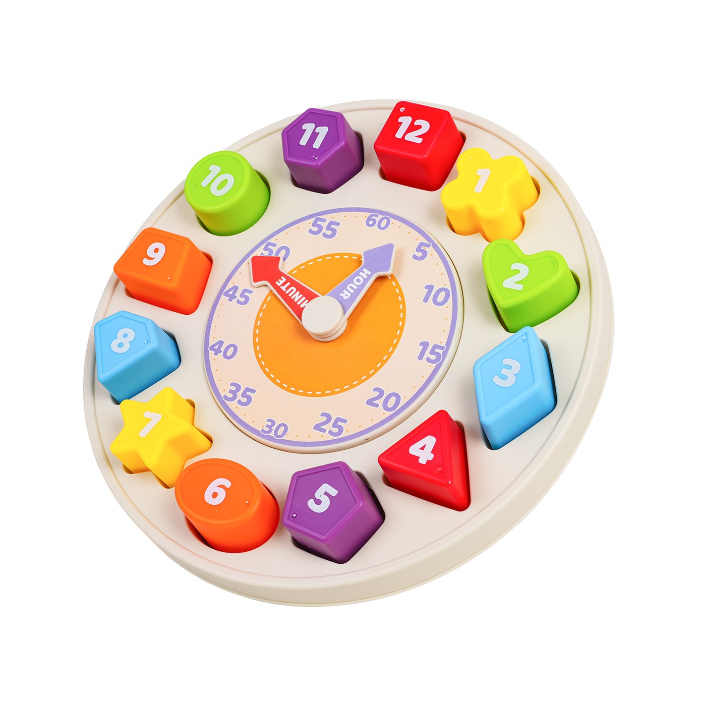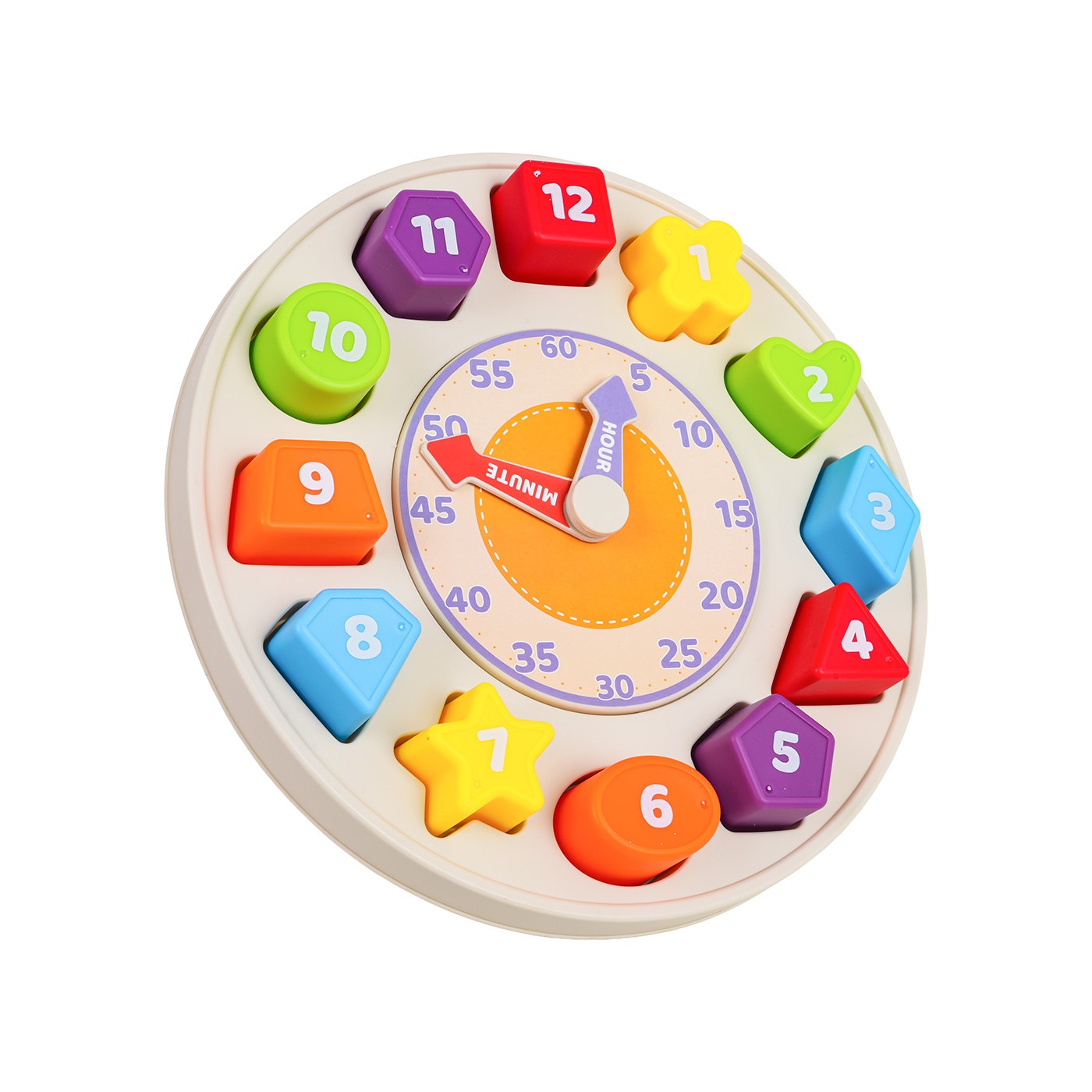 Dziecko może dopasowywać kształty, ćwicząc precyzję i spostrzegawczość, a ruchome wskazówki umożliwiają zabawę w ustawianie godzin. Z tyłu zabawki umieszczono zawieszkę, dzięki której zegar może być również elementem dekoracyjnym na ścianie w pokoju dziecka.